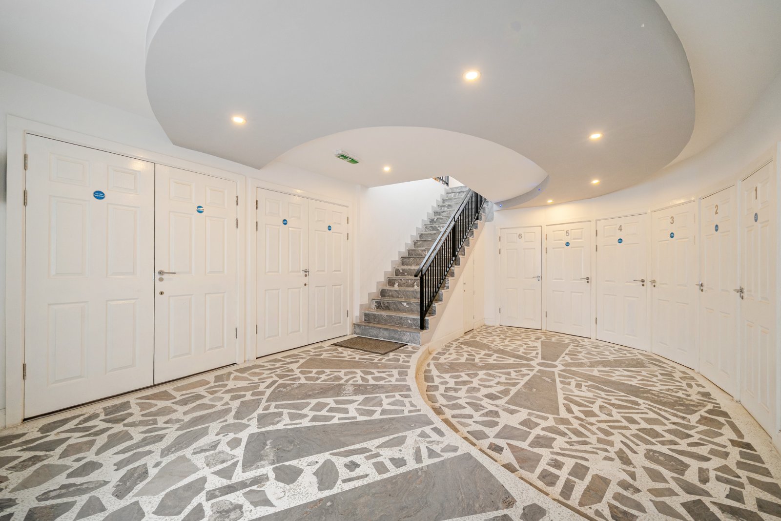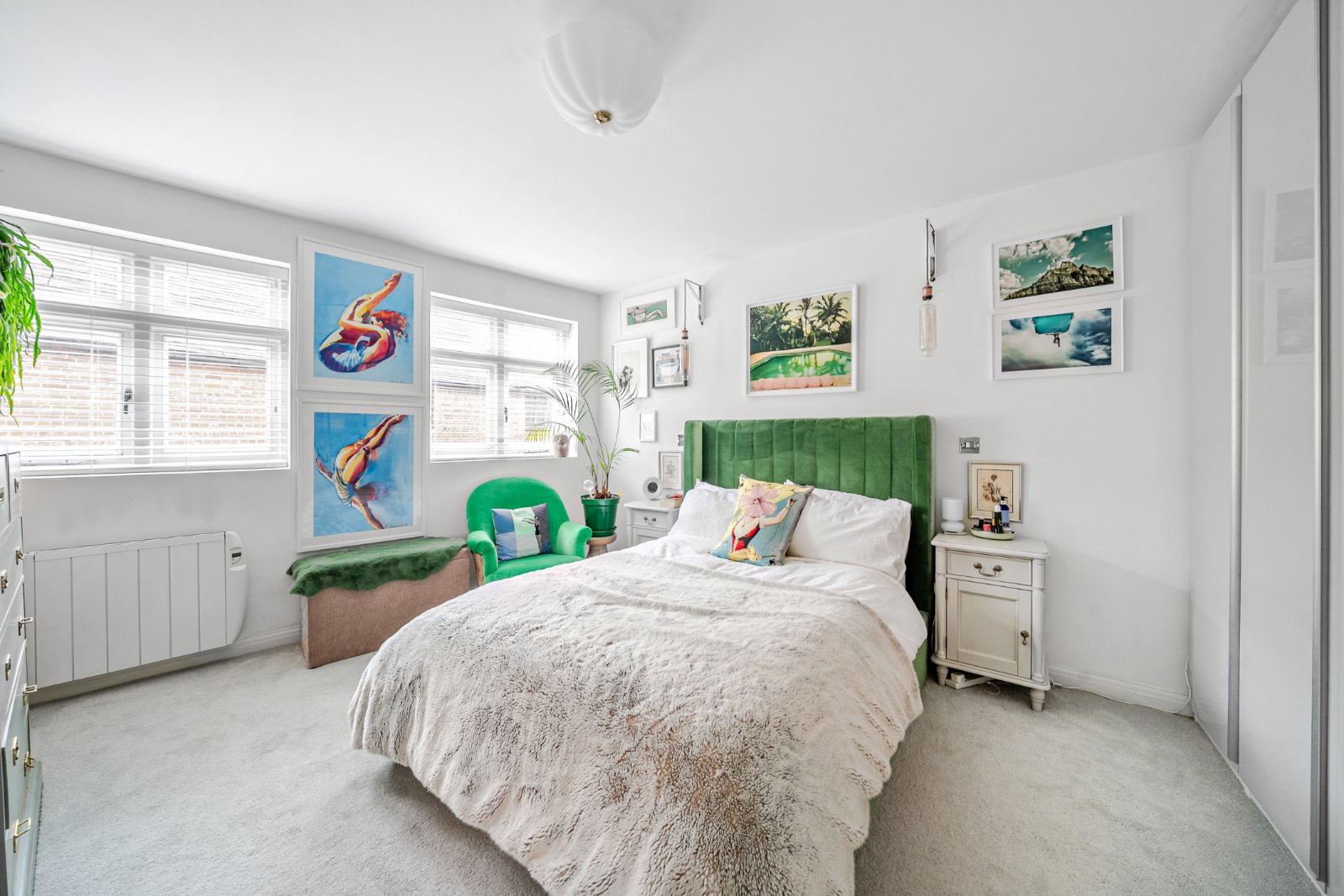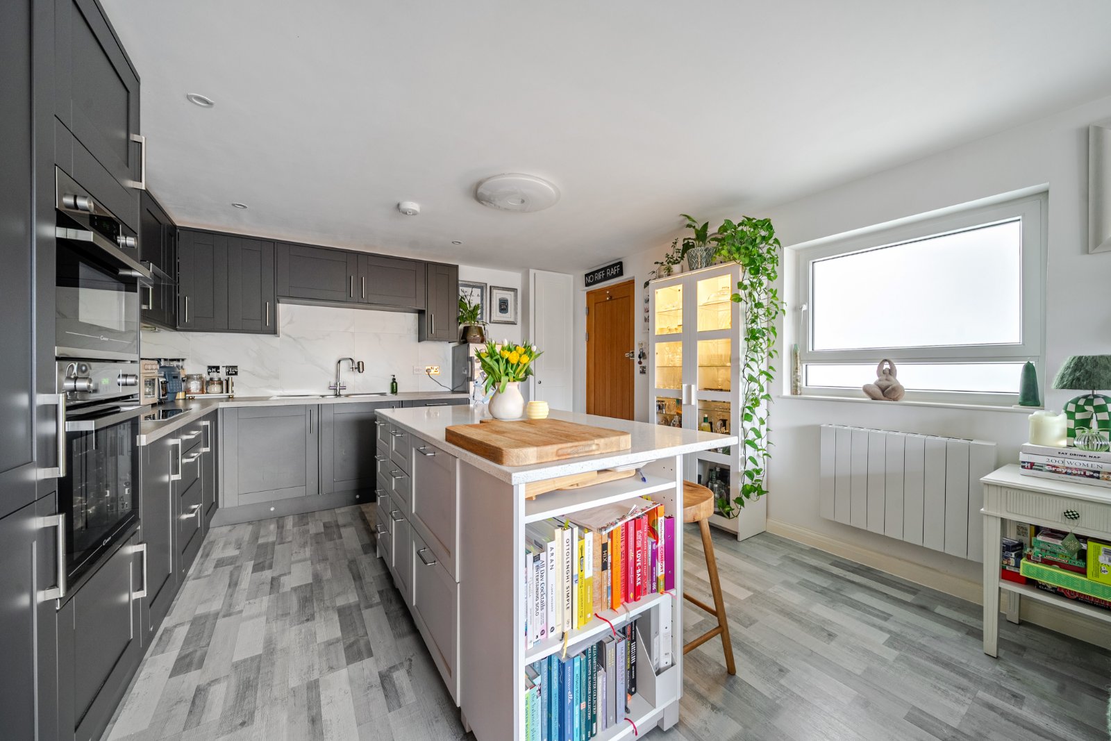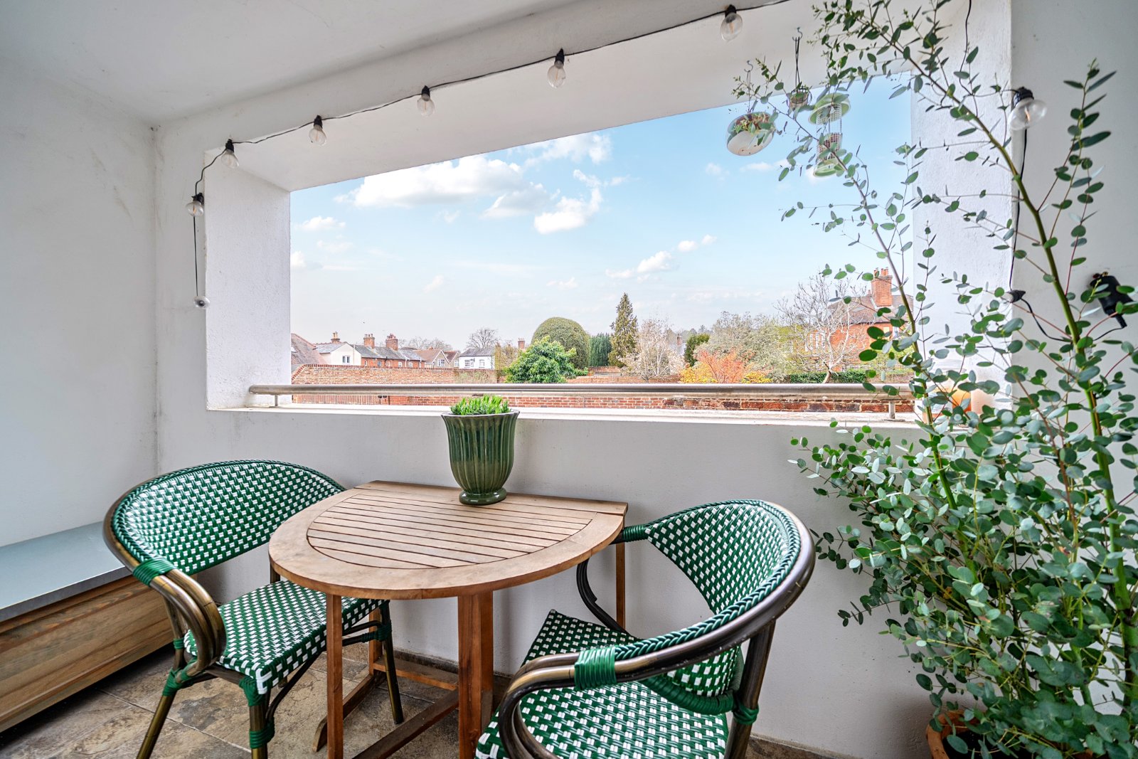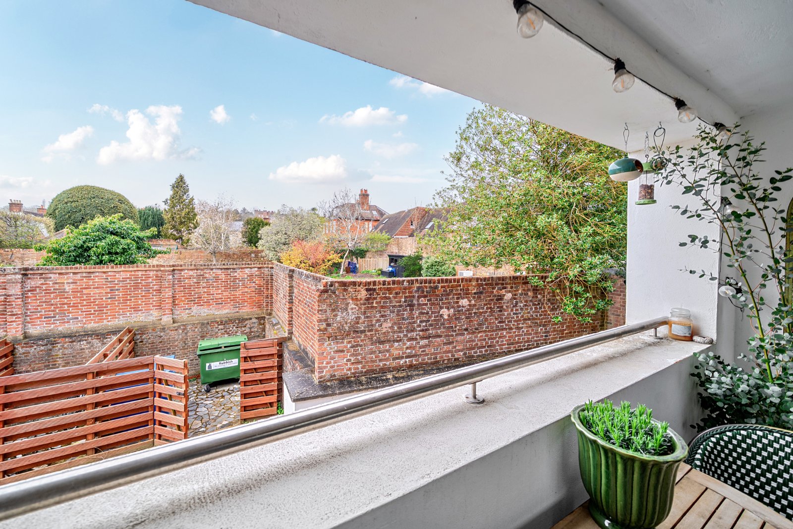 Upon arrival, you are welcomed by a spacious communal hallway which features a dedicated private storage cupboard for the apartment’s exclusive use. A charming staircase leads you to the first floor, where the private entrance to this light-filled home awaits. The heart of the property is an expansive open-plan kitchen, dining, and sitting area designed for both sophisticated entertaining and comfortable relaxation. At the heart of the kitchen sits an island, designed to elevate both style and functionality. Offering generous workspace it features a sleek countertop ideal for meal preparation, casual dining, or entertaining guests. This space is bathed in natural light thanks to its rear-facing aspect over delightful adjoining walled gardens. Sliding doors seamlessly connect the interior to a private balcony, providing a tranquil outdoor retreat with a remarkable view of Farnham Castle presiding over the hilltop.