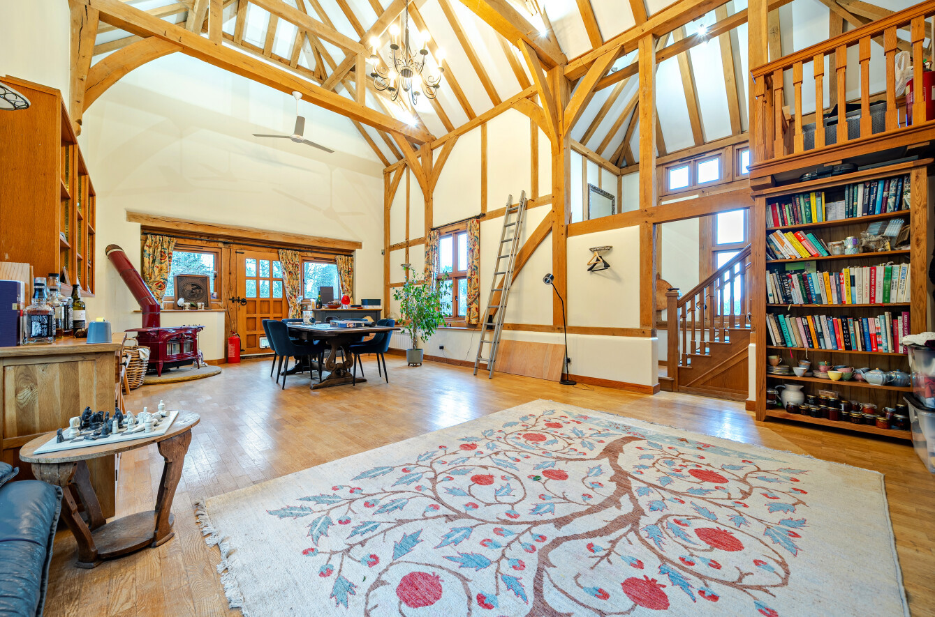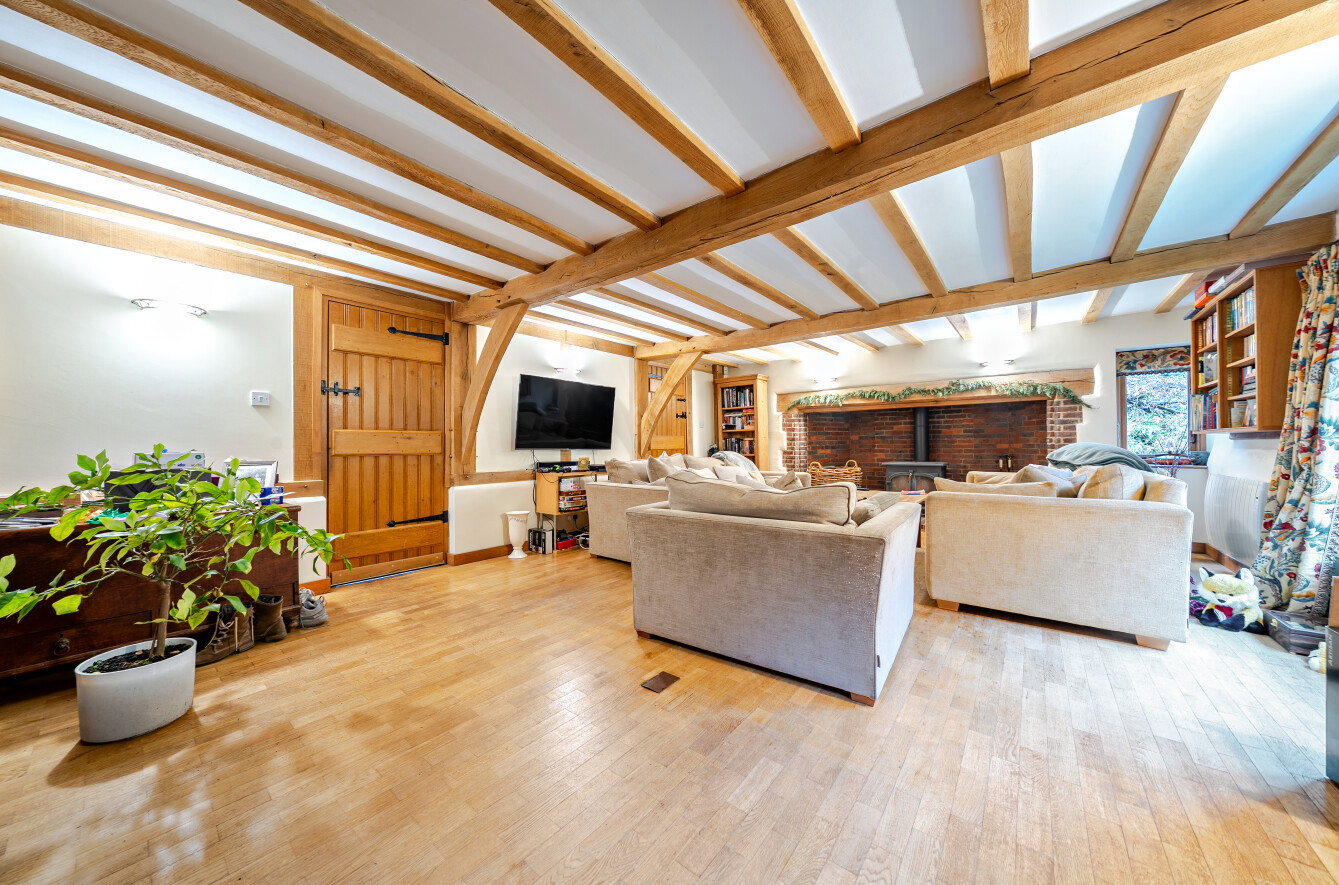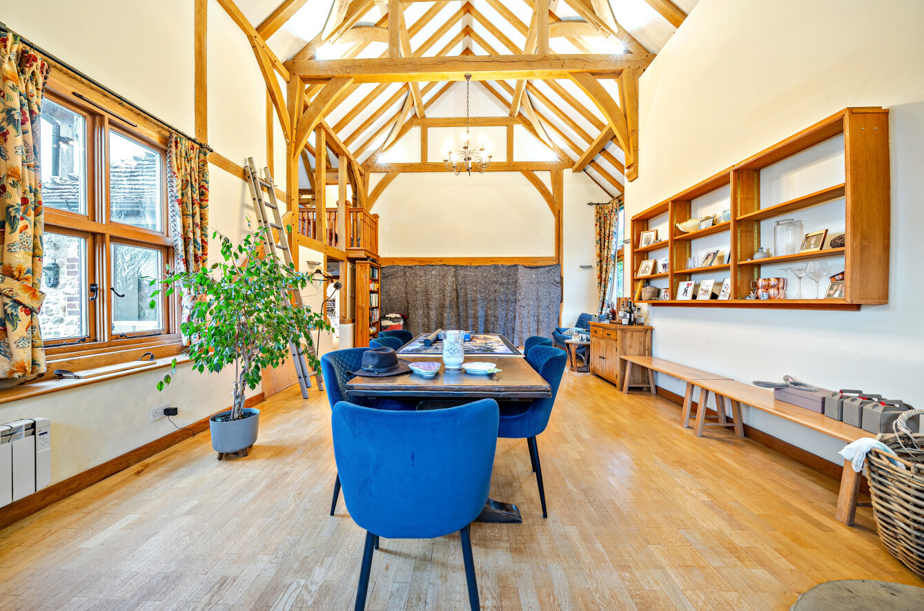 At the heart of the property lies a magnificent 48-ft vaulted reception room, where exposed beams, a striking inglenook fireplace, and a secondary log burner come together to form a truly exceptional space. Doors open directly onto the rear garden, allowing for a seamless connection between the comfort of the indoors and the tranquillity of the outdoors.