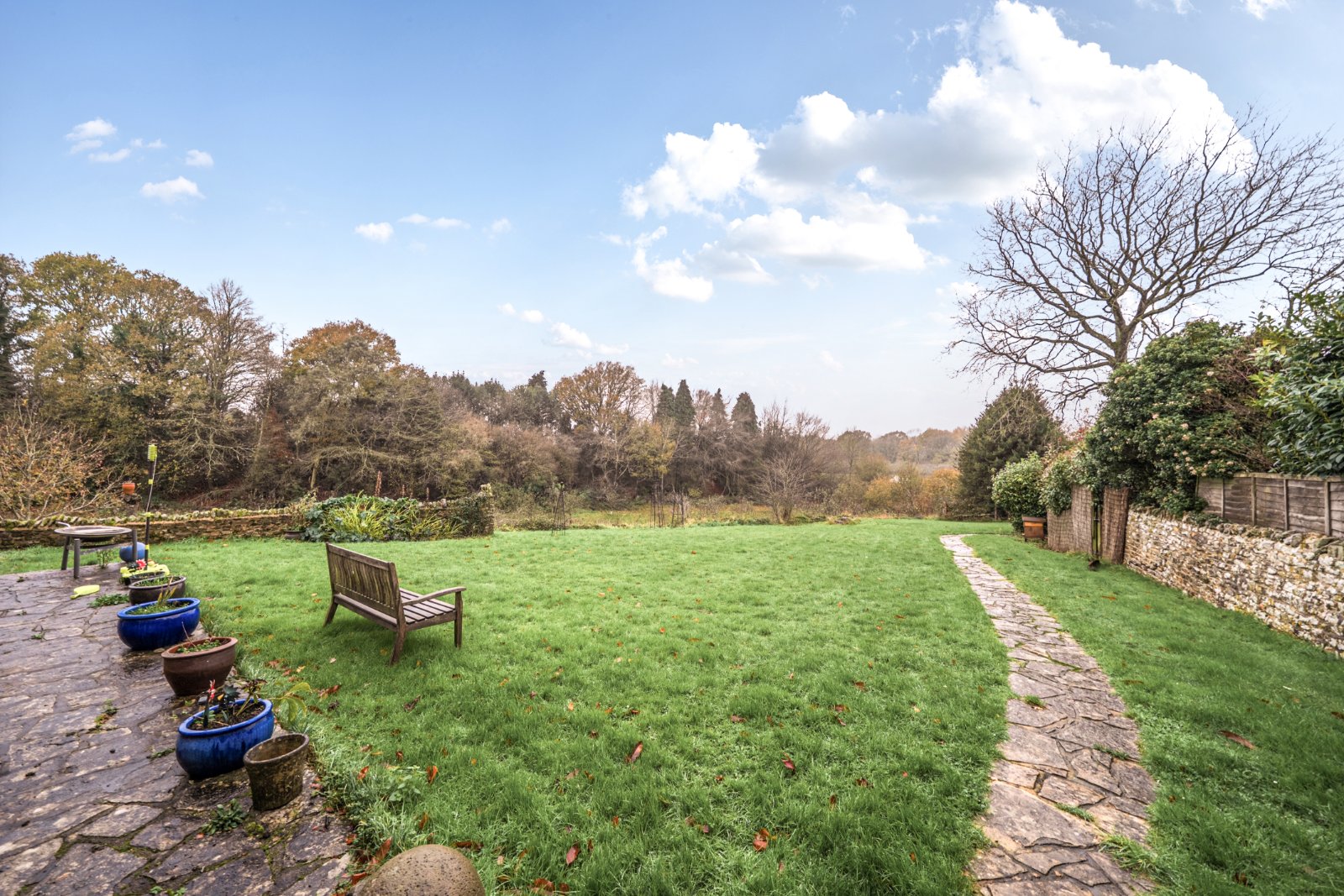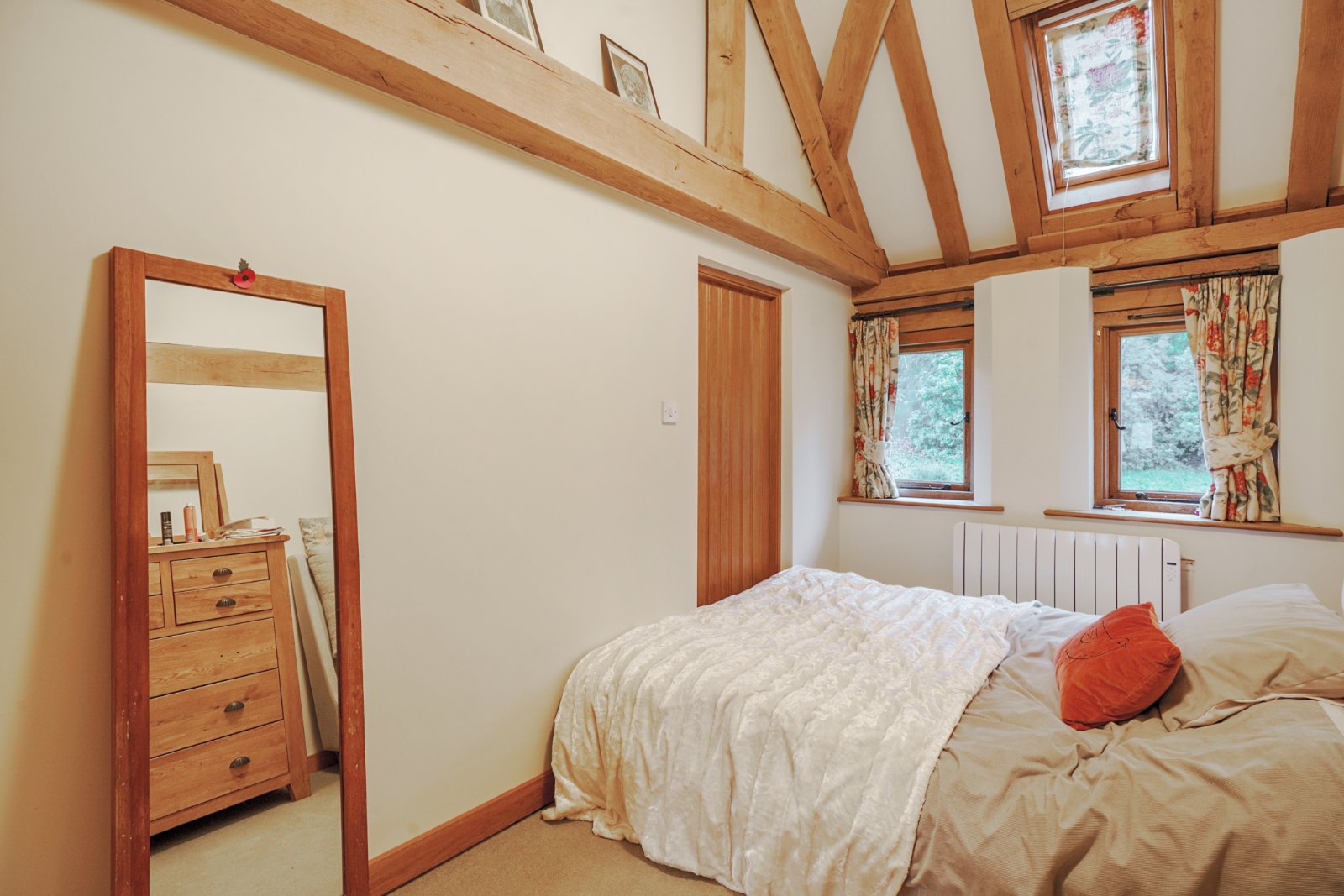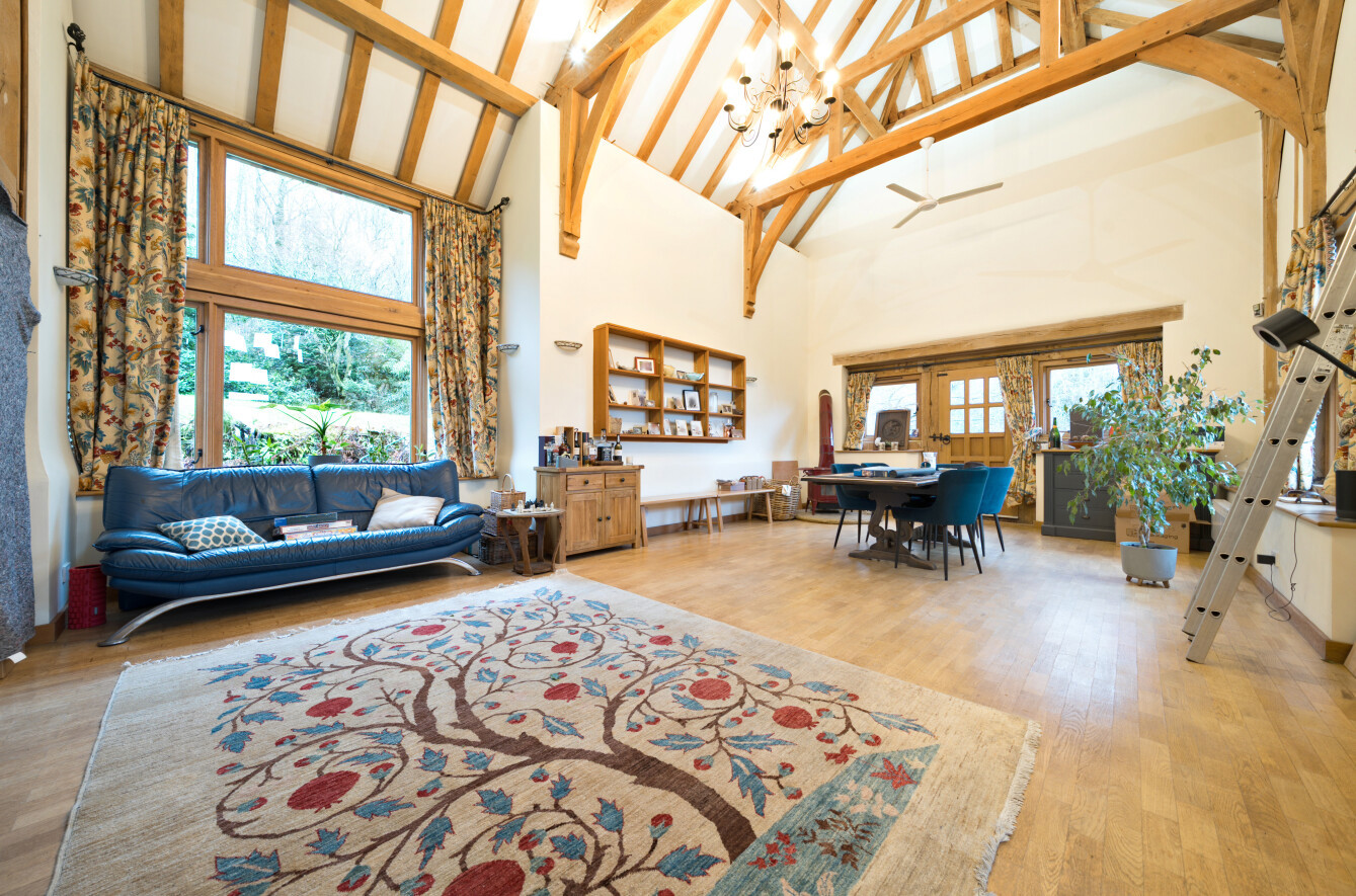 At the heart of the property lies a magnificent 48-ft vaulted reception room, where exposed beams, a striking inglenook fireplace, and a secondary log burner come together to form a truly exceptional space. Doors open directly onto the rear garden, allowing for a seamless connection between the comfort of the indoors and the tranquillity of the outdoors.