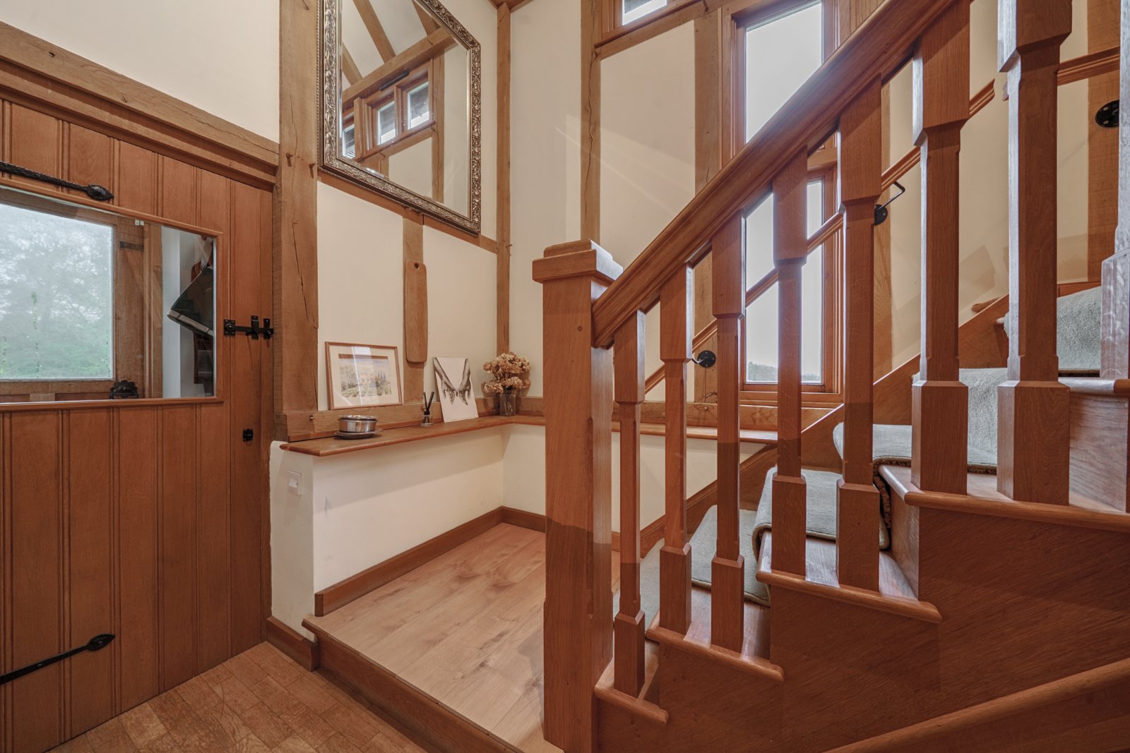 Upstairs, a dramatic galleried landing serves as an additional reception area, ideal as a reading nook, sitting area, or study. From here, you’ll find the generous principal bedroom along with three further well-sized bedrooms. A family bathroom and a separate shower room provide modern convenience and style.