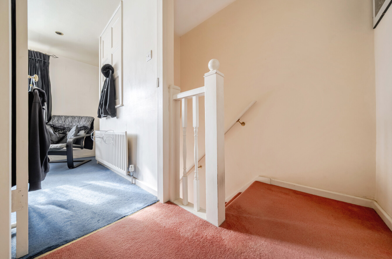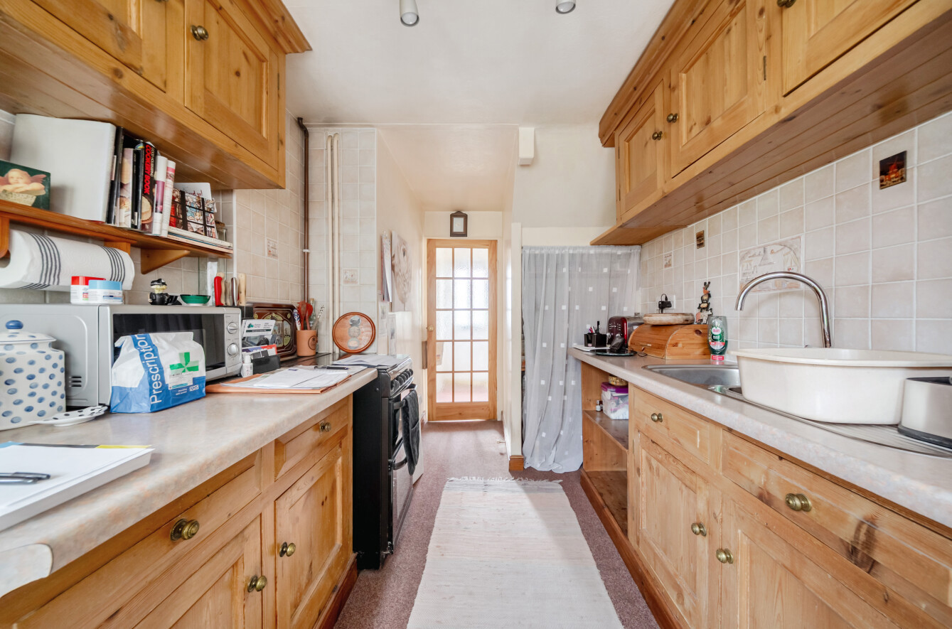 The ground floor layout consists of a galley kitchen that connects to a rear utility/and an additional store, providing a solid foundation for reconfiguration or modernization. The sitting and dining room features a front-to-rear aspect, creating a bright and sociable environment that could be further enhanced with contemporary finishes. Upstairs, the two bedrooms are served by a bathroom that has previously been re-fitted, and the property already benefits from modern double-glazed windows.