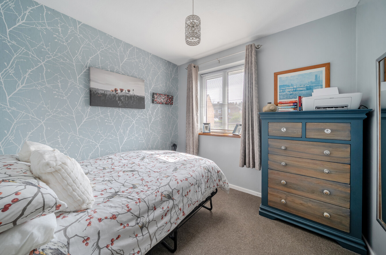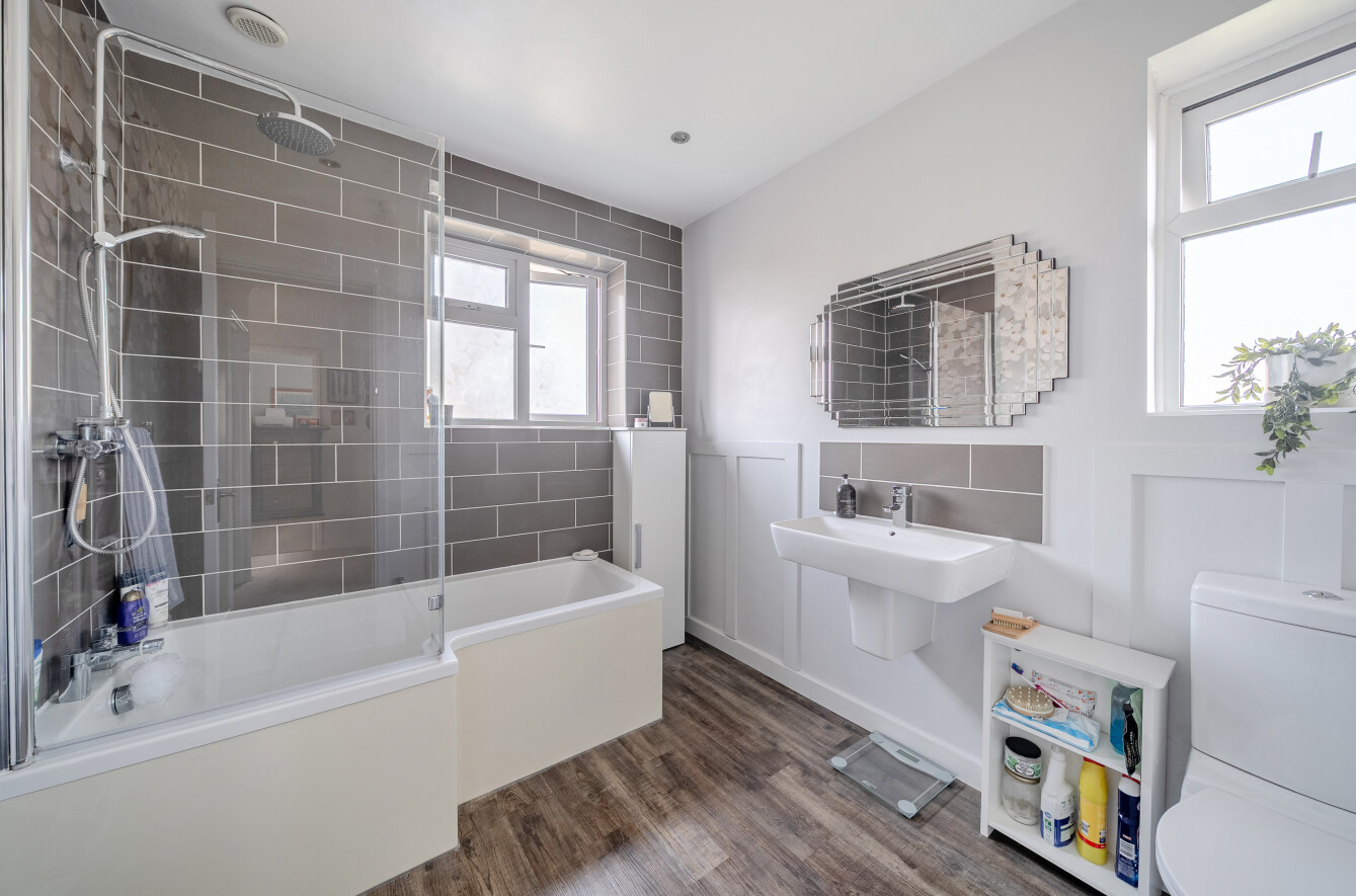 The upper floor comprises three generously proportioned double bedrooms, ensuring no compromise on space. Two of these rooms feature built-in wardrobes for streamlined storage, and all are served by a modern family bathroom equipped with a polished three-piece suite and an overhead shower.