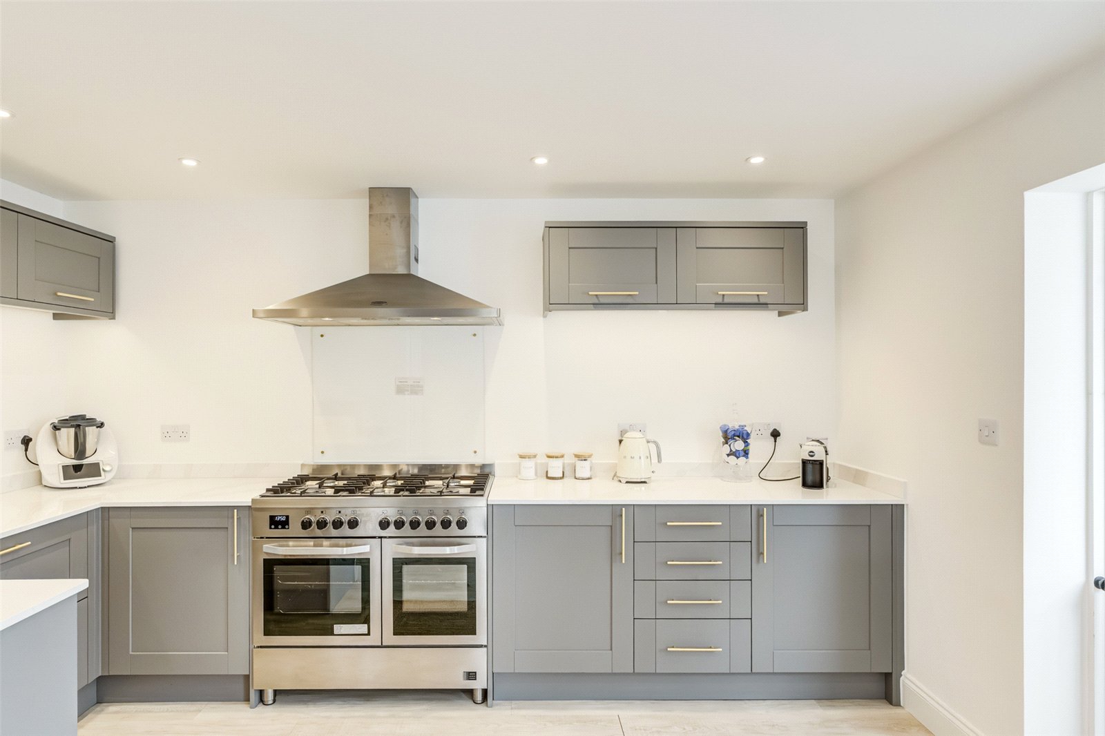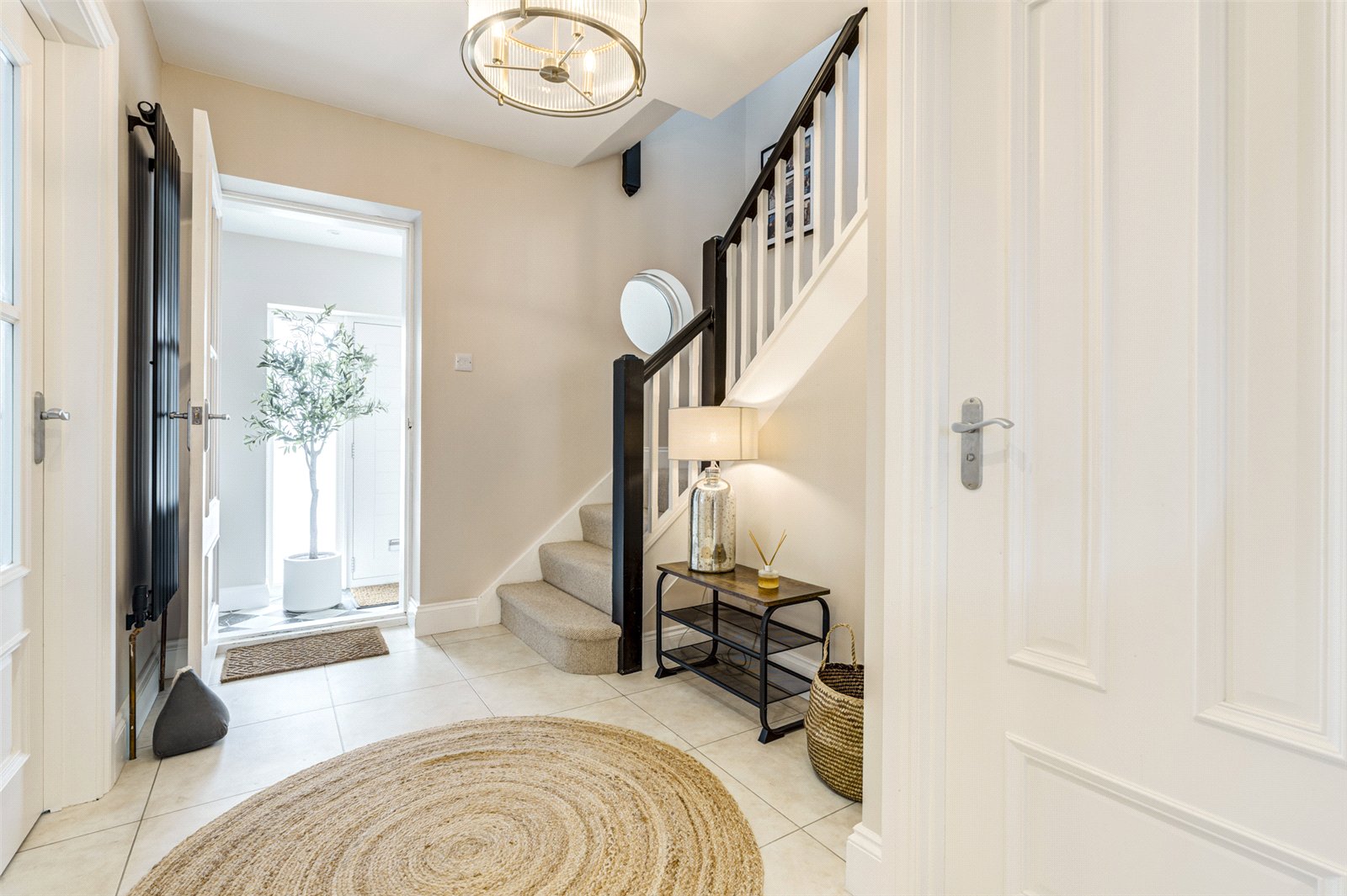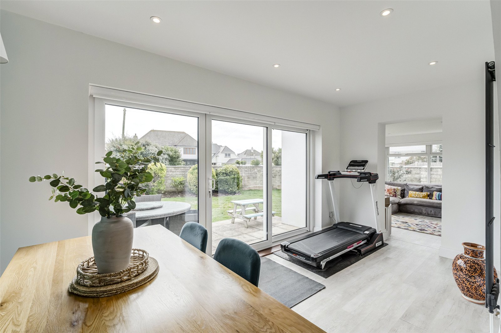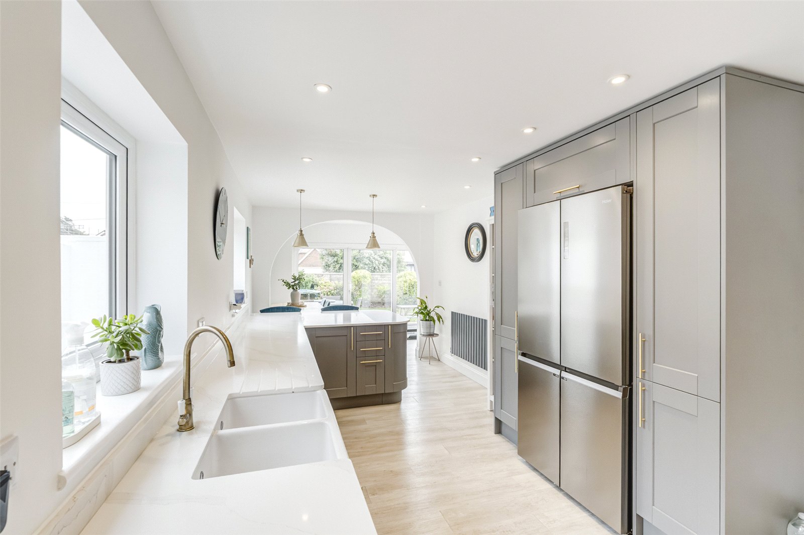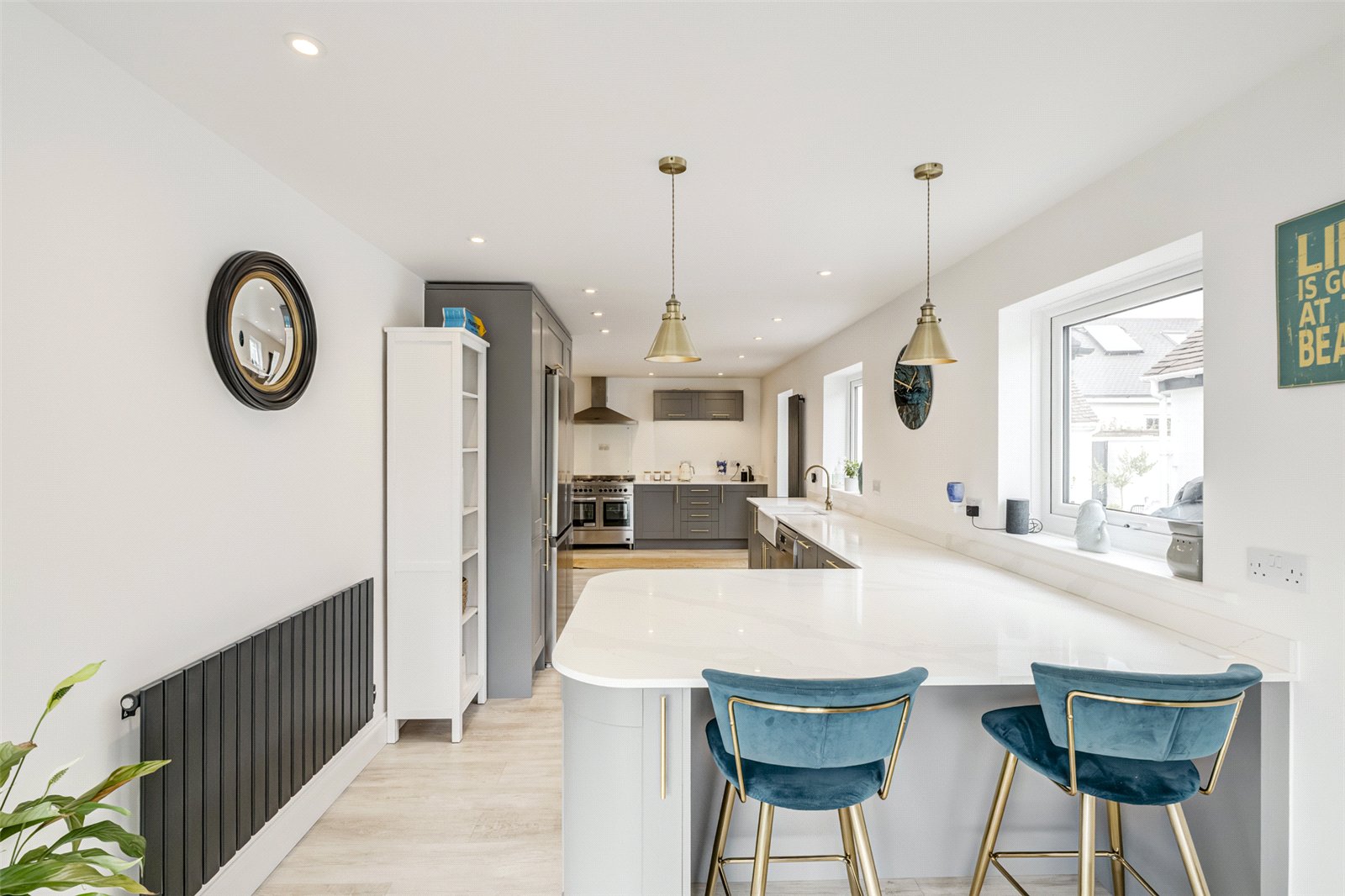 The main door takes you into a lobby and on into a spacious reception hall where there are stairs to the first floor and a convenient cloakroom. Immaculately presented throughout there are three reception rooms; a large lounge with a wall mounted electric fireplace and access into two family rooms. Both of these areas have sliding glazed doors leading out to a paved patio which runs the depth of this exceptional property. One of the family rooms also leads directly into the kitchen offering an ideal dining area. The kitchen itself is an elegant and integrated contemporary room. With an abundance and comprehensive array of stylish minimalistic wall and floor units and plenty of worksurfaces this skilfully designed area has a free standing range cooker and a door into a dedicated utility room which has access into a rear courtyard.