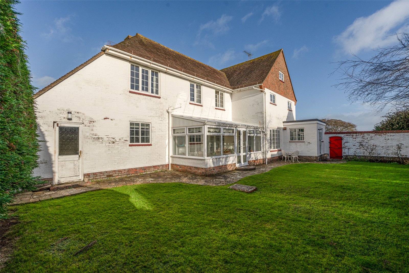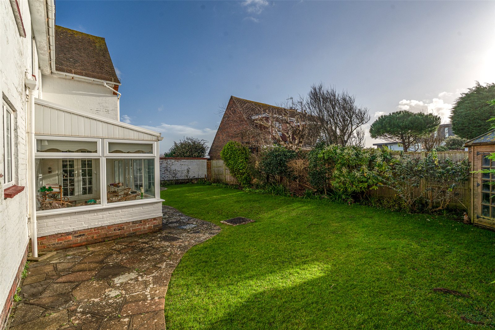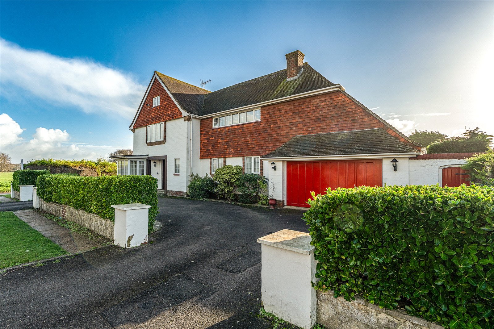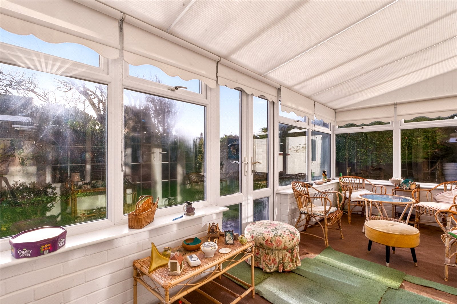 Outside mature hedges give privacy from the road whilst the ’in/out’ drive offers easy parking for multicar vehicles and access to a double garage. The enclosed rear south facing garden is laid to lawn with established hedges and shrub borders, a patio and access into the sunroom, a door into the garage and a side gate to an appealing side garden which is again mainly grass with mature planted borders.