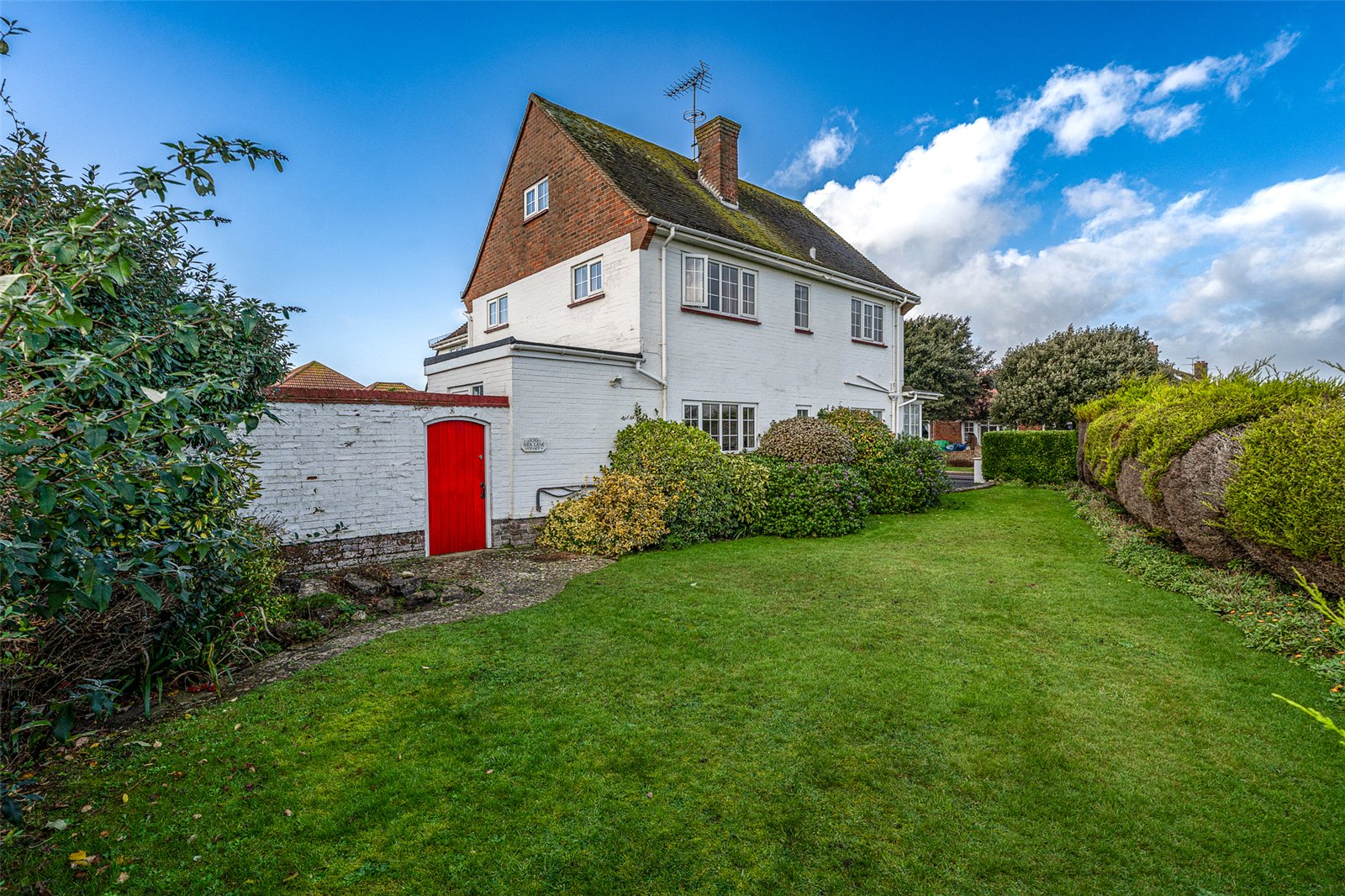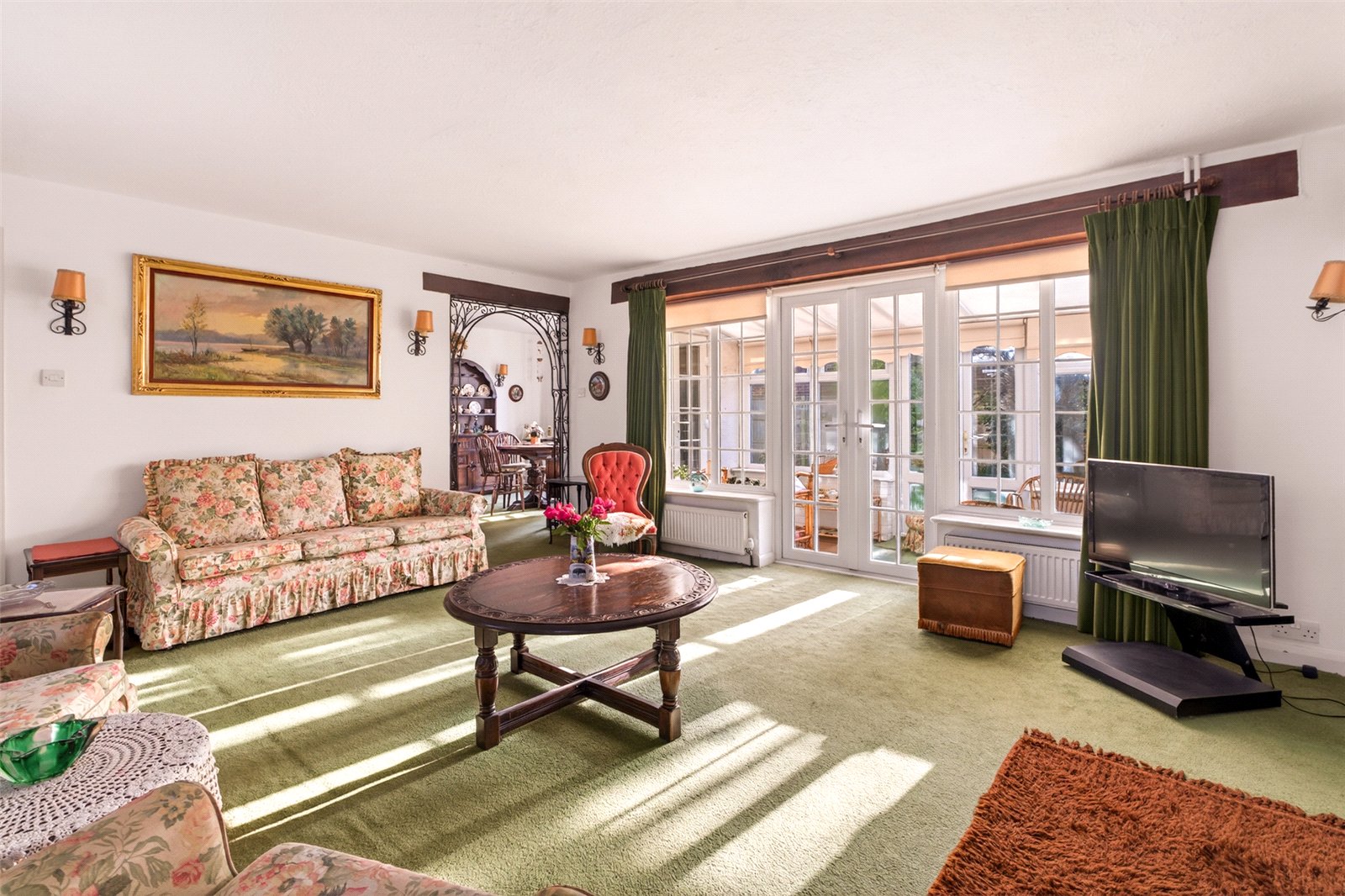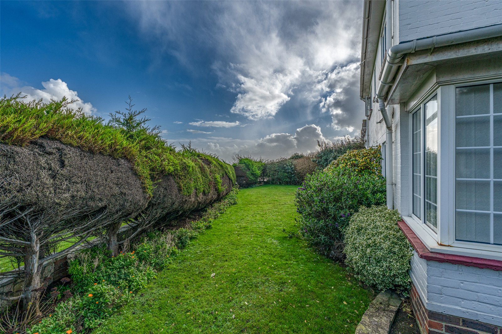 Outside mature hedges give privacy from the road whilst the ’in/out’ drive offers easy parking for multicar vehicles and access to a double garage. The enclosed rear south facing garden is laid to lawn with established hedges and shrub borders, a patio and access into the sunroom, a door into the garage and a side gate to an appealing side garden which is again mainly grass with mature planted borders.