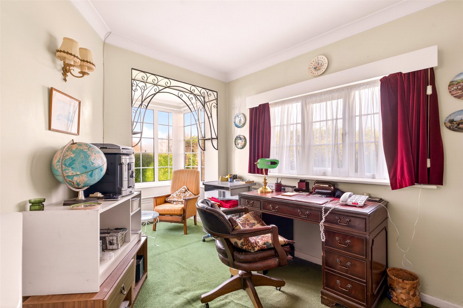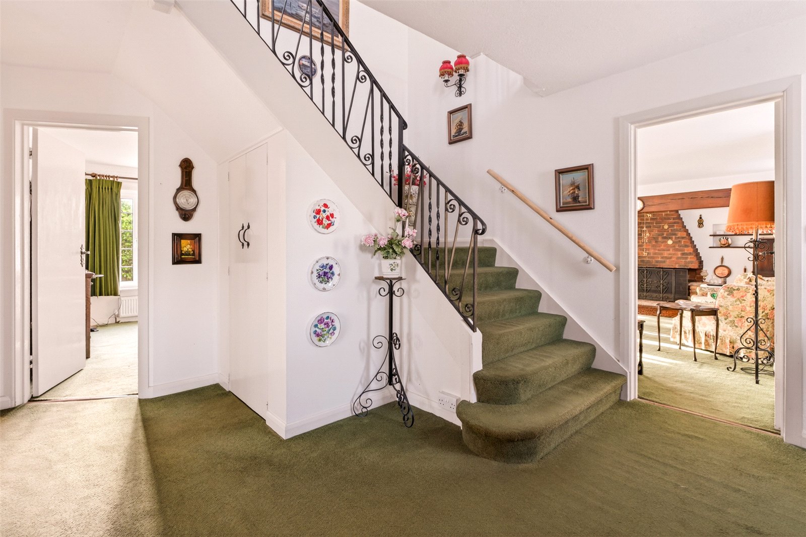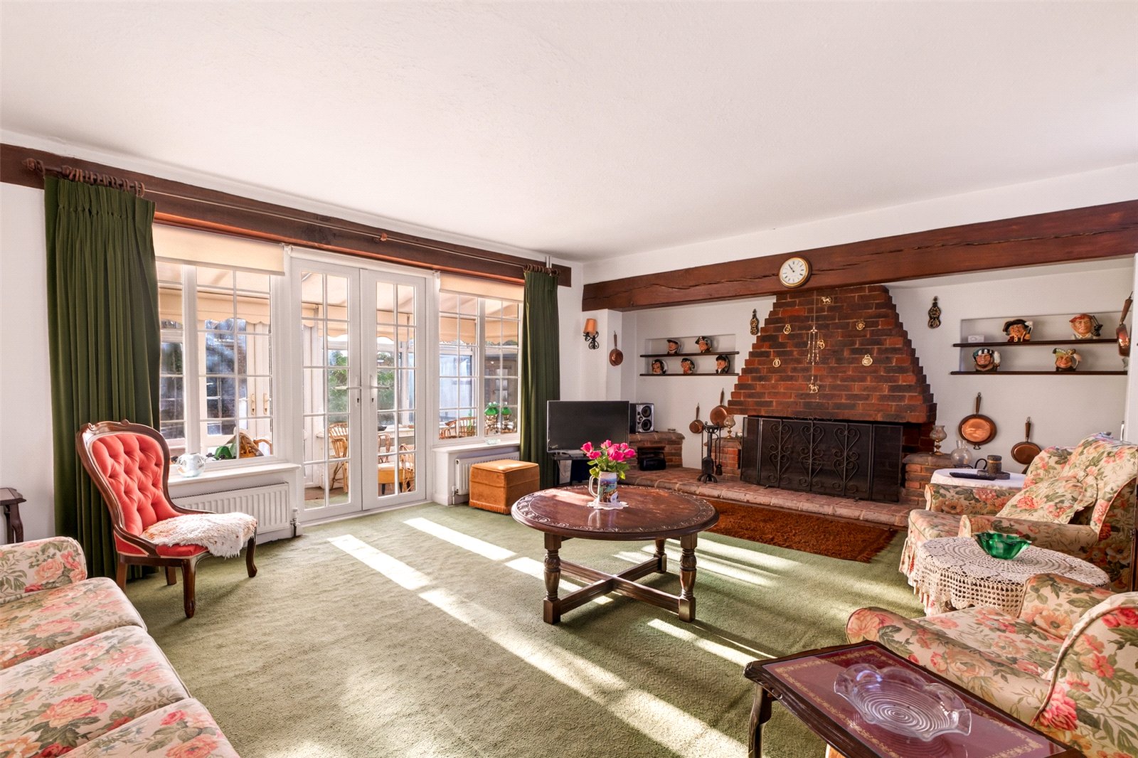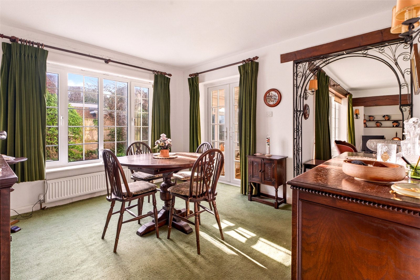 Outside mature hedges give privacy from the road whilst the ’in/out’ drive offers easy parking for multicar vehicles and access to a double garage. The enclosed rear south facing garden is laid to lawn with established hedges and shrub borders, a patio and access into the sunroom, a door into the garage and a side gate to an appealing side garden which is again mainly grass with mature planted borders.