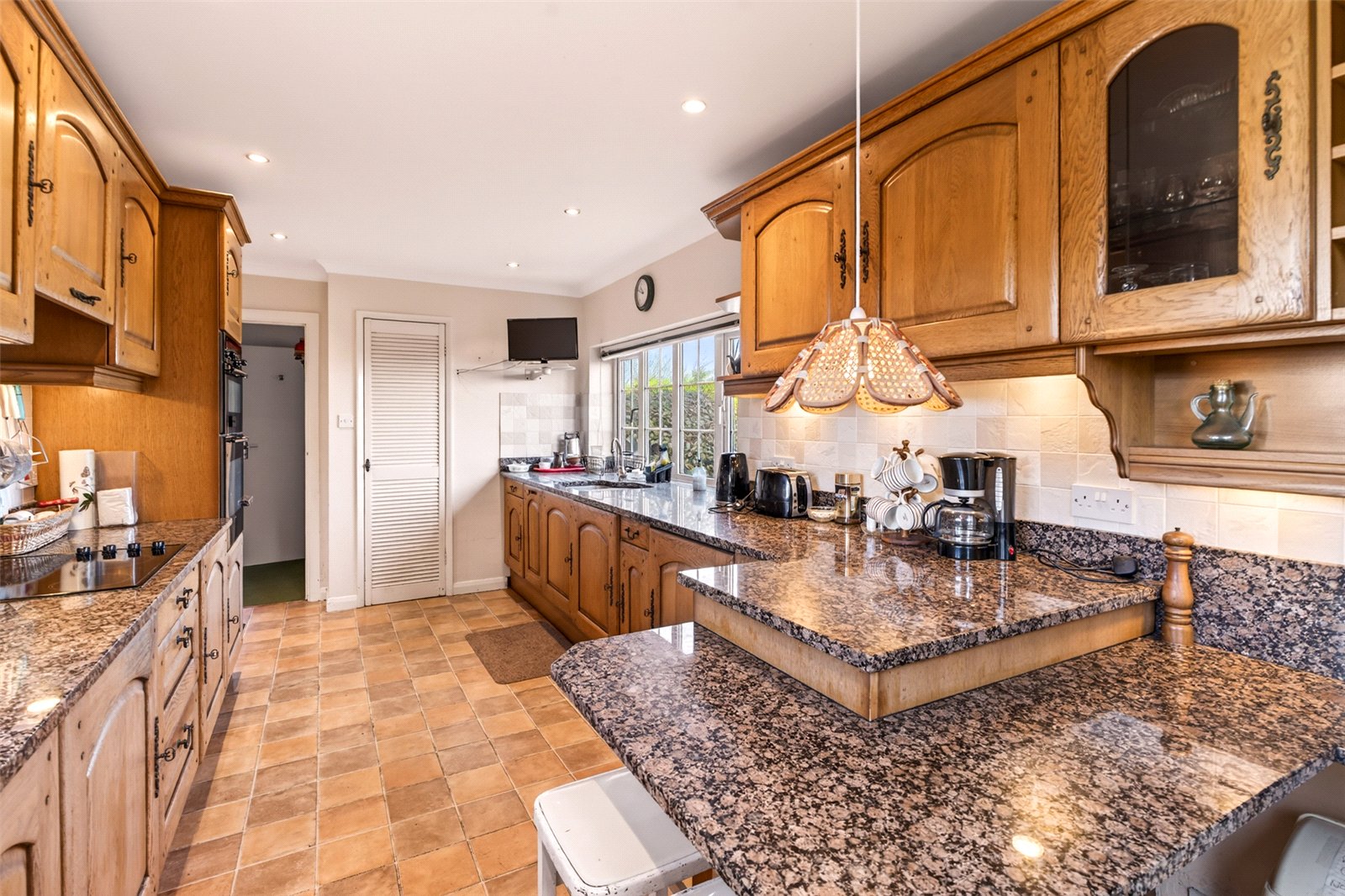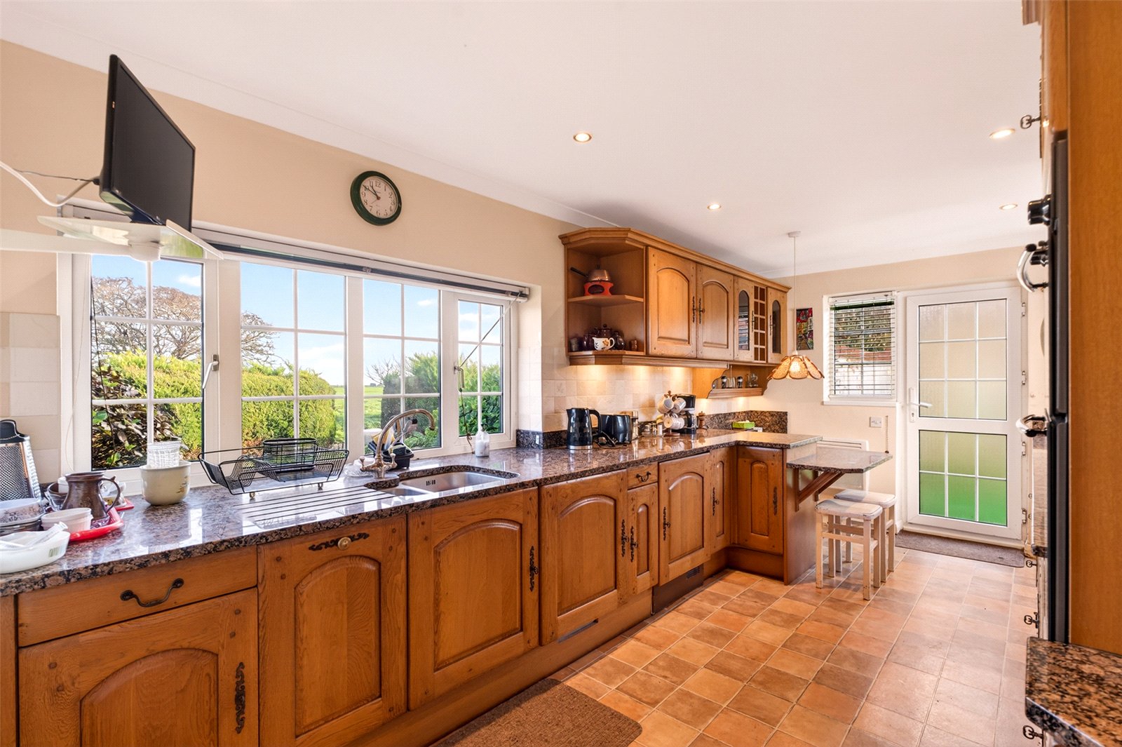 A covered porch leads into a large reception hall which has a useful storage cupboard. The ground floor has a double aspect room currently utilised as a study but which could easily be a bedroom if required as there is a shower room next door. To the rear is a spacious kitchen with garden views which has plenty of cupboards and drawers and attractive granite worksurfaces incorporating a peninsula island and breakfast bar. This well designed integrated area has an under counter fridge, separate freezer and NEFF appliances including a double wall oven and counter hob. Tumble dryer, washing machine and door to the rear south facing garden. Adjacent the dining room has ample room for furnishings, direct access into the lounge and French doors leading into a charming sunroom. The lounge is an expansive room which has an impressive inglenook fireplace extending along the depth of the west wall. This elegant space, as with the dining area, has an abundance of natural light coming in through wide windows which include a further set of French doors again leading into the sunroom allowing an easy ‘flow’ between the three rooms whilst offering privacy when desired.