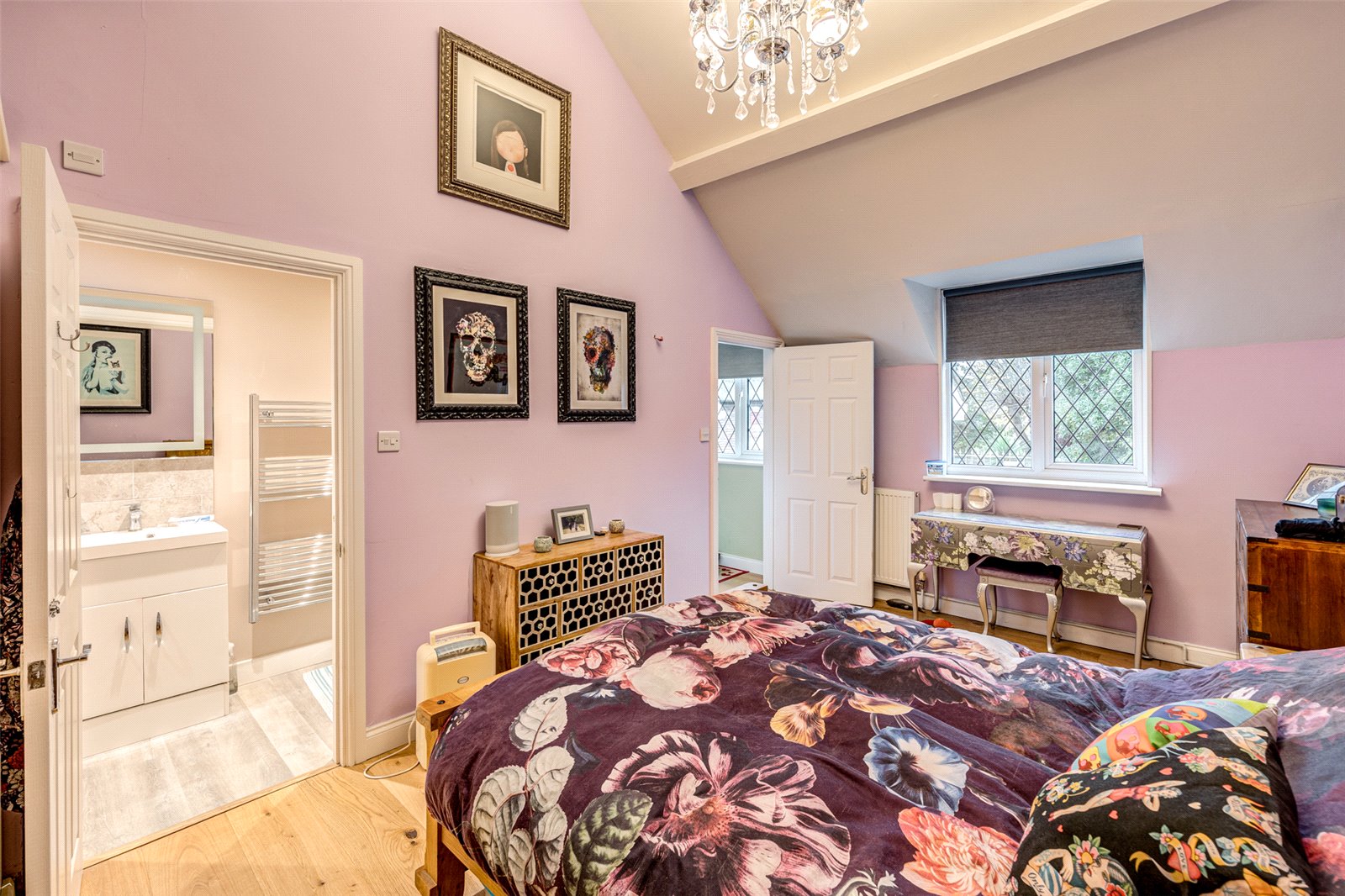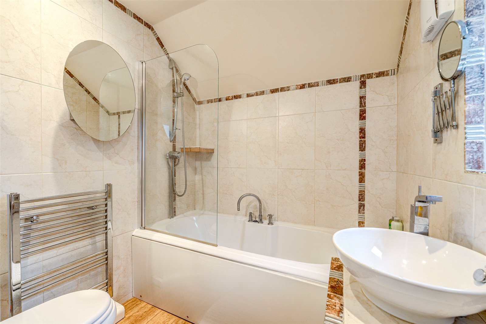 A flight of stairs leads up to a good-sized landing which has further storage. There are two double bedrooms. The main has an attractive vaulted ceiling, plenty of fitted wardrobes and a modern ensuite shower room. A contemporary family bathroom with a shower over the bath makes up the rest of the accommodation.