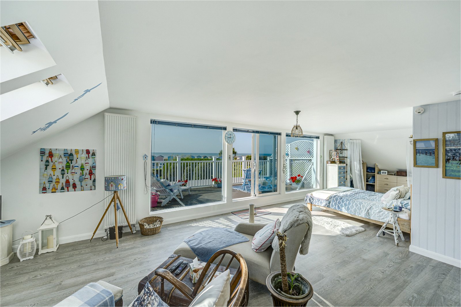 Upstairs the main bedroom suite occupies the whole of the first floor and includes a walk in wardrobe, contemporary ensuite with walk in shower, and lounge area. Natural light streams in through Velux windows and the large windows with sliding door out on to the balcony; a wonderful area for relaxing and enjoying the garden and superb panoramic sea views.