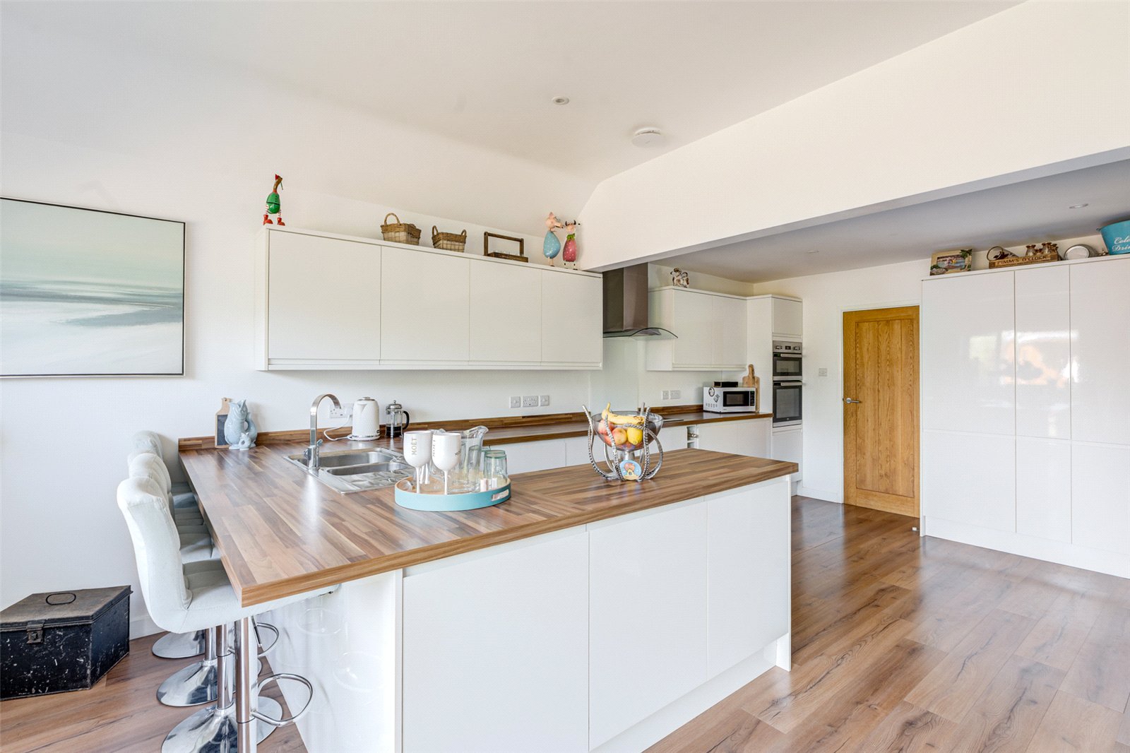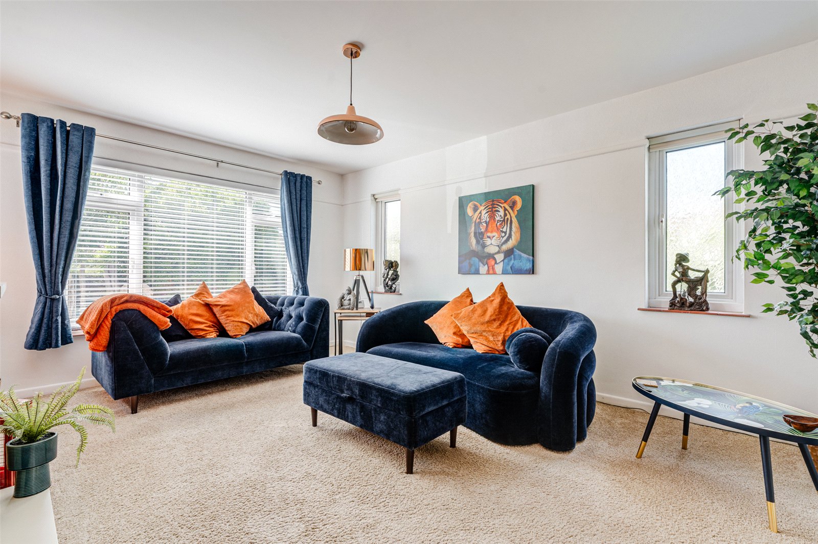 The main door opens into a reception hall off which all the accommodation is found. There are three double bedrooms. Two look out over an attractive front garden whilst the main, which has a modern ensuite shower room, has views to the rear. There is a spacious triple aspect lounge which has a stylish electric fireplace and again appealing views over the southerly facing front garden. A door takes you through into a further reception room. Currently utilised as a dining room there are sliding glazed doors leading out to a paved path and into the rear garden. Adjacent is a large open plan modern kitchen. This well-designed space has a comprehensive range of drawers, cupboards and worksurfaces and is fully integrated to include an electric hob and double wall oven; a fridge/freezer; washing machine; dishwasher and breakfast bar. A peninsula island tastefully and practically separates the kitchen from a welcoming seating area. Wide windows and a set of glazed French doors allow an abundance of natural light into this contemporary space and also the opportunity for indoor/outdoor living. A contemporary bathroom with a separate shower makes up the rest of the accommodation.