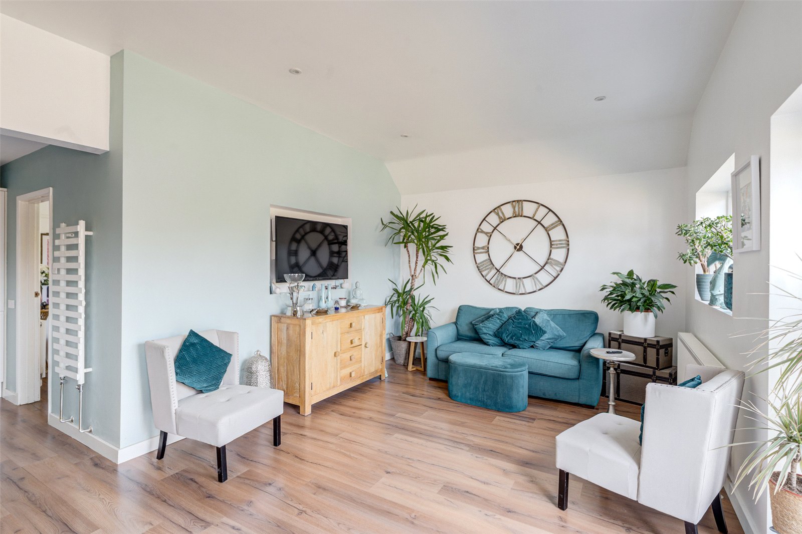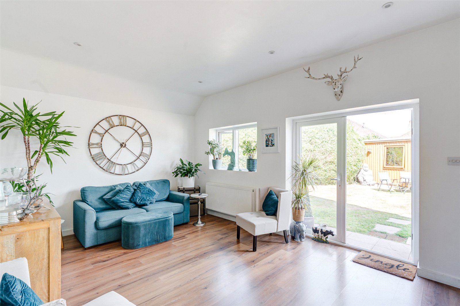 Outside this spacious property is surrounded by gardens. Laid to lawn, established hedges and trees, there is a detached garage and an expansive drive with room for multiple cars. In addition there is a decked area by the garage and a studio, currently set up as a gym, which has electricity, Wi-Fi and a sauna.