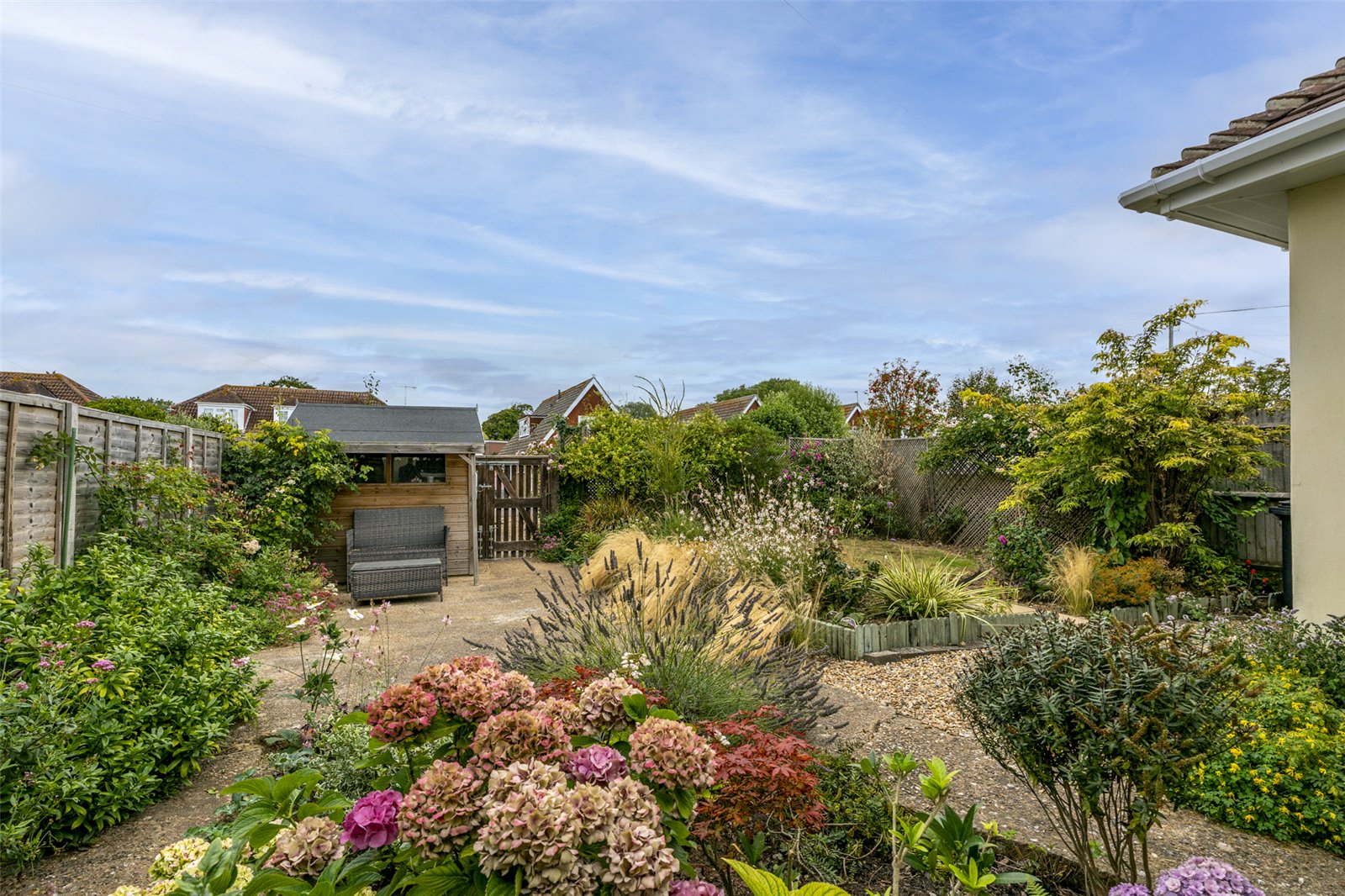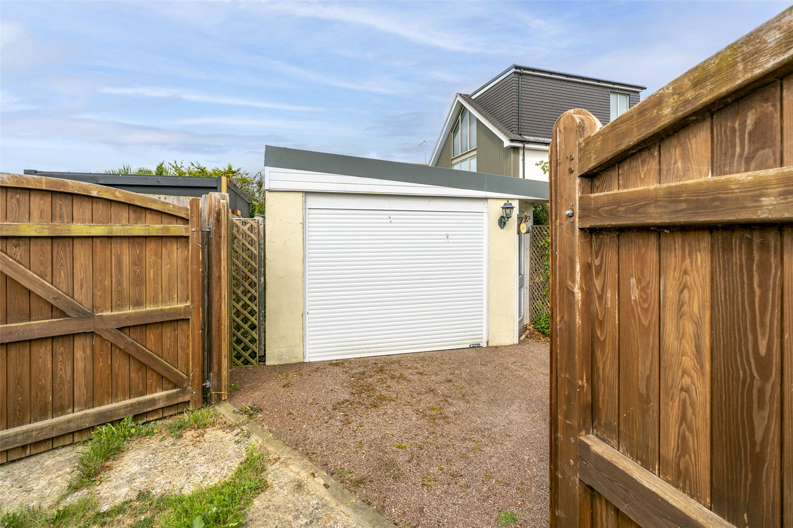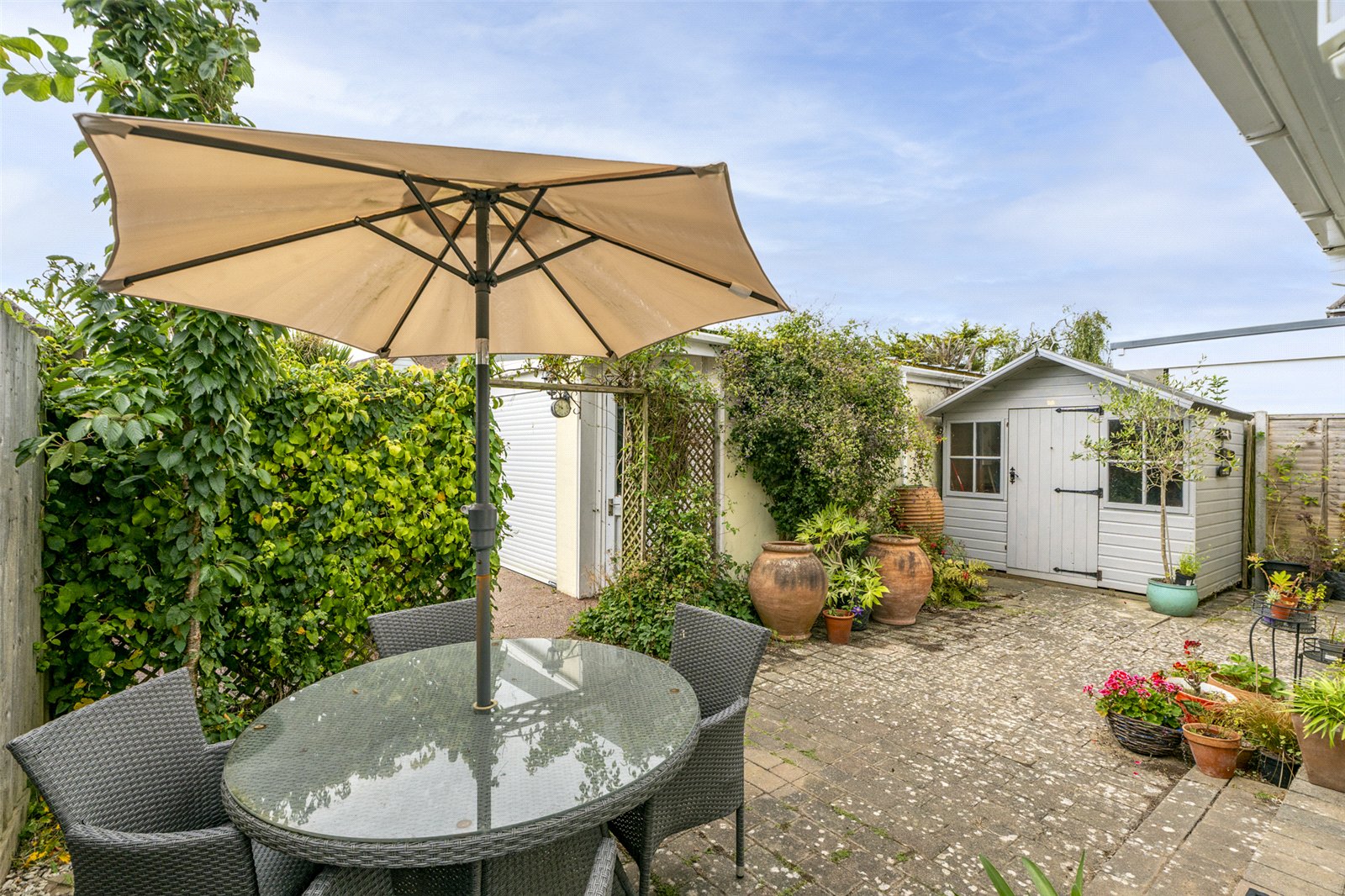 The front of this lovely bungalow has a wide multicar driveway and a lawned garden planted with a colourful array of flowers and shrubbery. There are two side paths to the rear that lead into the south facing courtyard where there is a wooden garden shed and ample room for garden furniture. Beyond is a very large garage with a roller electric door and useful electricity inside. A double gate leads out on to a private road.