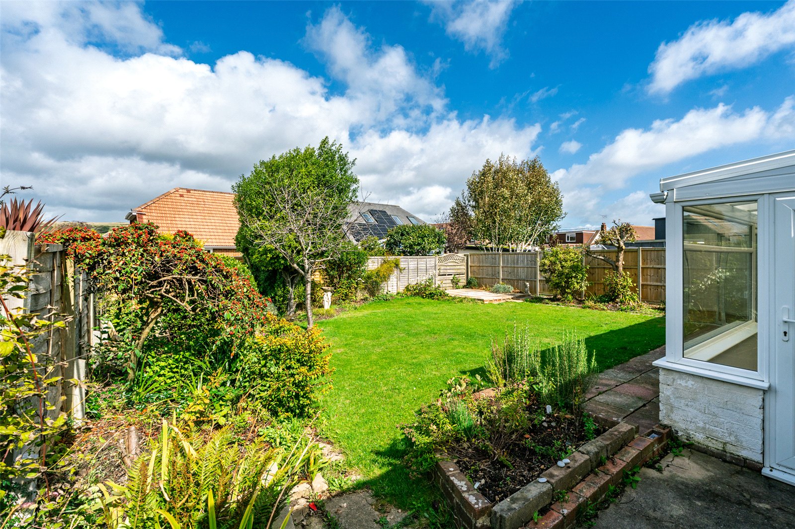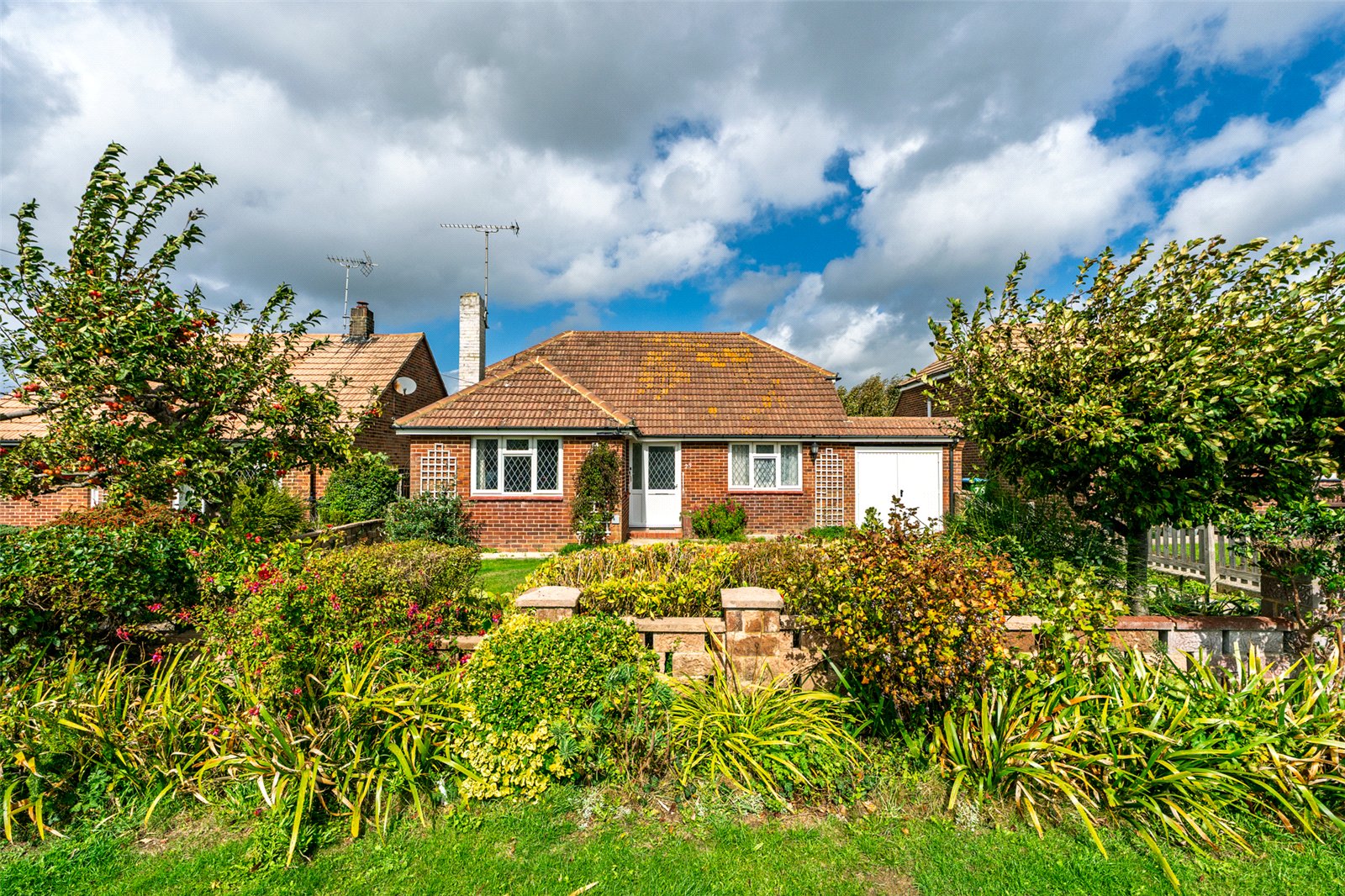 Outside the gardens are well maintained and laid mainly to lawn with established flowers, shrubs and trees. The rear garden has two patio areas and lovely views to the South Downs. A side path connects both gardens on one side and a driveway leads to the attached garage on the other.