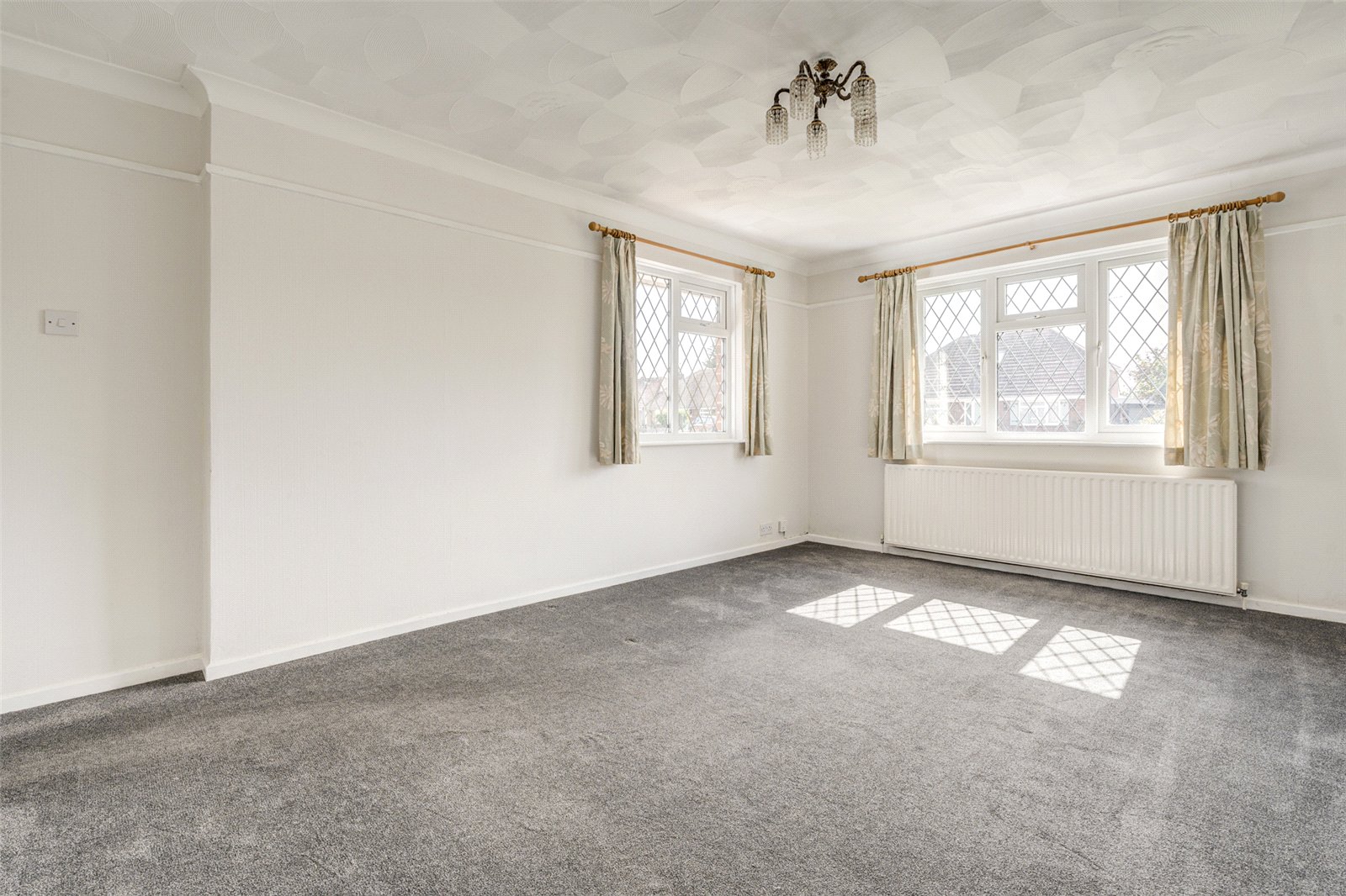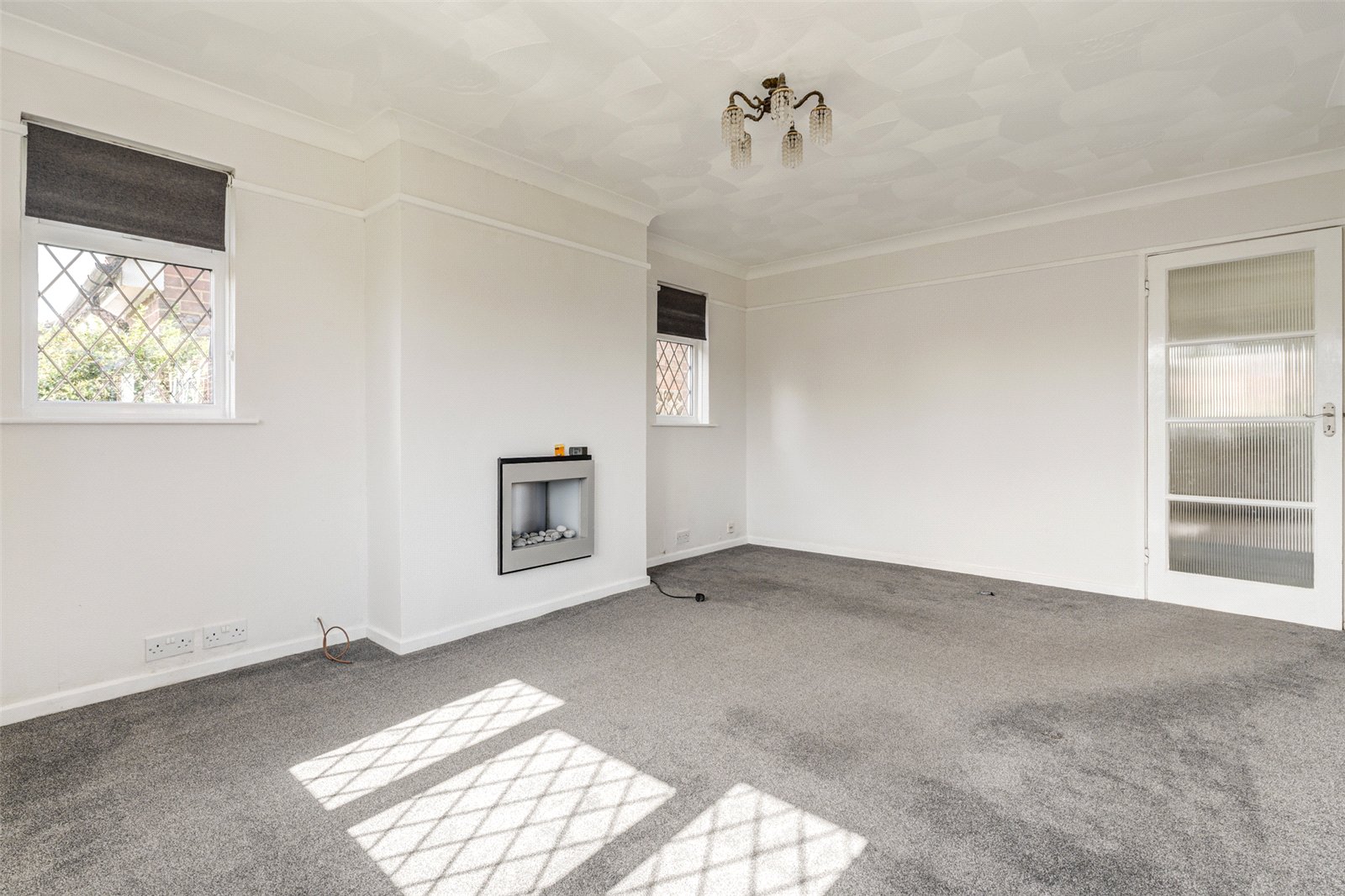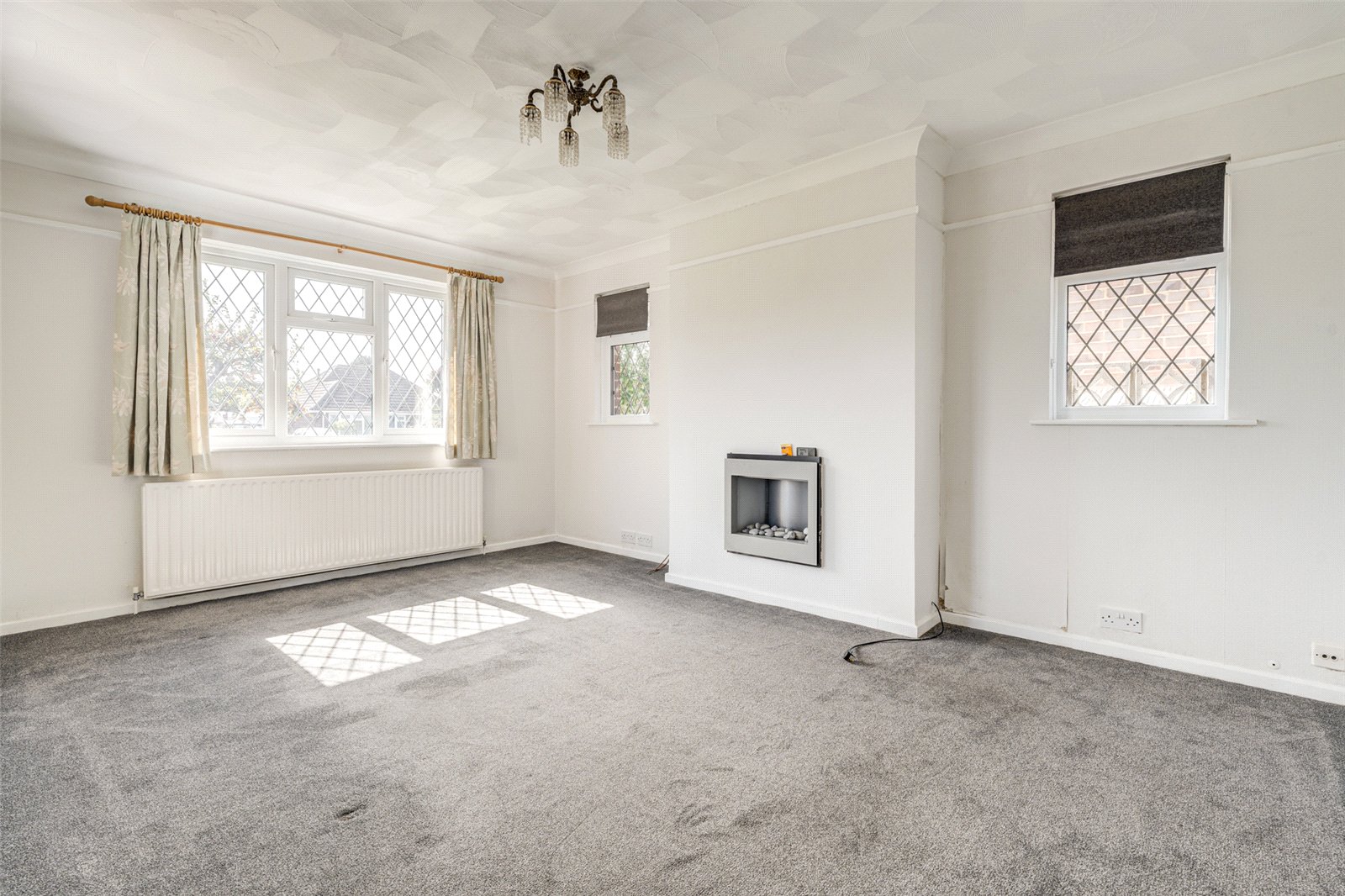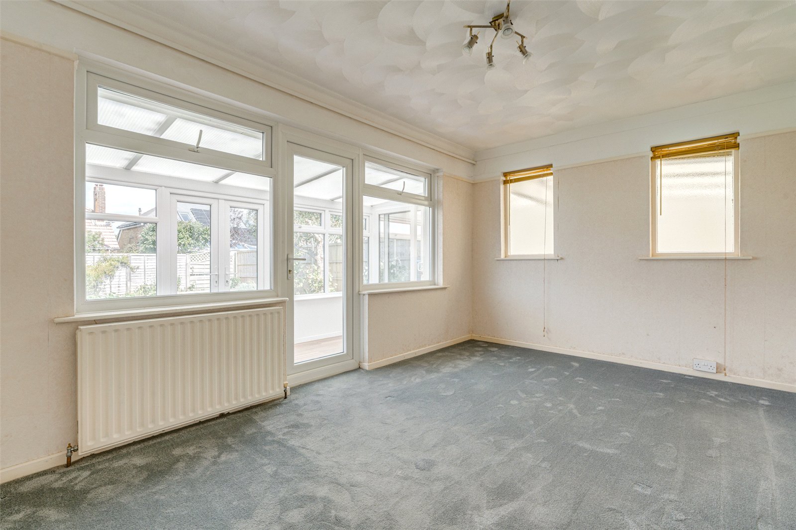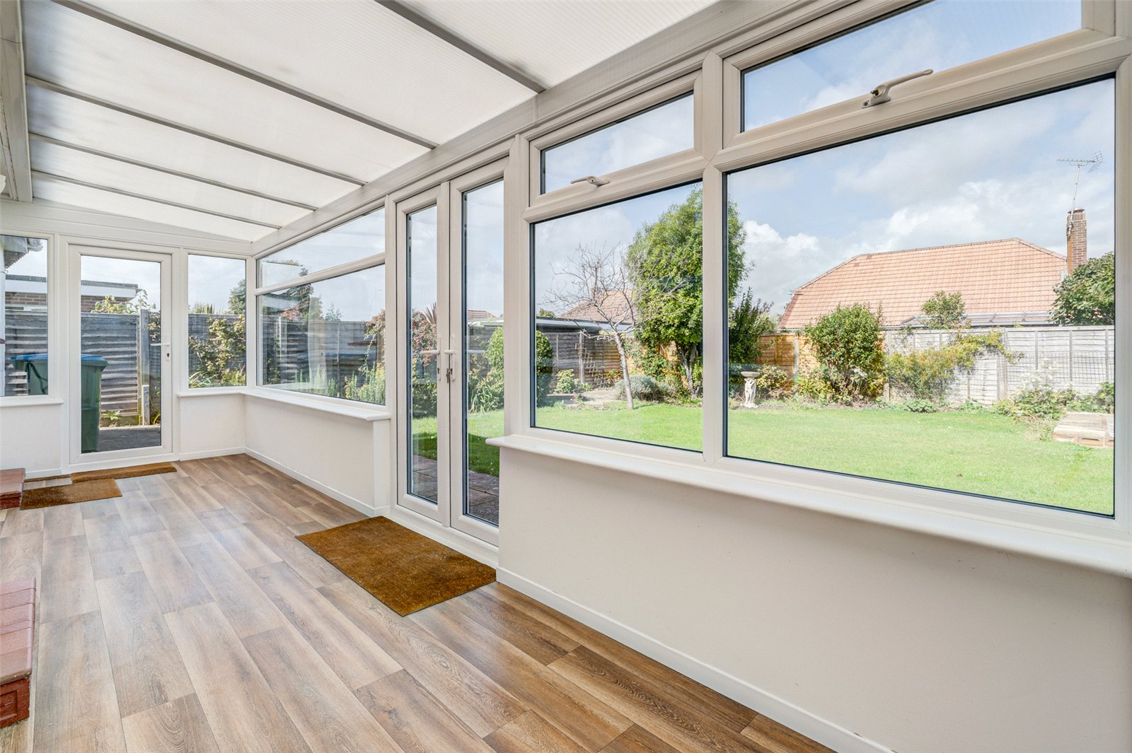 Accessed from the front this spacious detached bungalow has an enclosed porch leading into a good sized reception hall. To the front is a large triple aspect lounge with an electric wall fireplace. The main double aspect bedroom, as with the lounge, has South facing views over an attractive garden and plenty of fitted wardrobes. To the rear is a further sizeable double bedroom with a glazed door into a sunroom. Adjacent, the kitchen has a gas counter hob and double wall oven; ample cupboards, drawers and work surfaces; a slim line dishwasher and space for further appliances as required. A glazed door leads into a wide light filled solarium which has doors to the rear garden, and which offers an ideal area to relax. Sliding doors lead into a second sunroom which gives access into the garage. A bathroom with a separate shower cubicle and heated towel rail makes up the rest of the accommodation.