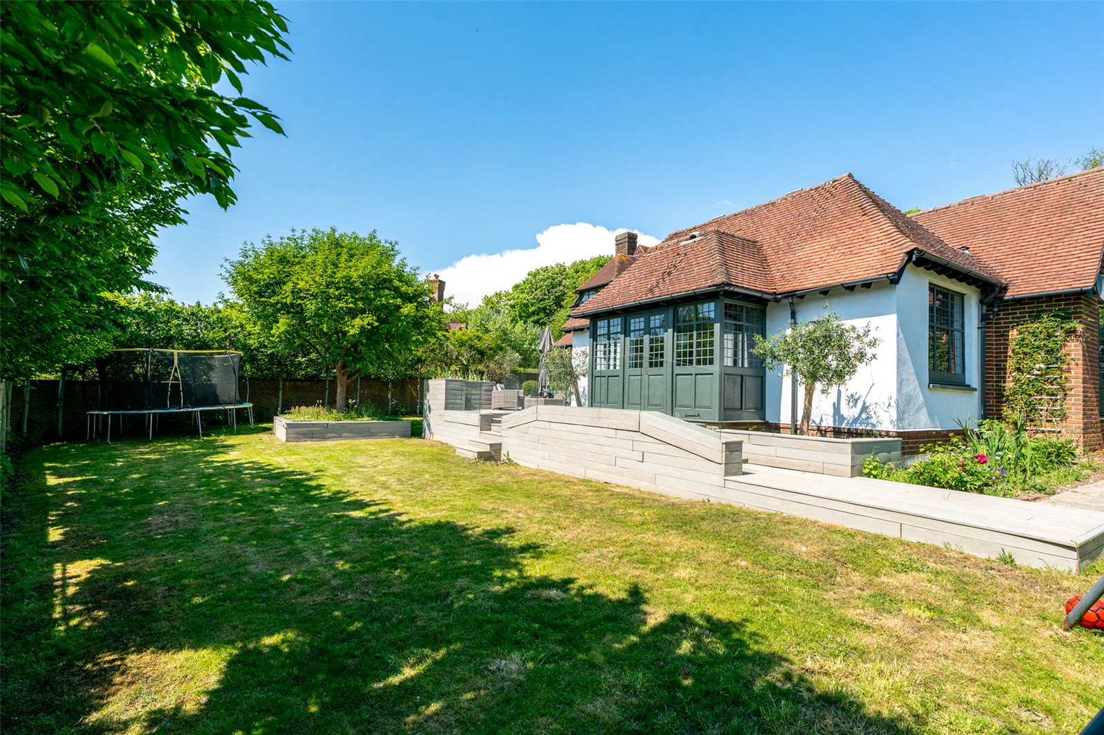 Externally, there is extensive parking to the front and a double garage with attached workshop, store and boiler room, whilst the property benefits from gardens to the rear and side, with an excellent entertaining courtyard garden to the rear and the side garden with lawned area and large, raised decked area and hot tub.