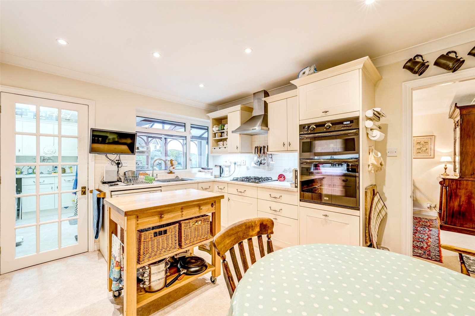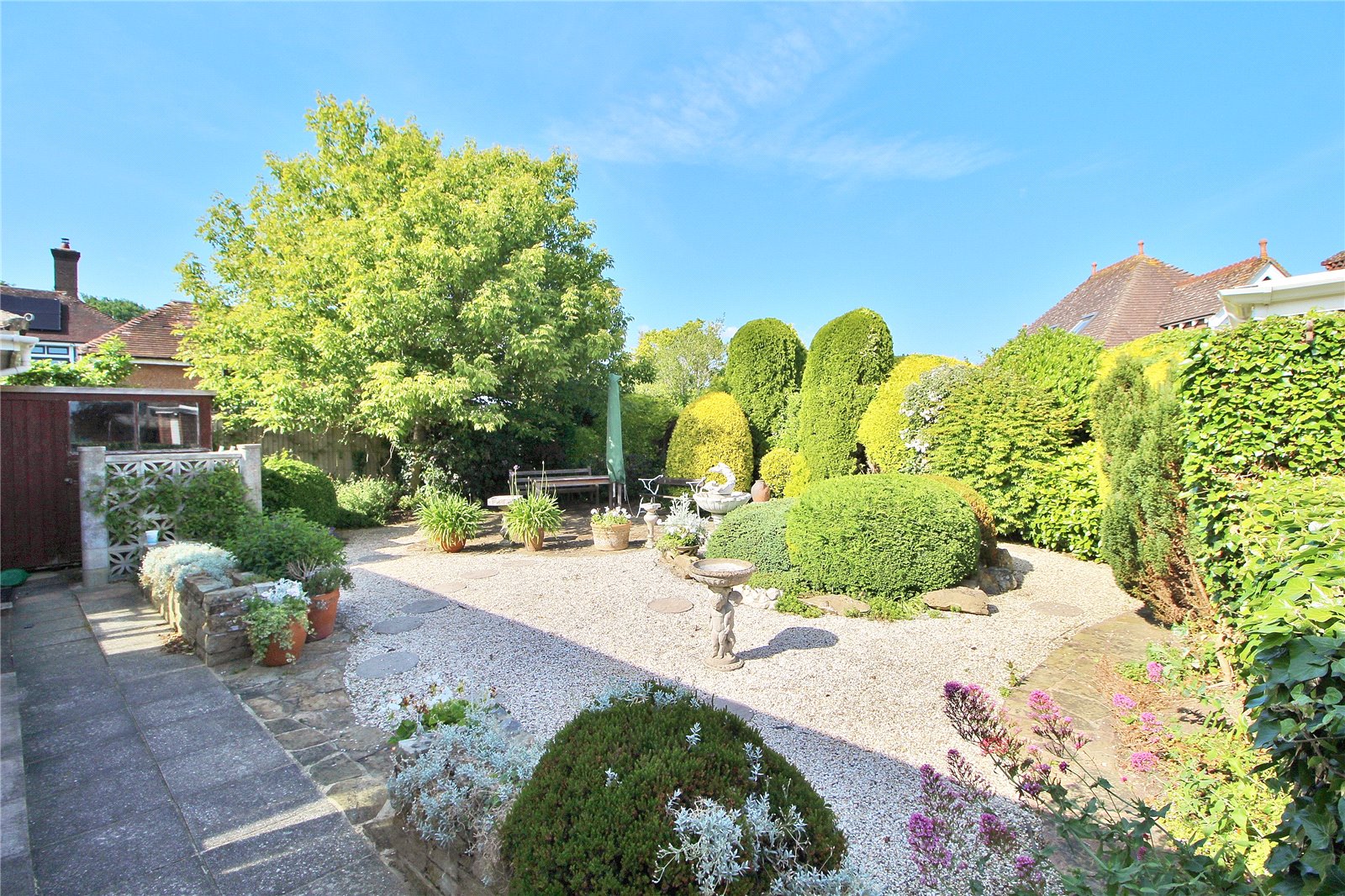 The rear garden has, like the front garden, been thoughtfully landscaped with low maintenance in mind. Mainly paved with borders of a variety of shrubs, bushes and flowers giving a range of colours throughout the year. The elevated position also offers unencumbered sunshine from the South.