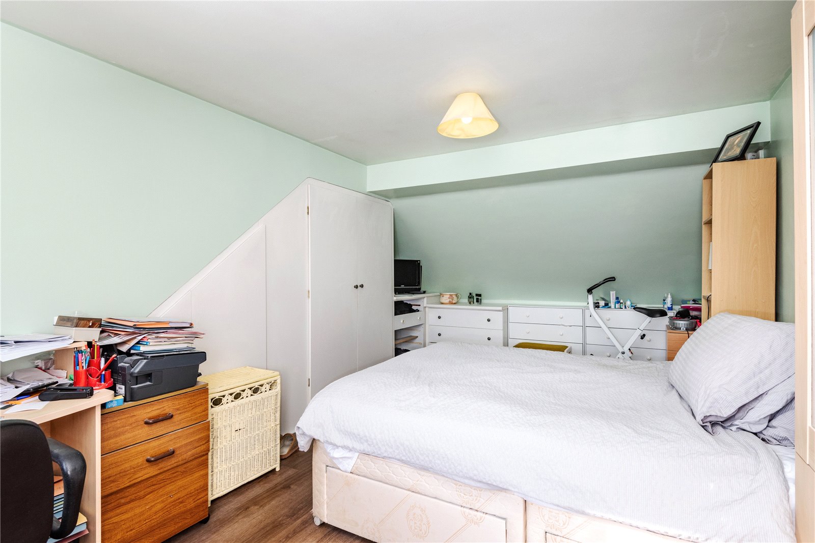 To the first floor, the landing has built in storage and gives access to two double bedrooms and a family bathroom/WC, fitted with white suite and has Downland view. Bedroom one has built in wardrobes and drawer storage, a walk in storage cupboard and Downland views from the south/westerly facing window, whilst bedroom two has fitted double wardrobe, shelving and access to eaves storage.