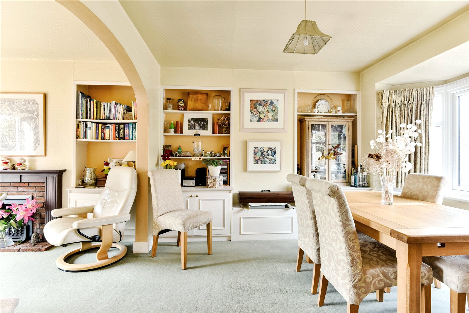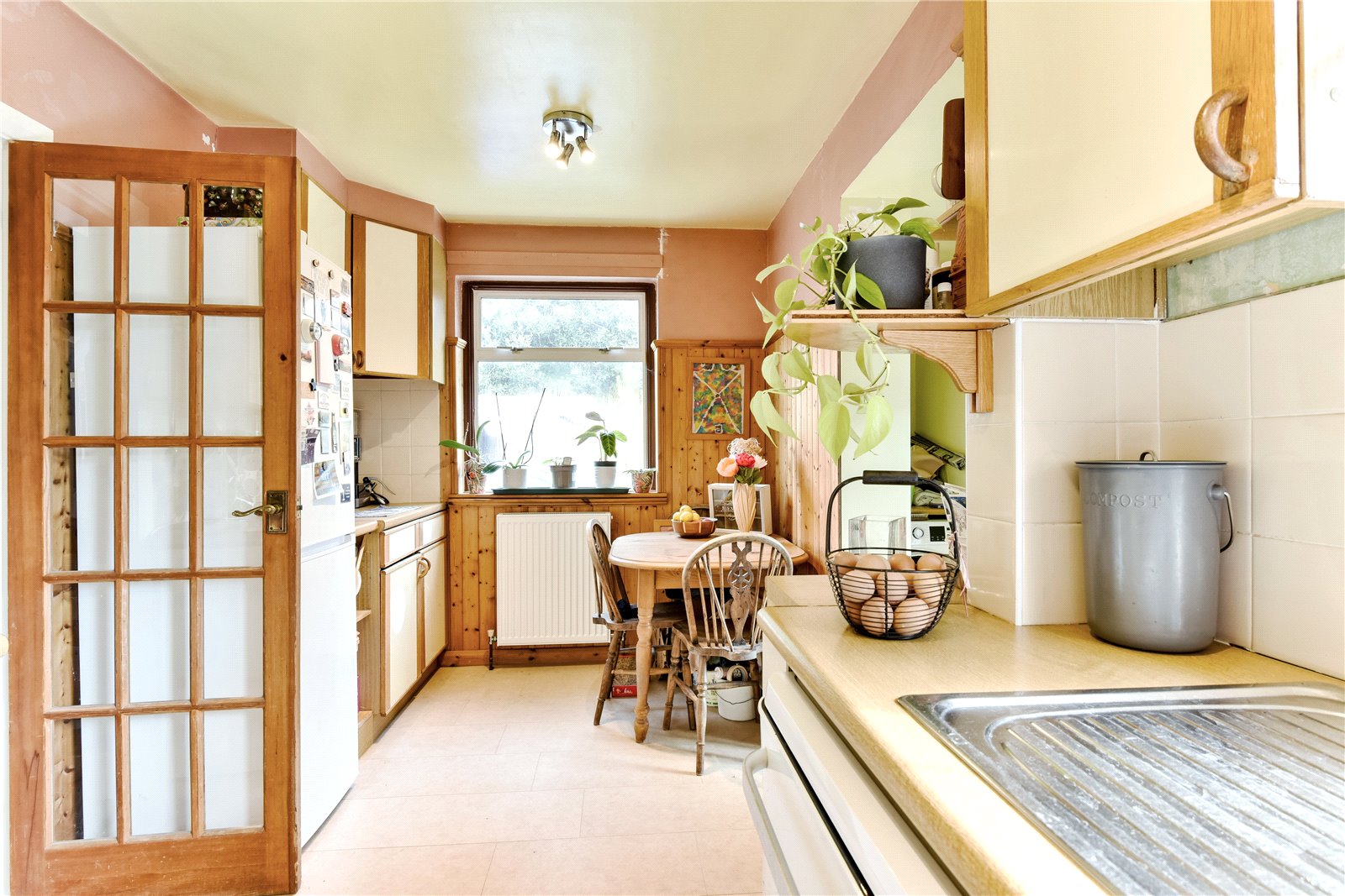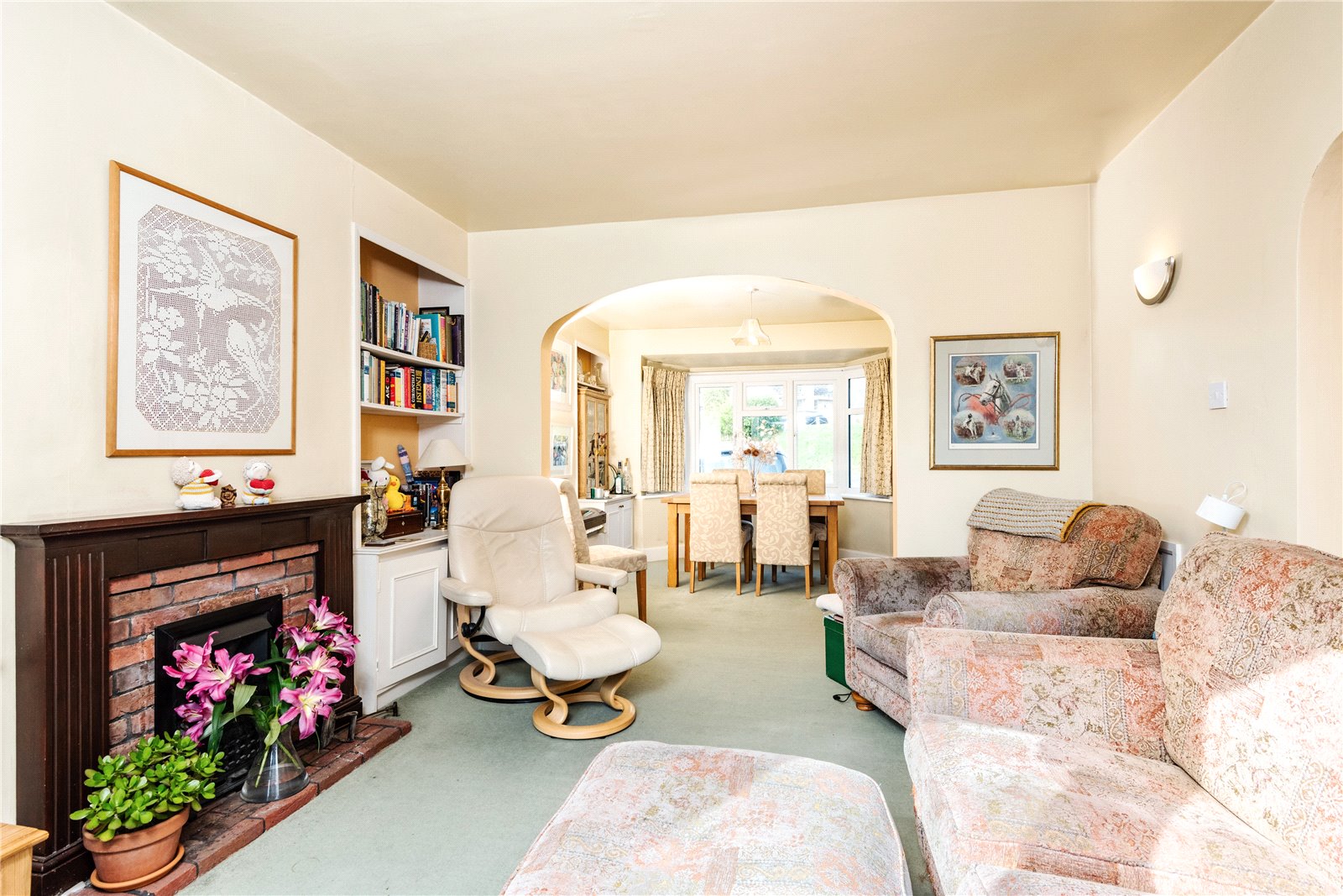 The glazed front door leads to an entrance lobby with further glazed door to the entrance hall, with stairs rise to the first floor, built in storage and door to the through-lounge/dining room, with lounge area having fireplace with fitted coal effect gas fire, south/westerly double glazed sliding doors to the rear garden and Downland view, fitted storage and shelving and opens to a dining area, with double glazed bay window and fitted shelving and storage. The kitchen/breakfast room enjoys a double aspect with work surfaces, sink unit, range of base level and wall mounted cupboards, space for appliances and space for table and chairs, utility area and glazed door to a rear porch/lean to, which in turn has door to the rear garden. There is a ground floor double bedroom with double glazed bay window and range of fitted wardrobes and storage and an adjacent shower room/WC, fitted with white suite.