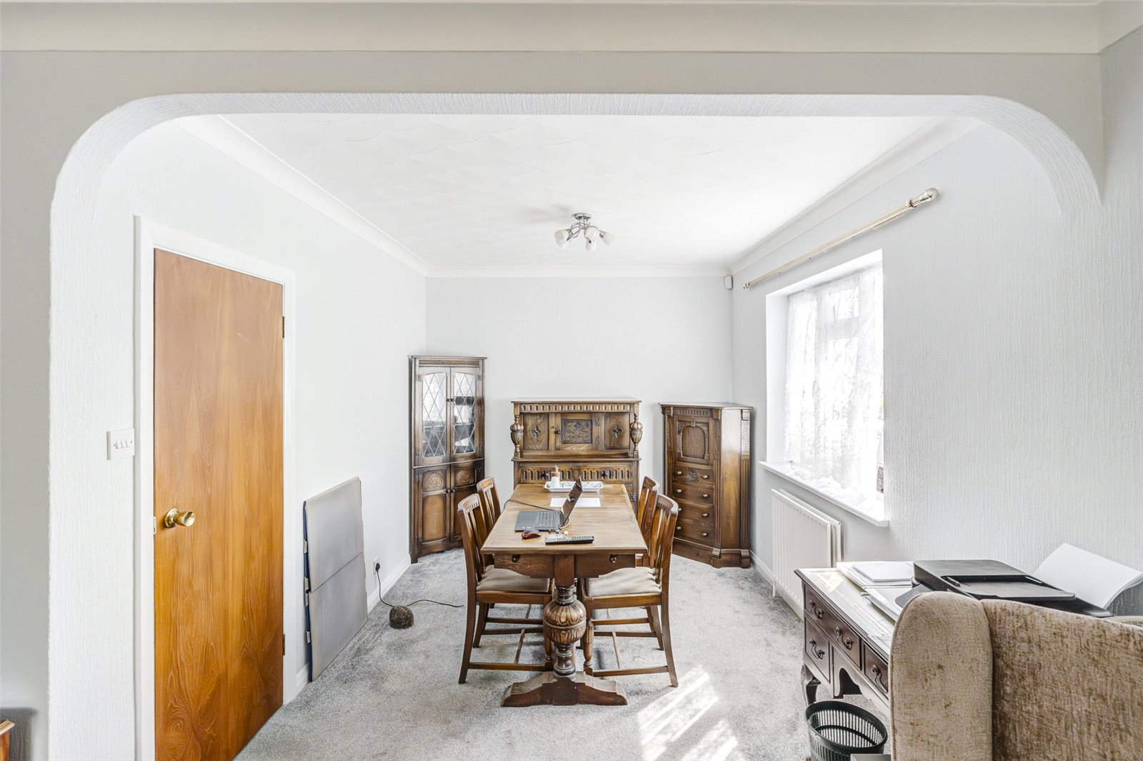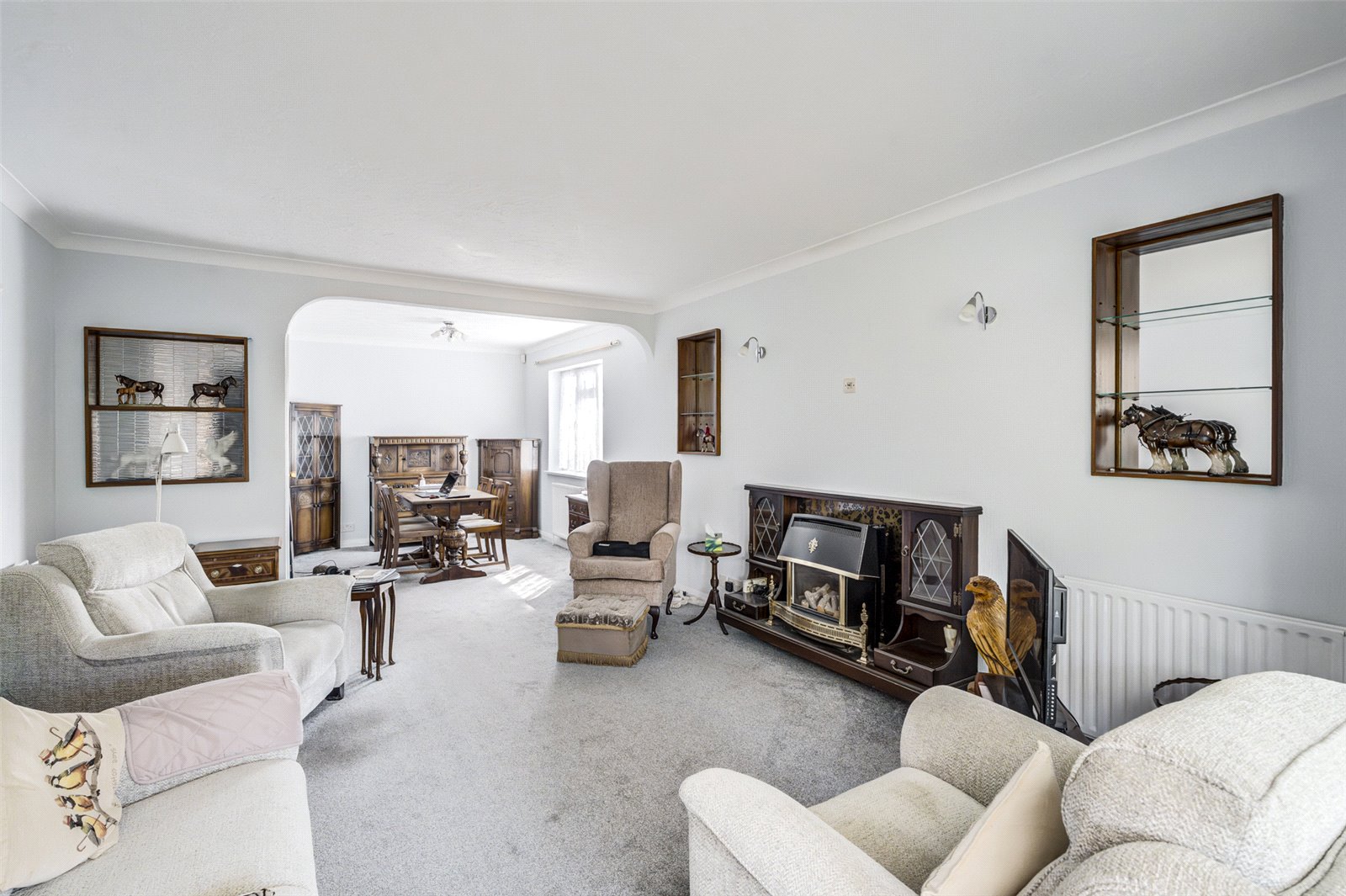 To the outside, the front garden has lawned area with flower borders, parking space and side access leading to a one and a half sized garage (L 16'8" x W 13'5"), with electric door, power and light, two further parking spaces and gate to the westerly facing rear garden, which is mainly laid to lawn, with block paved patio area, garden shed and flower beds.