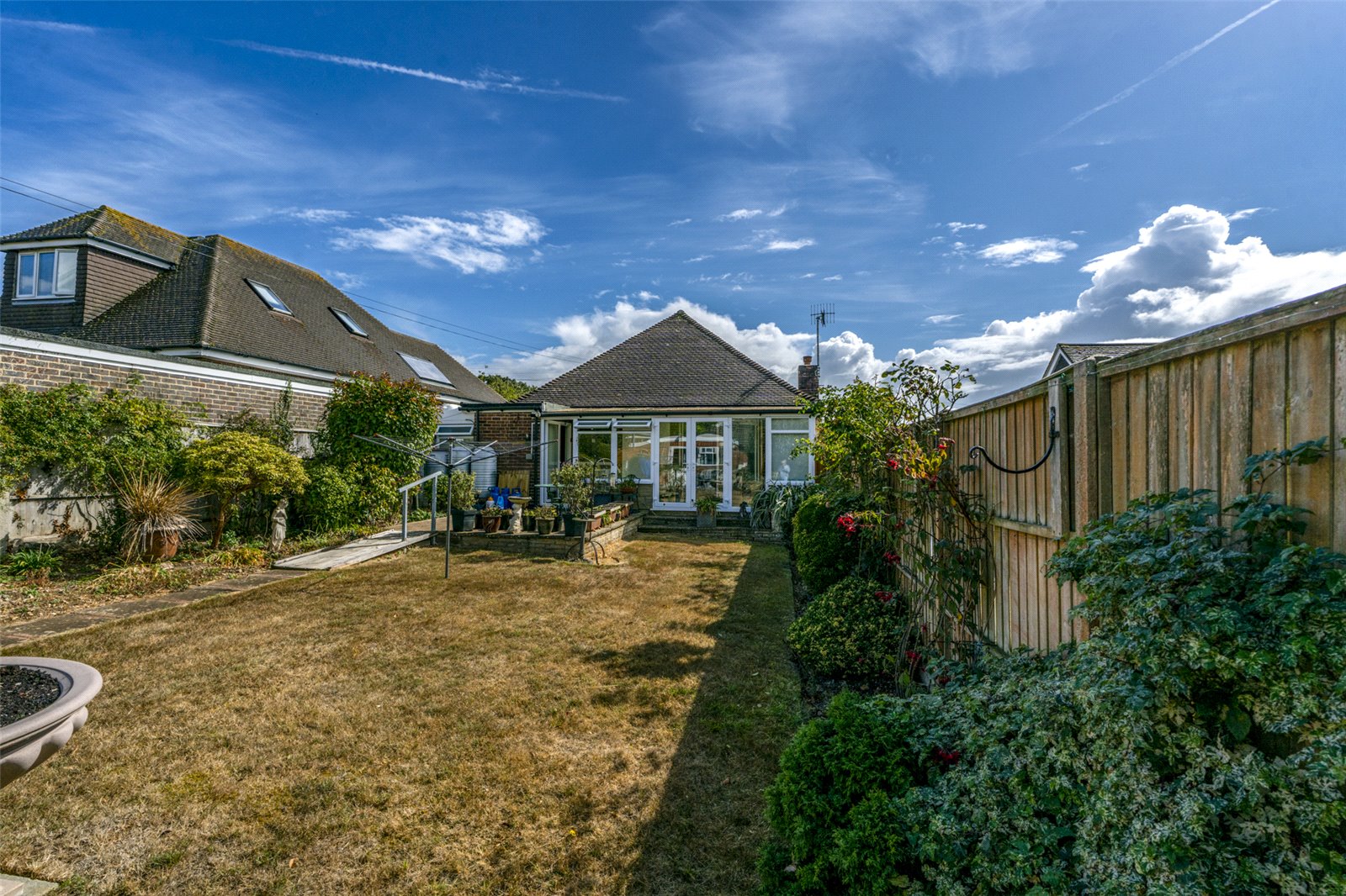 The sheltered entrance has replacement double glazed front door to the entrance hall, with built in storage and access to roof space, giving the potential to convert to additional accommodation (subject to necessary planning consent). The through lounge/dining room has southerly facing window and double glazed patio doors to a conservatory, with polycarbonate roof, radiator, enjoys a westerly aspect and has doors to the rear garden. The kitchen has island unit and work surfaces, with comprehensive range of base level and wall mounted units, built in oven and hob, space for appliances and doorway to a utility area, with further fitted units and door to covered side-storage area. The property has two double bedrooms, both with fitted wardrobes and an easterly aspect and a shower room/WC, with double sized shower cubicle having fitted electric shower and an additional separate WC, with wash hand basin.