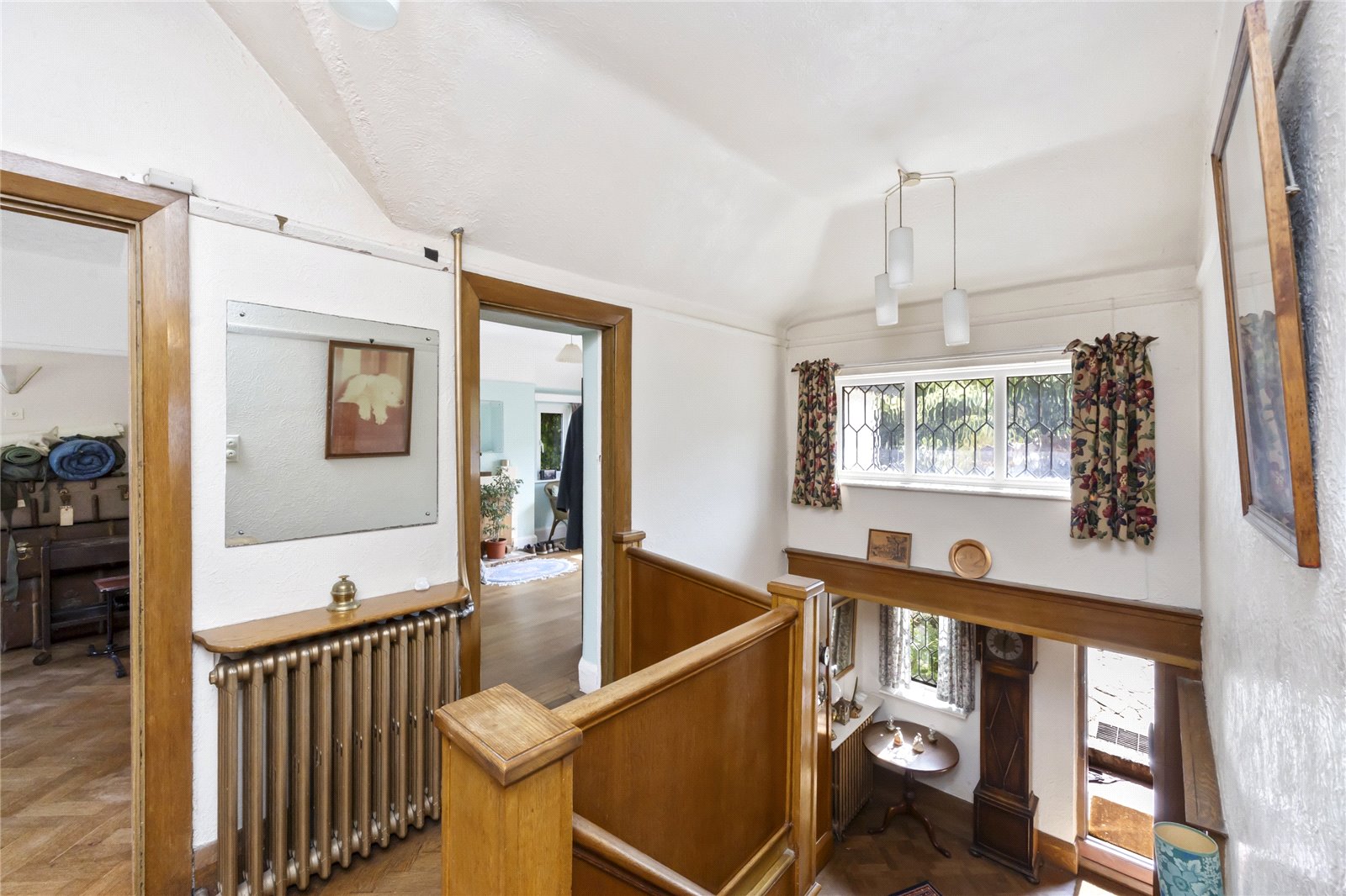 To the first floor, the landing has parquet flooring, built in storage and access to the roof space. There are three double bedrooms all with a double aspect, parquet flooring and the rear two bedrooms have a Downland view. The property is complete with a bathroom, having separate shower and an adjacent separate WC.