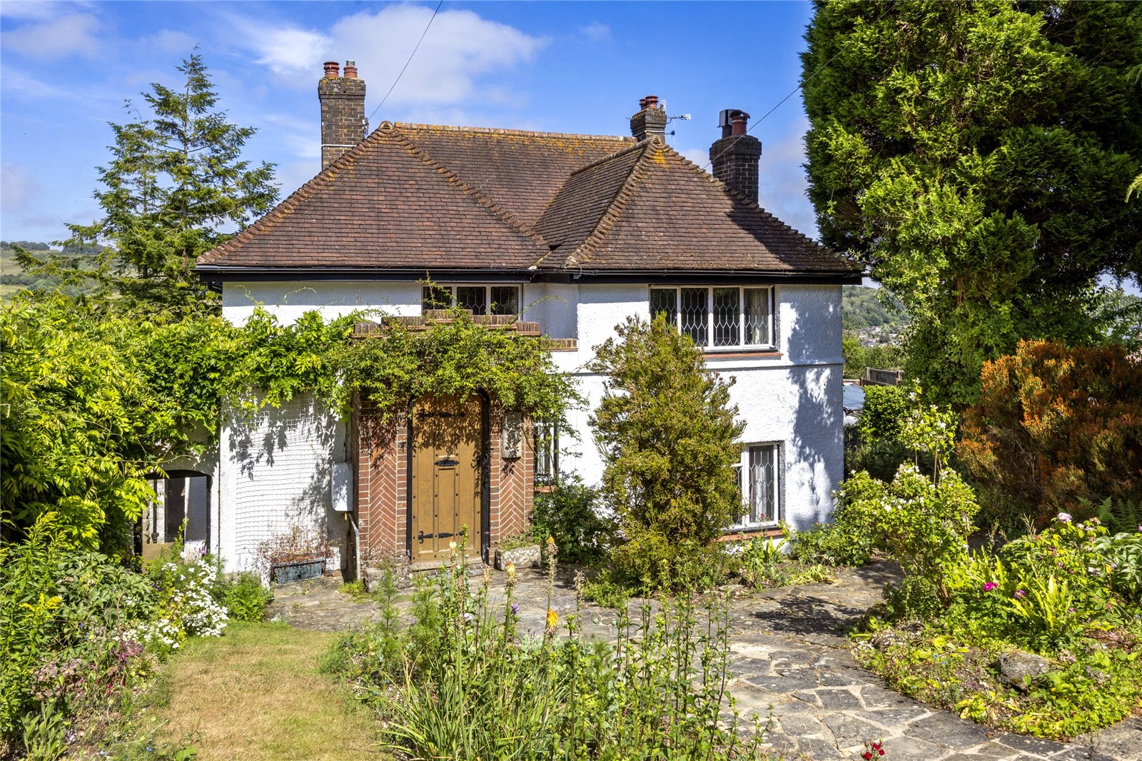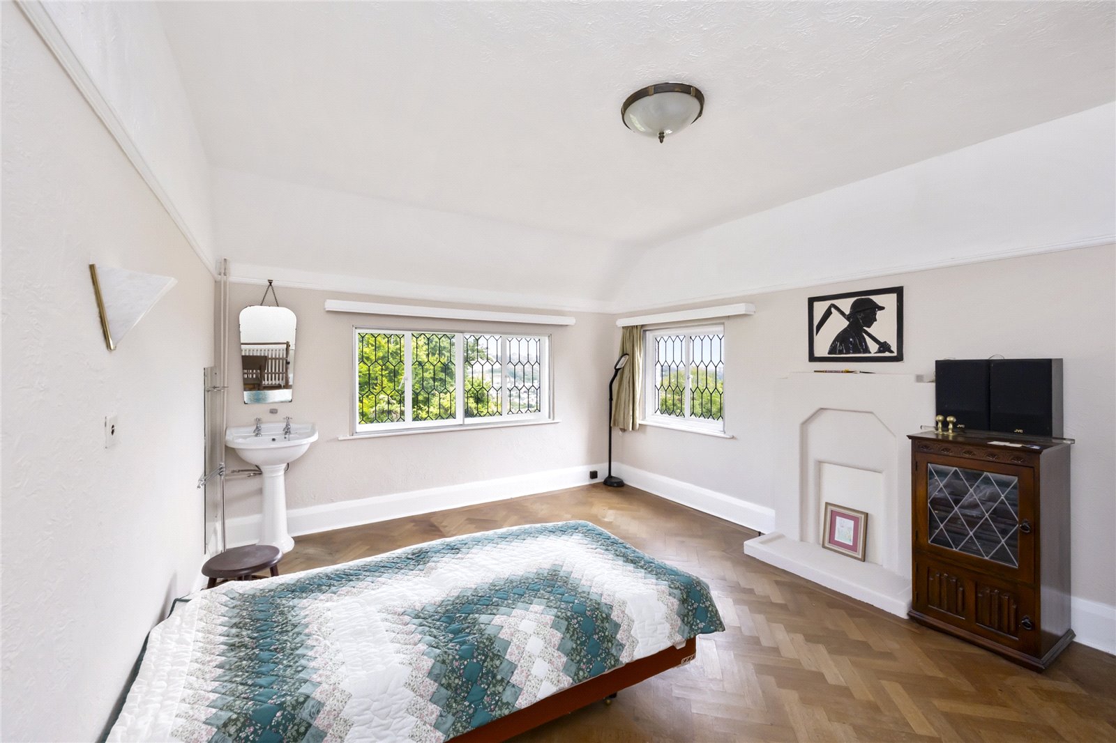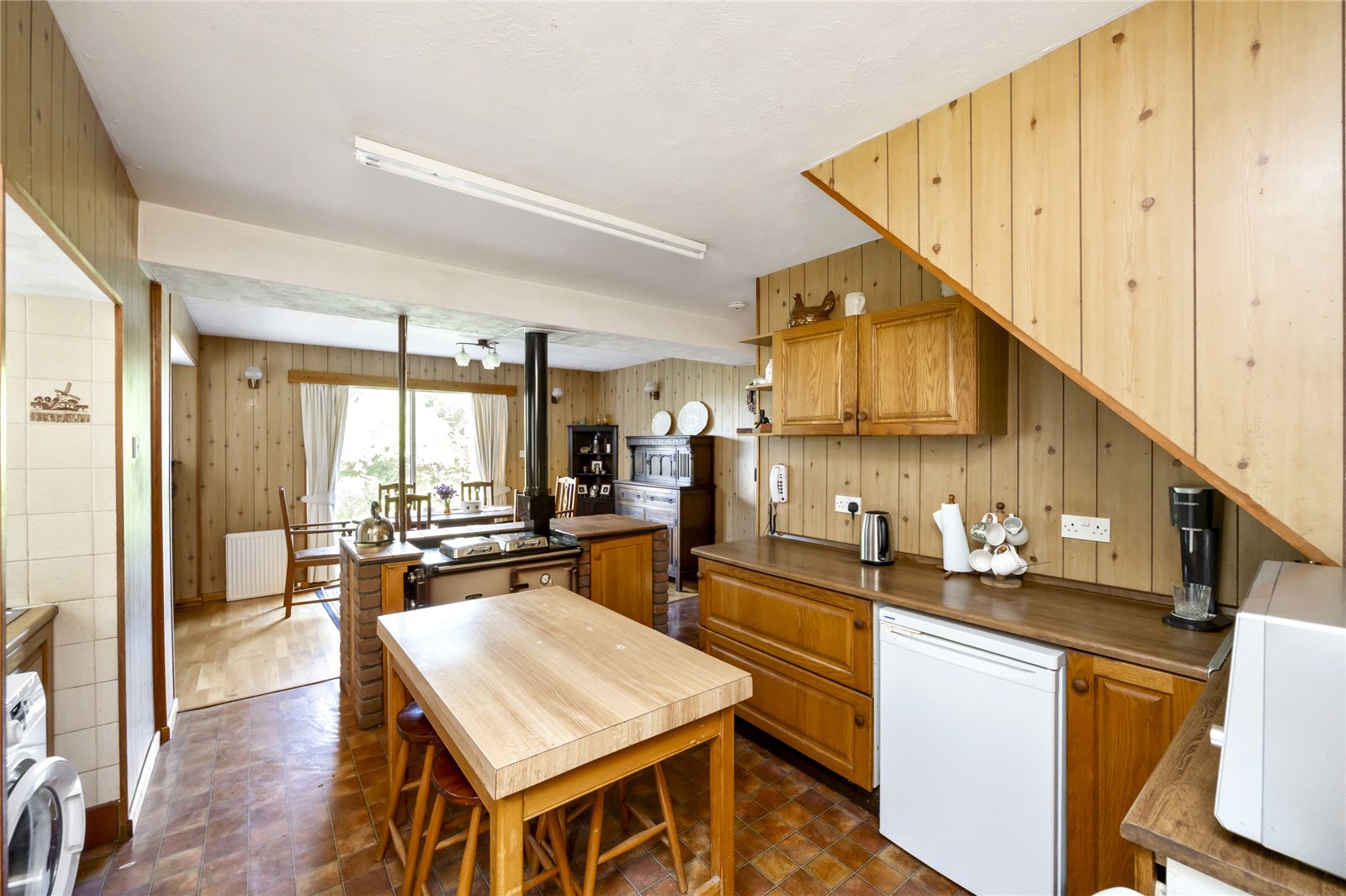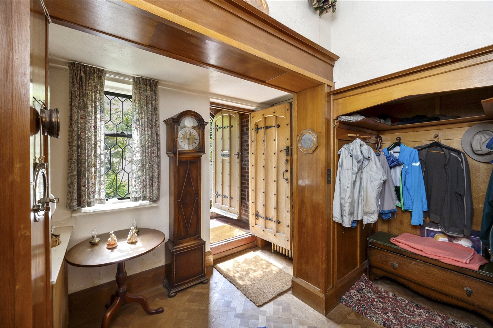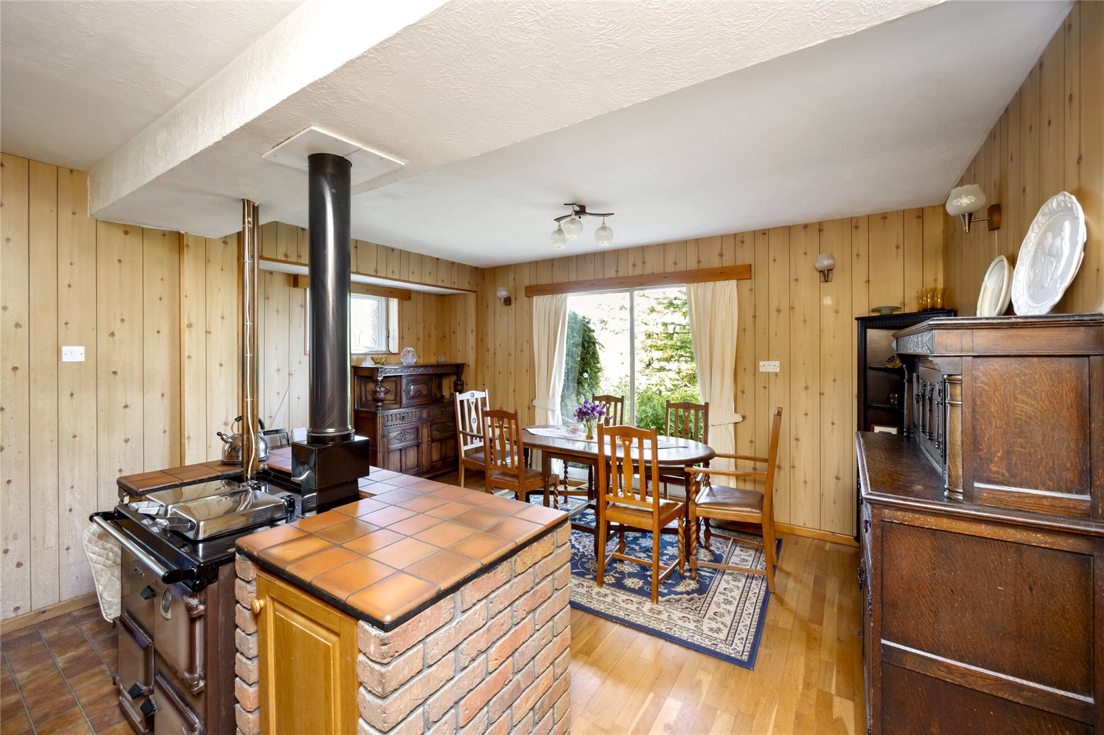 The attractive, original, hard wood front door leads to the entrance porch and has further door to the split-level reception hall, with its parquet flooring and recessed cloaks area. The living room enjoys a double aspect, with door to the rear terrace, has an attractive fireplace with wooden mantle and surround, parquet flooring, plate rack and beamed ceiling. The kitchen/diner has a dining area with patio doors to the rear garden and kitchen area with work surfaces, sink unit, range of base level and wall mounted cupboards, gas Raeburn range cooker, space for appliances, door to side access, and has a further door to an inner lobby and door to a ground floor cloakroom. The study enjoys a double aspect, has fireplace and parquet flooring.