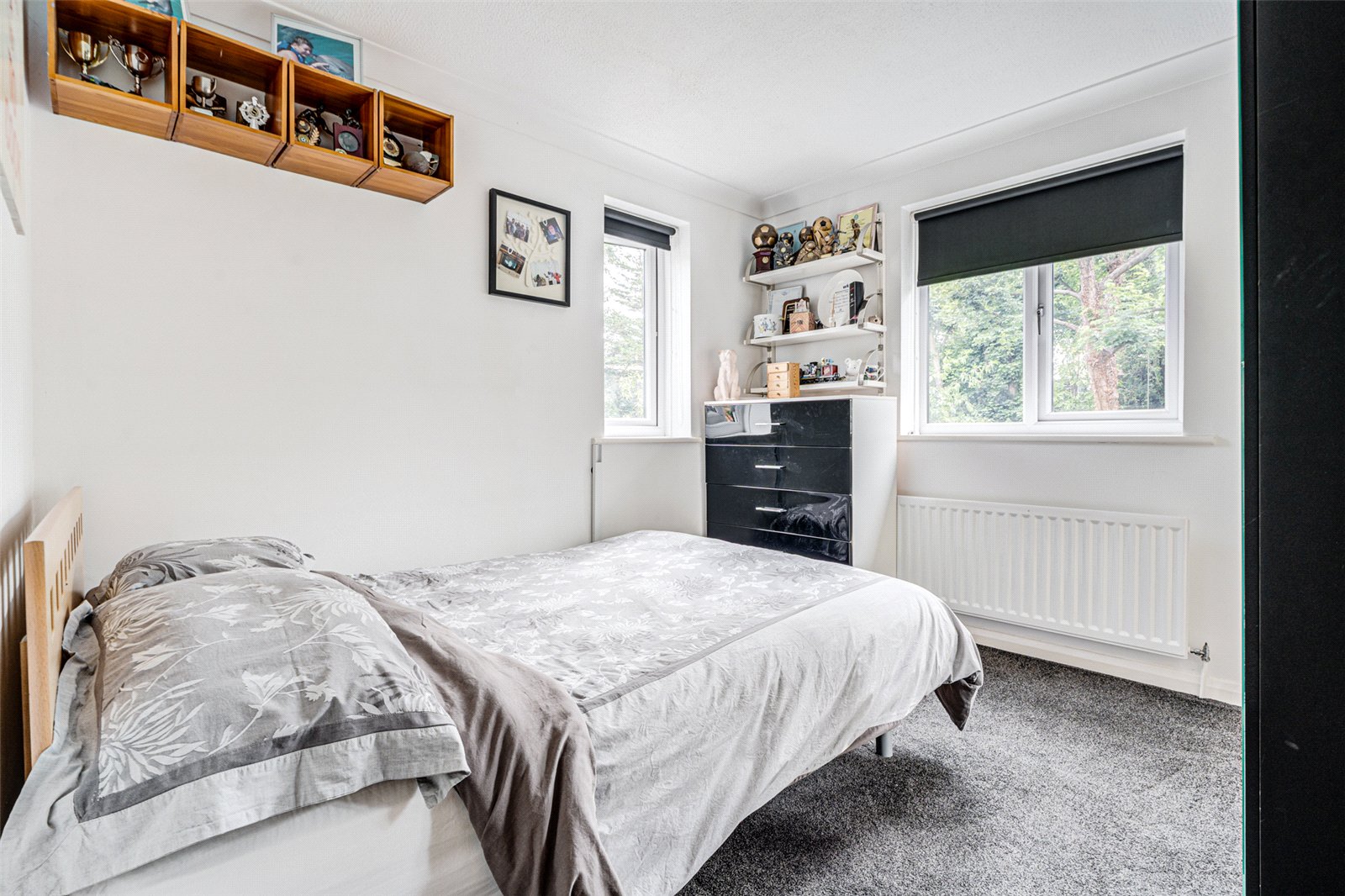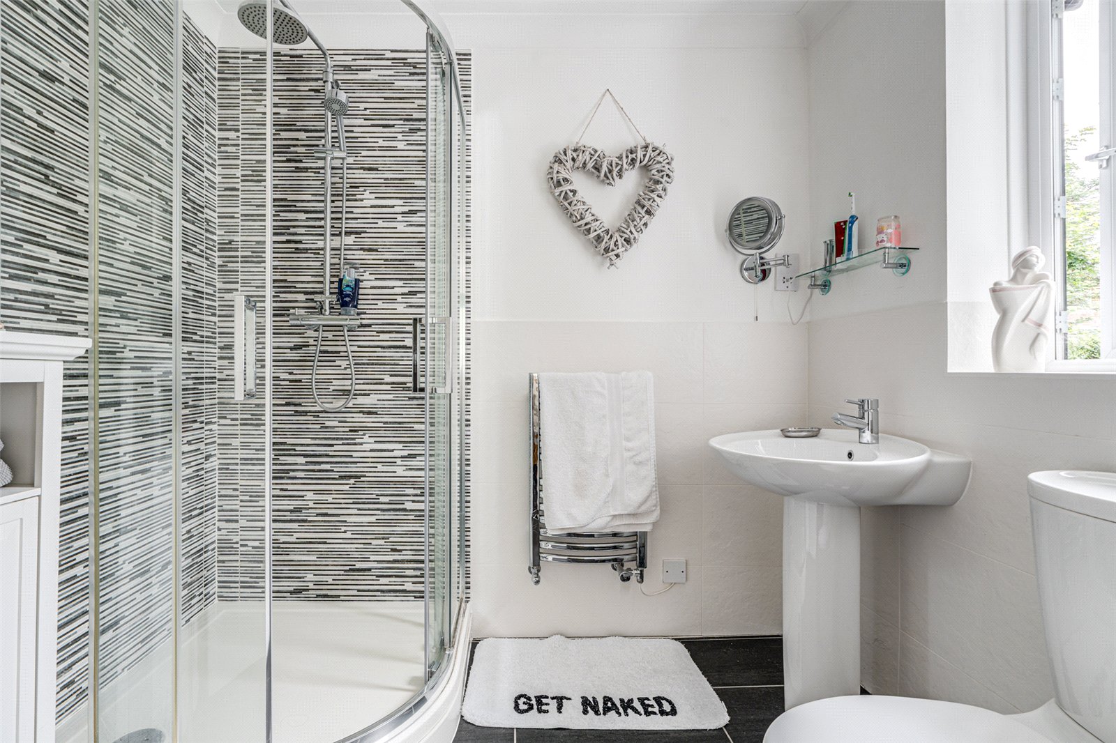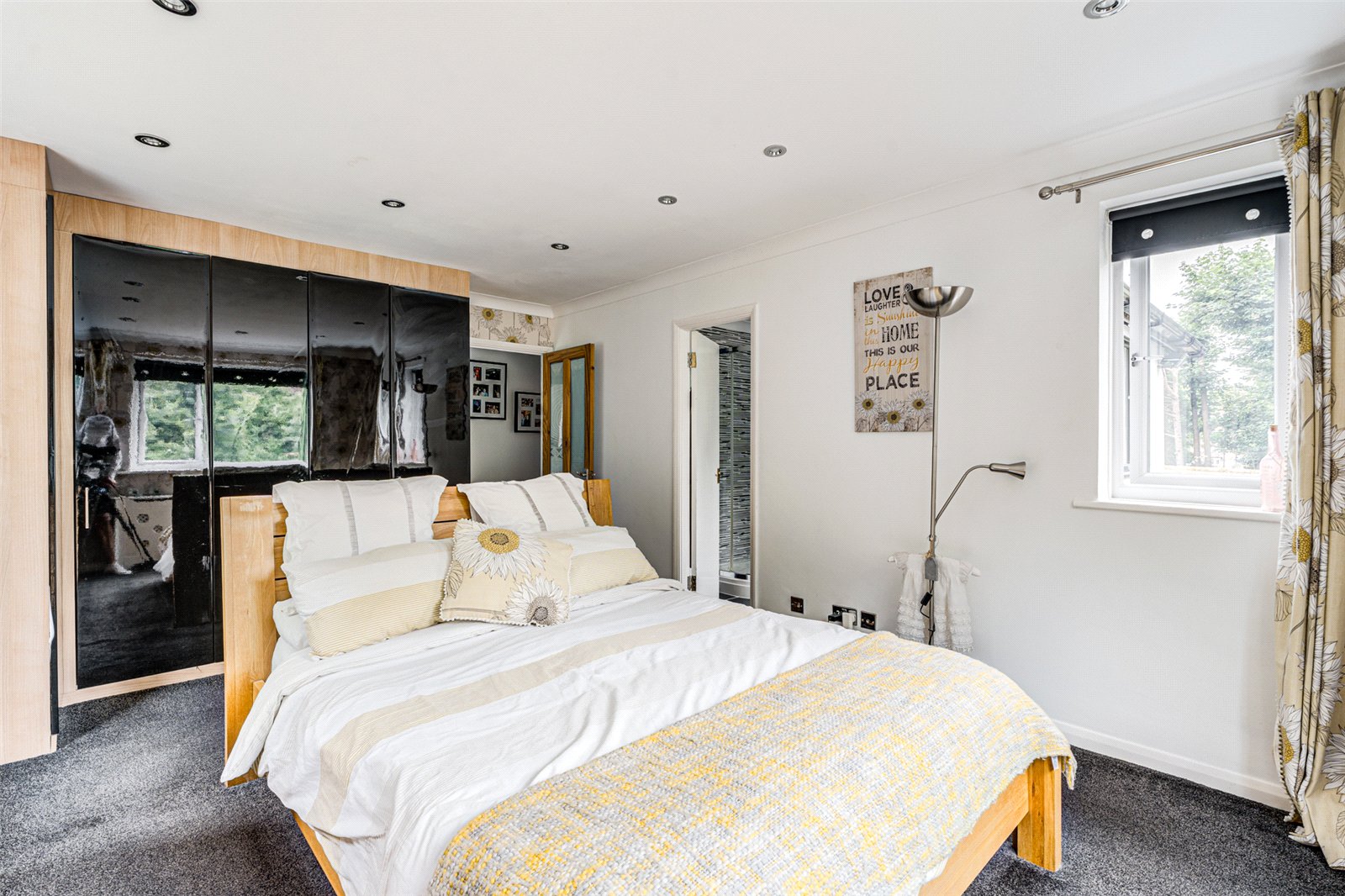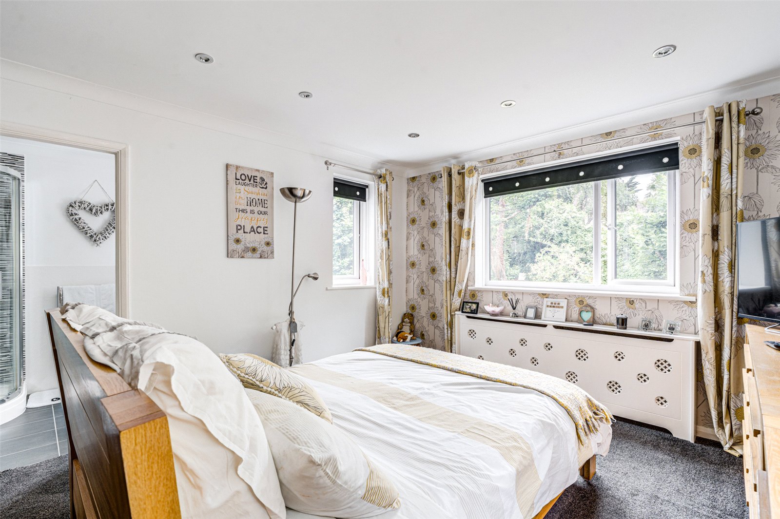 Upstairs, the bright landing leads to four bedrooms. The main bedroom offers serene views of the grounds and includes fitted wardrobes and a modern en suite shower room. Two additional double bedrooms are thoughtfully presented and feature built-in storage, while a fourth bedroom—currently used as a craft room—adds flexibility to the layout. A beautifully finished family bathroom completes the first floor, featuring both a freestanding bath and a separate shower.