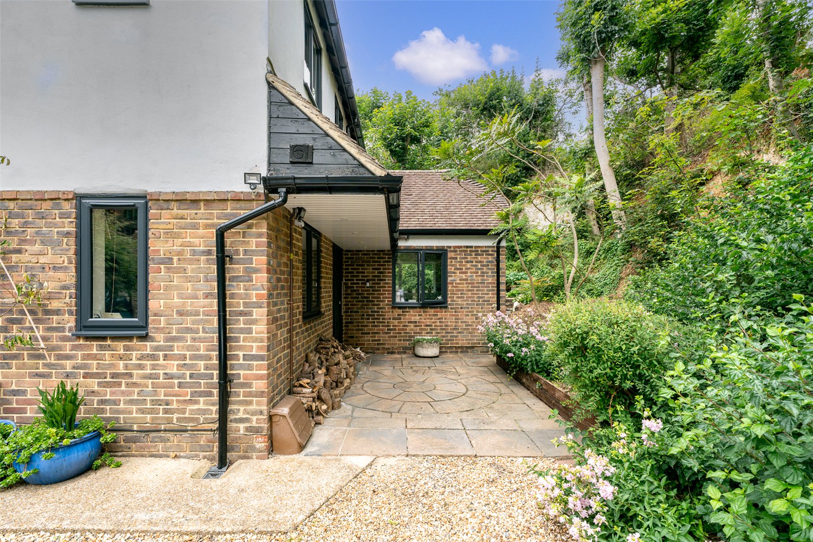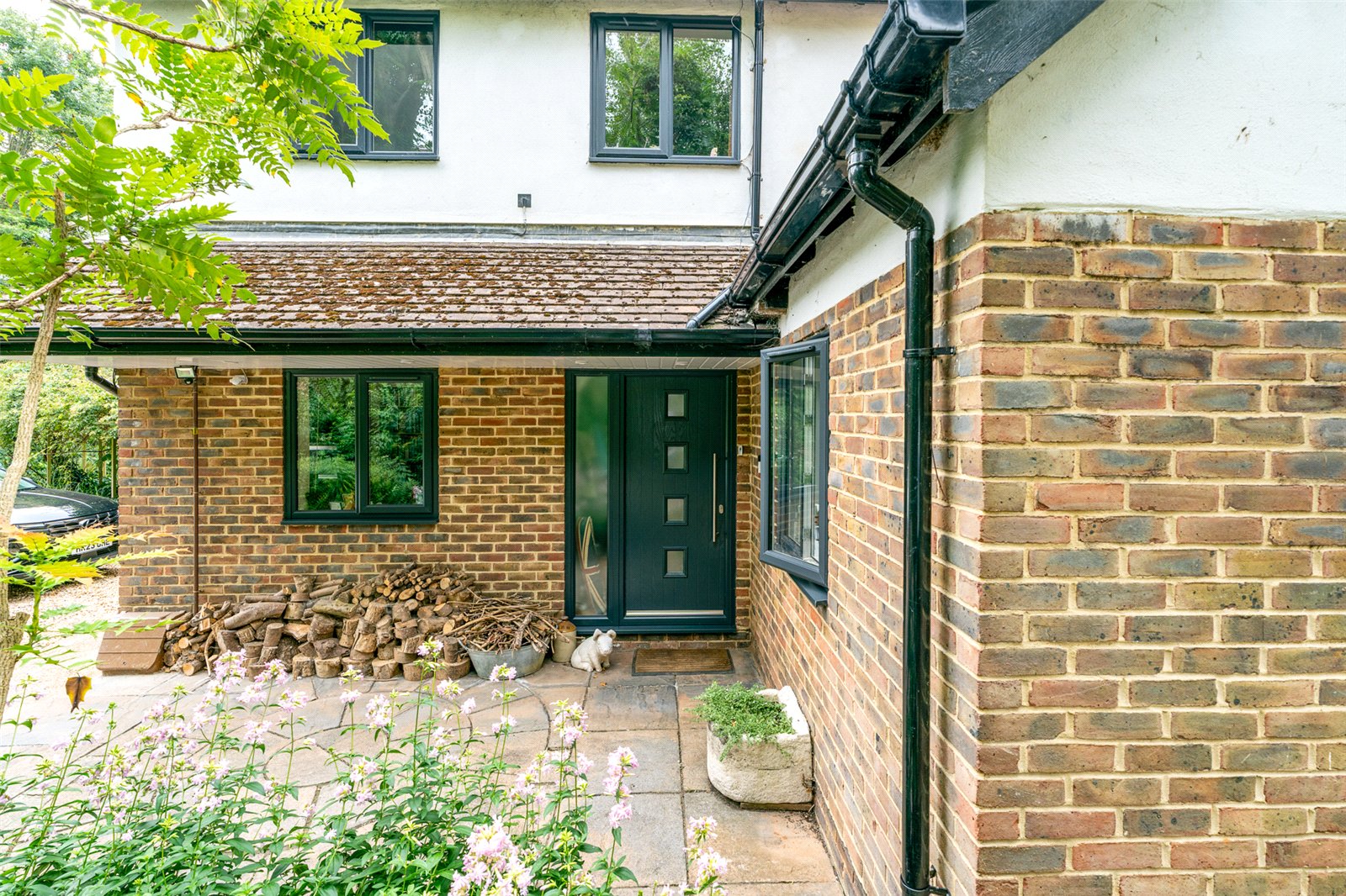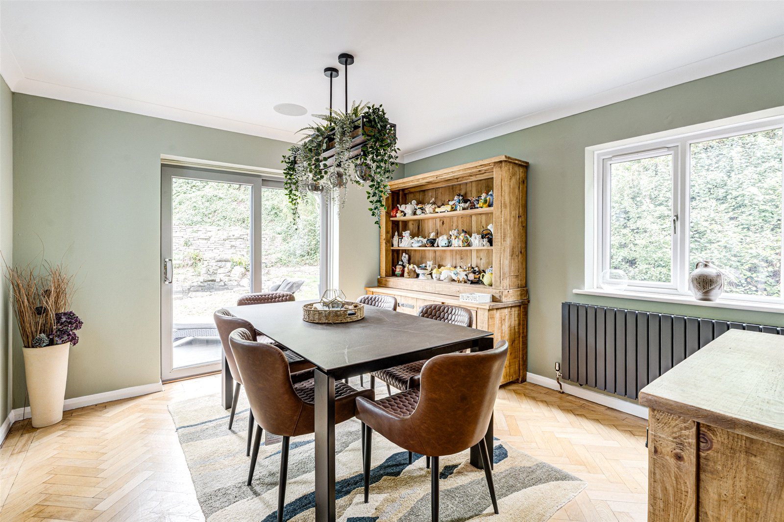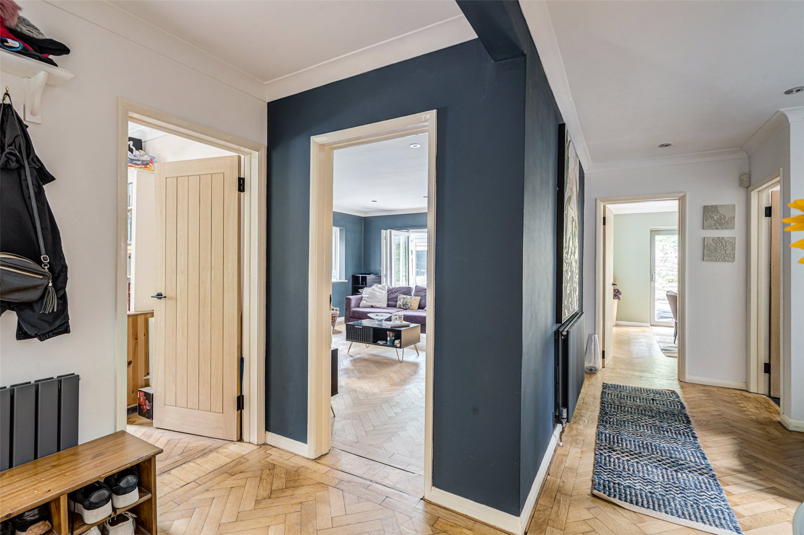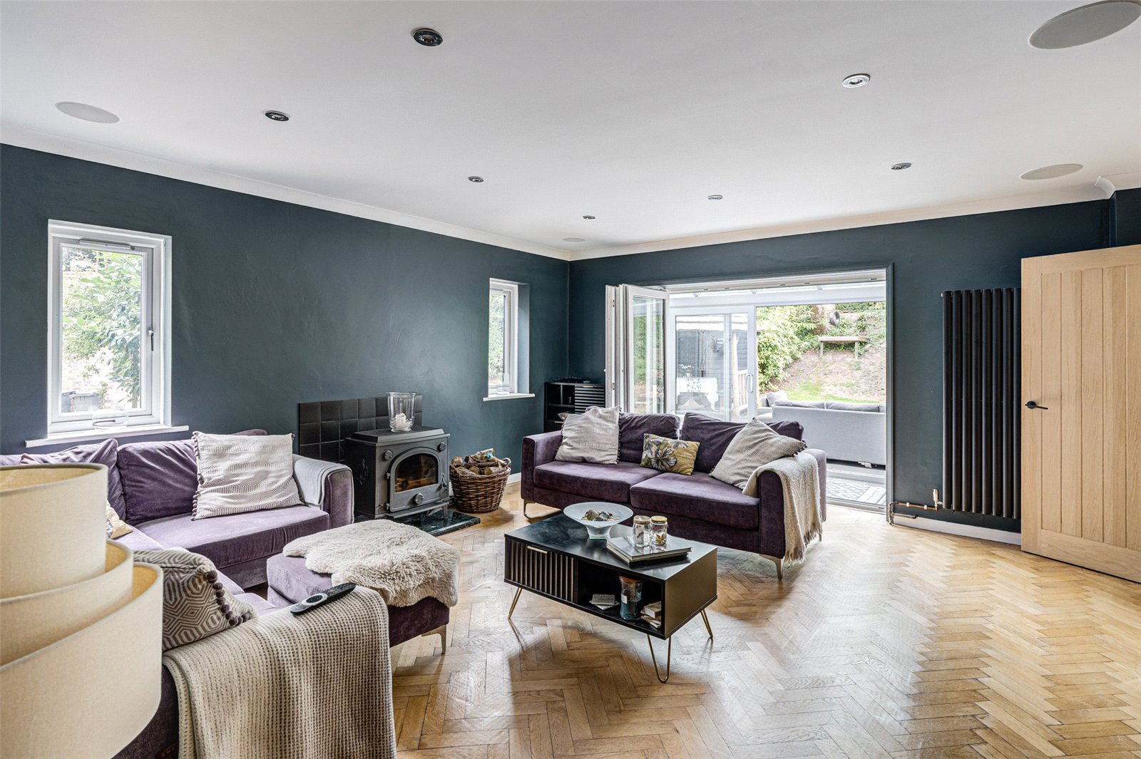The main living room is a generous, light-filled space, boasting continued parquet flooring, a feature log burner for cosy evenings, and bi-fold doors opening onto a conservatory. This space seamlessly links the interior with the tranquil wrap-around garden—perfect for entertaining or relaxing.