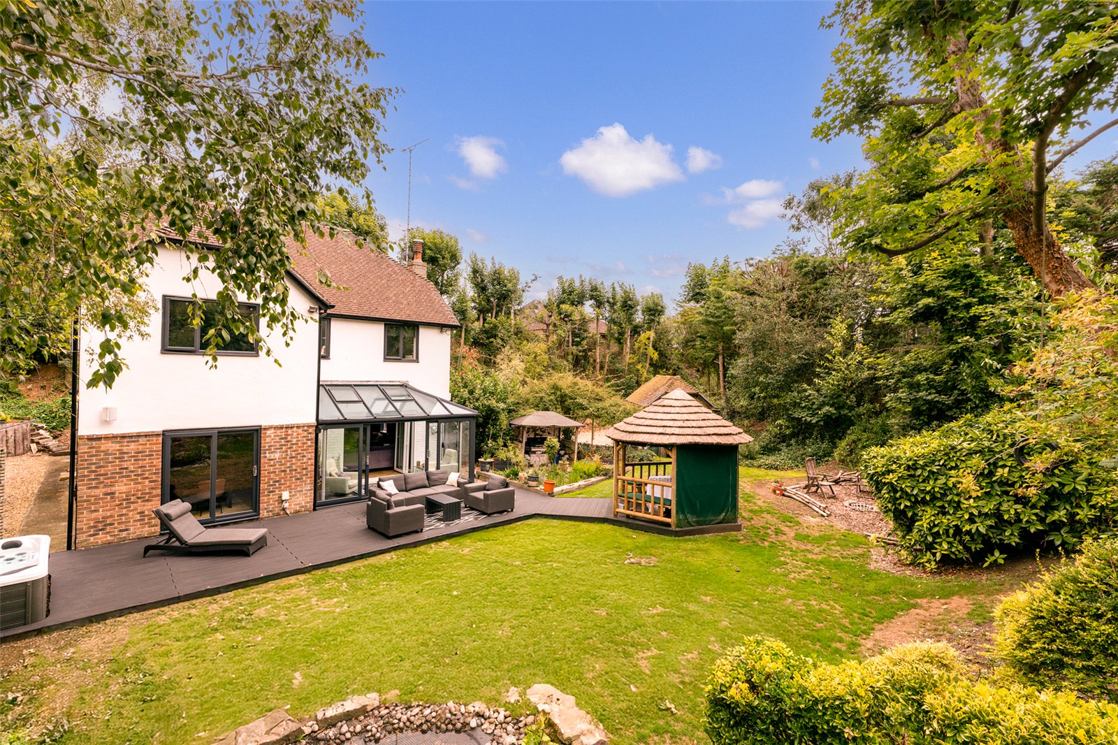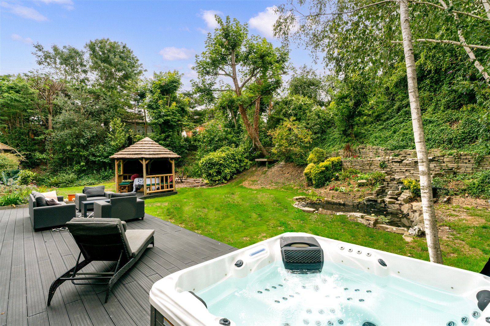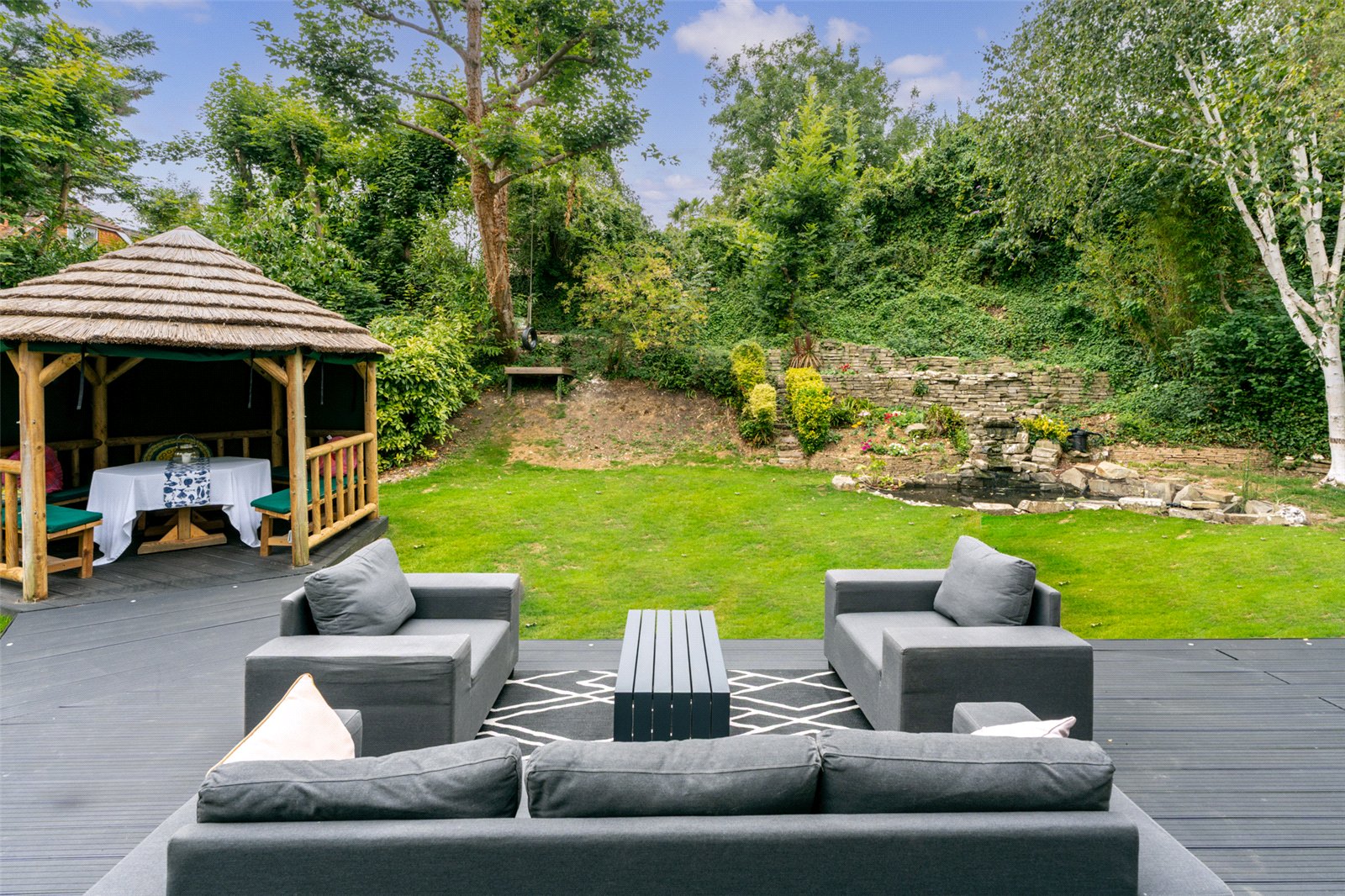 Outside, the garden is a true highlight. Wrapping around the home and mainly laid to lawn, it offers a raised composite deck, a thatched tiki-style hut, rock pond, and patio areas—all designed to make the most of outdoor living in a peaceful, private setting.