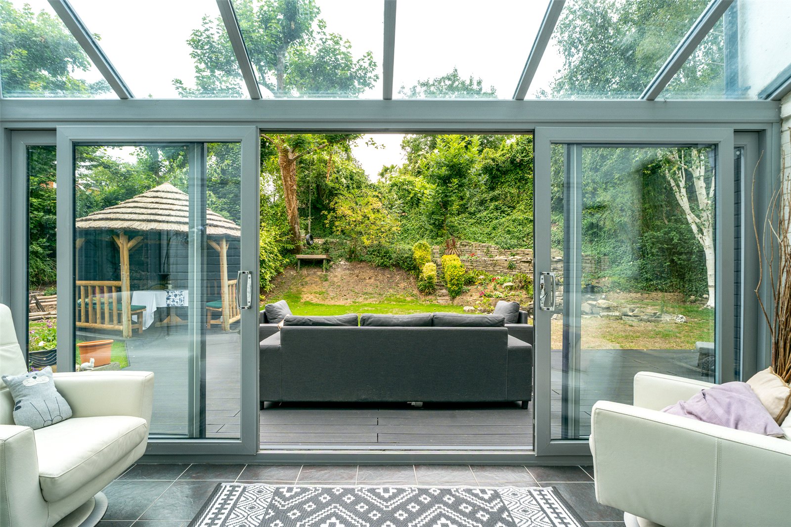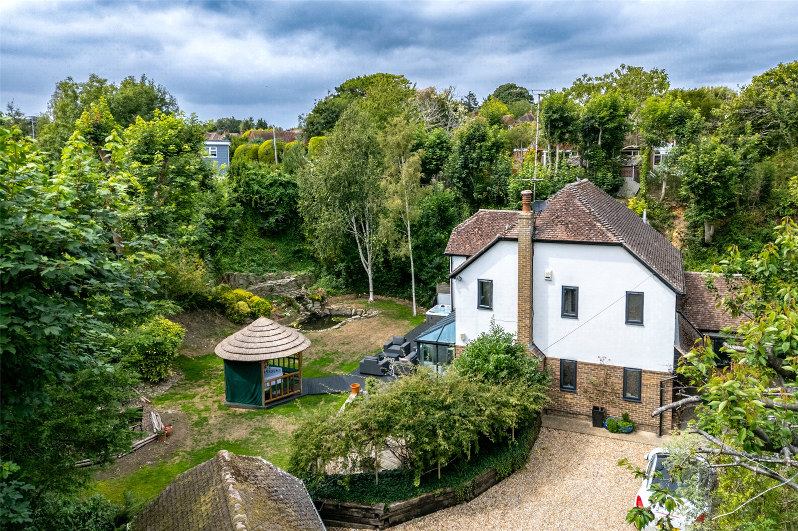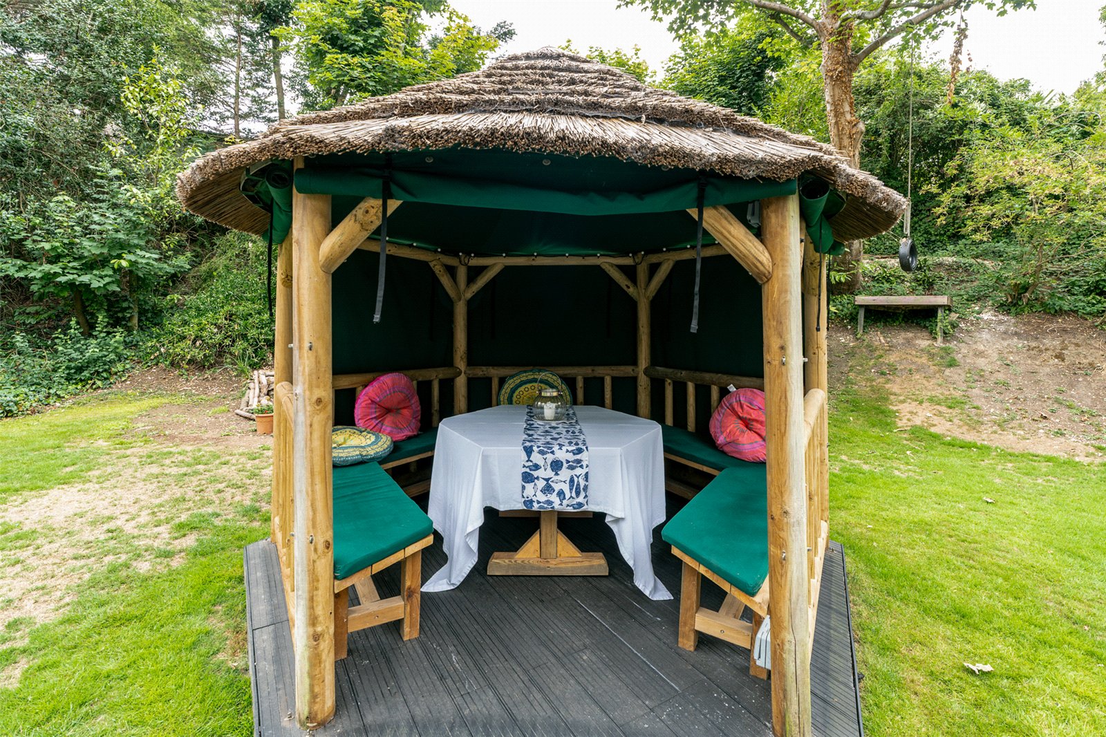 Outside, the garden is a true highlight. Wrapping around the home and mainly laid to lawn, it offers a raised composite deck, a thatched tiki-style hut, rock pond, and patio areas—all designed to make the most of outdoor living in a peaceful, private setting.