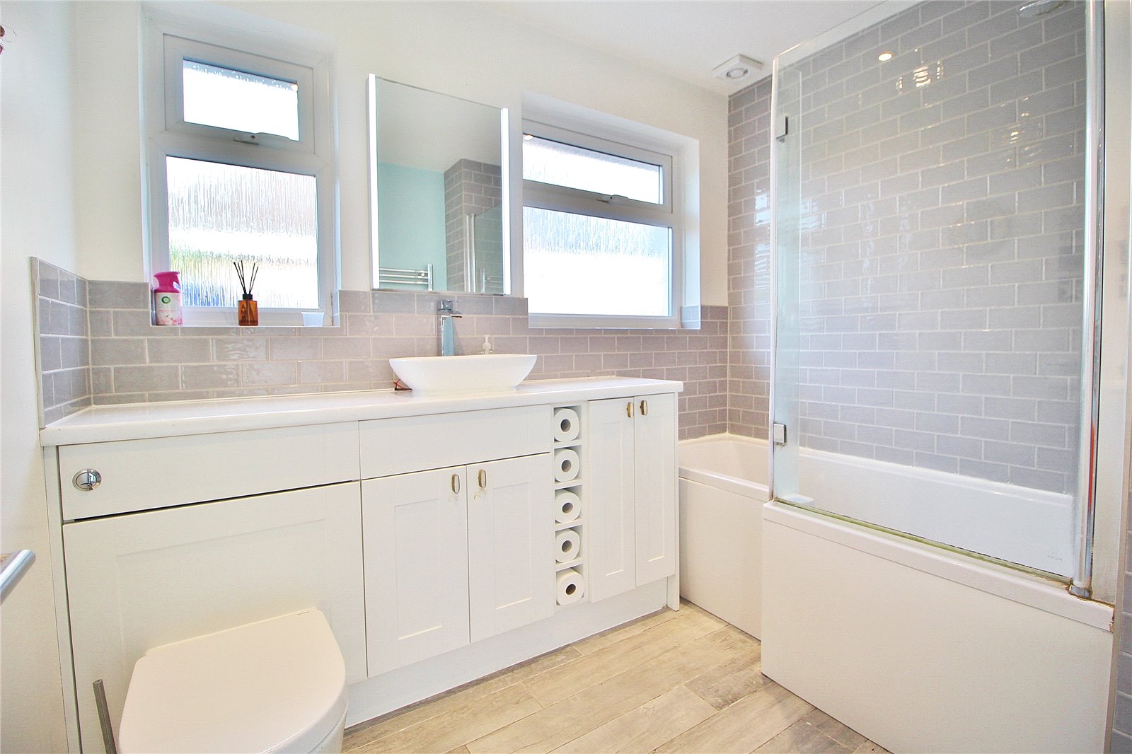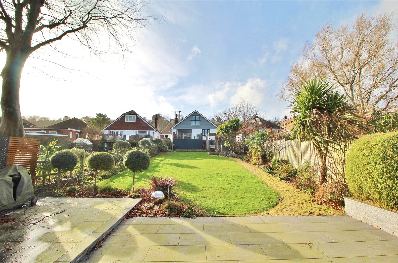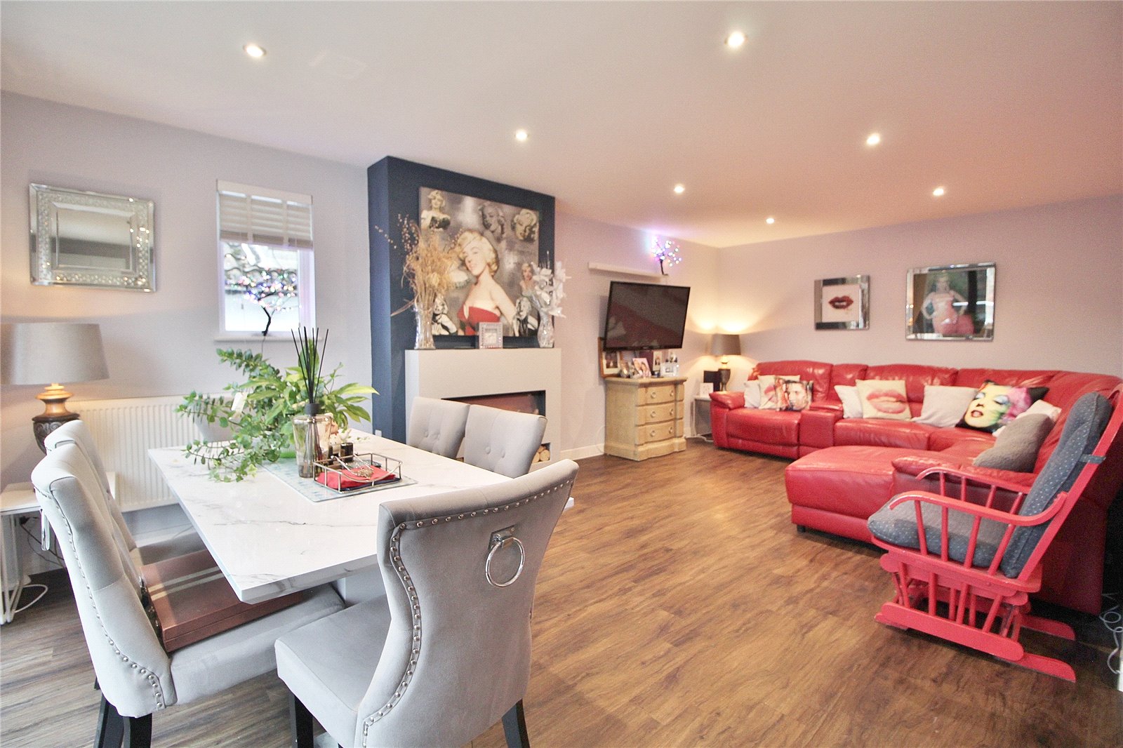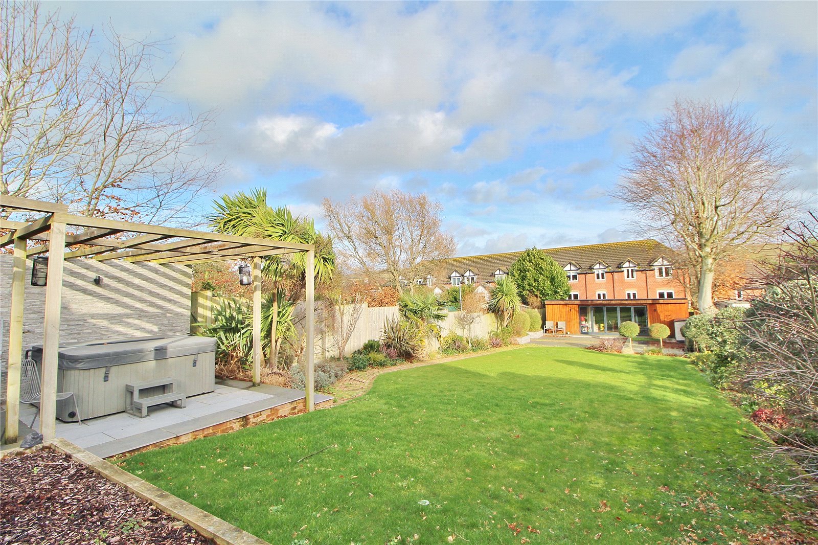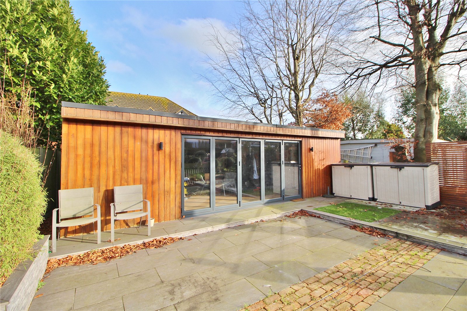 Outside the front garden is mainly paved offering off road parking for several vehicles with side access leading to the feature rear garden with its raised veranda with storage space under, further patio, pergola with hot tub area, good sized lawn area with borders and brick path to stunning entertaining area arranged as large patio and feature cabin measuring 27’ x 15’4 with bar area, under floor heating and west facing bi-fold doors.