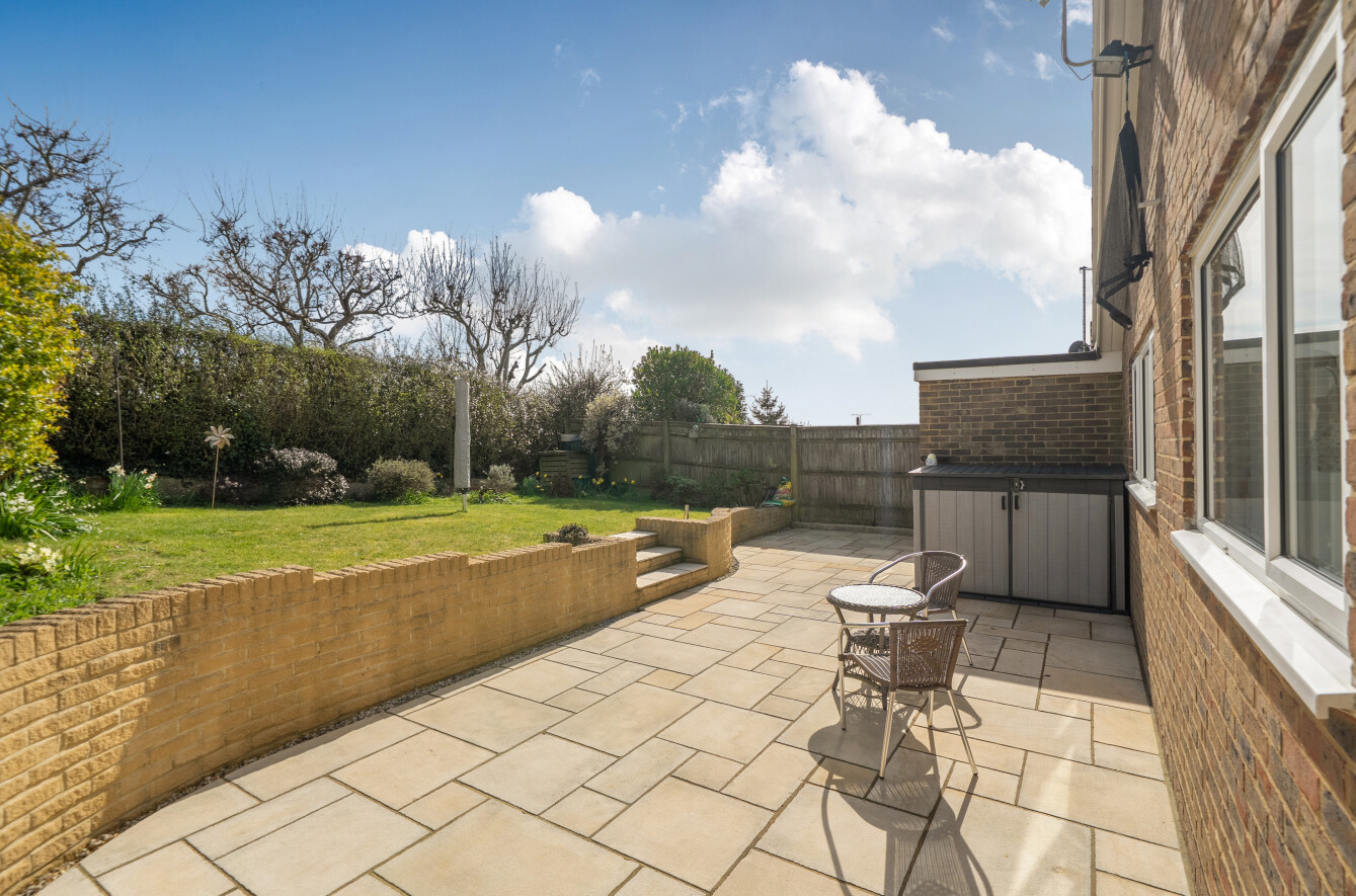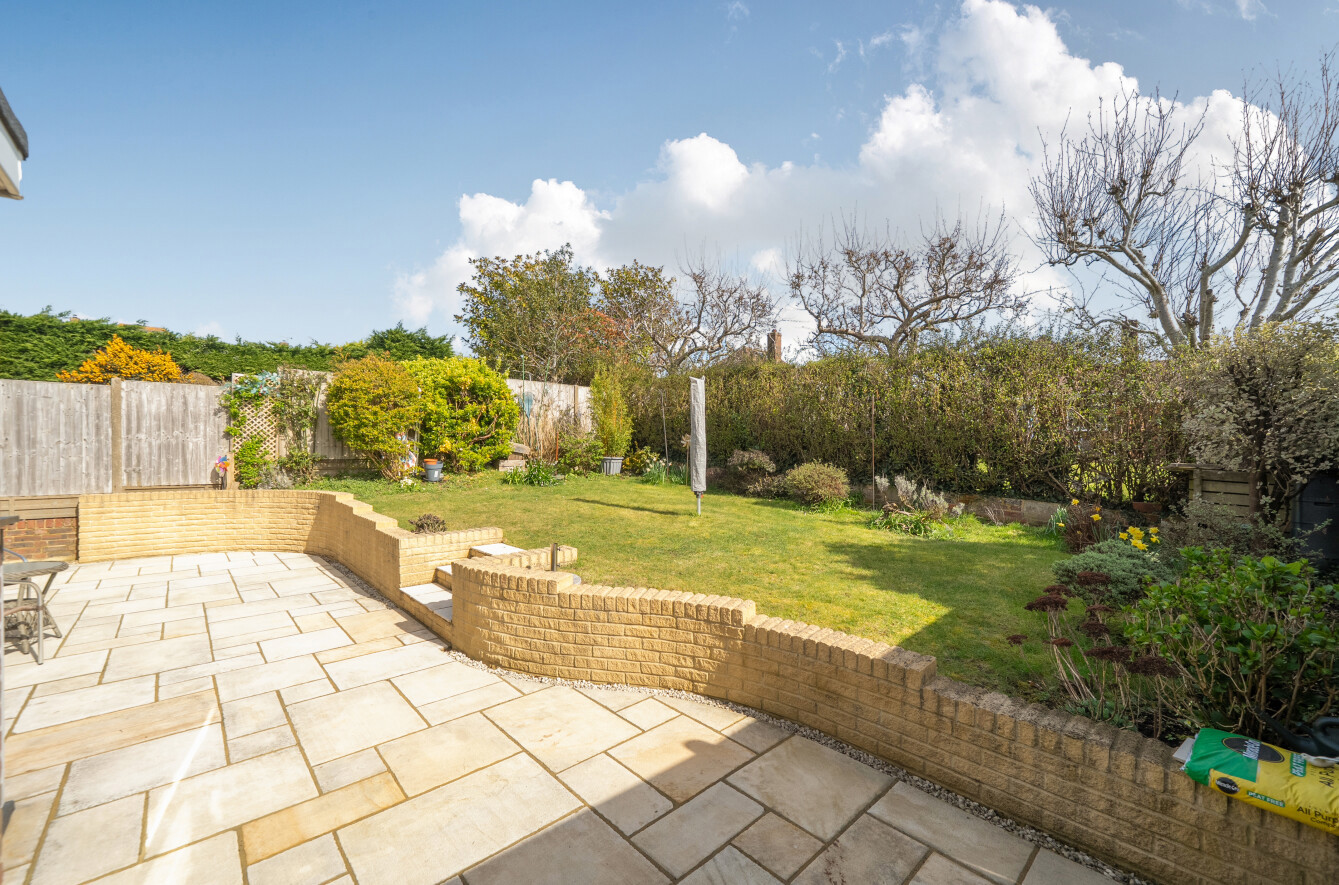 The secluded rear garden is a particular highlight, thoughtfully landscaped with an Indian sandstone patio, curved feature wall, and a well-kept lawn bordered by established planting—creating a private and relaxing outdoor space. Side access is also available.