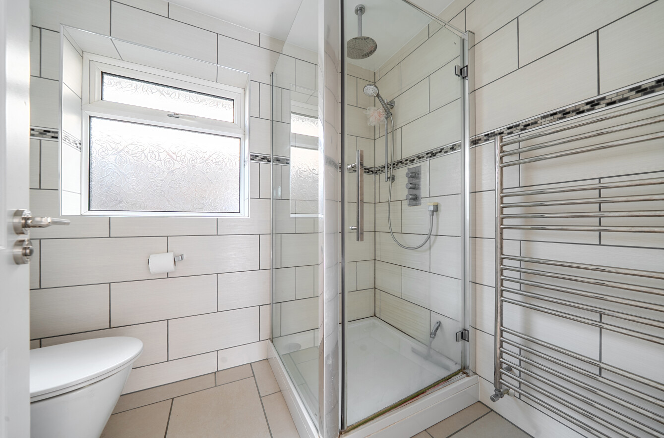 Two of the bedrooms are well-proportioned doubles, with the third bedroom a single room featuring a useful built-in cupboard. The stylish shower room has been finished to an exceptional standard and includes a larger-than-average walk-in shower with both rainfall and power shower options, a concealed WC, and a vanity unit with wash basin. Additional features include a wall-mounted cabinet with automatic lighting and a steam-proof mirror, along with underfloor heating.