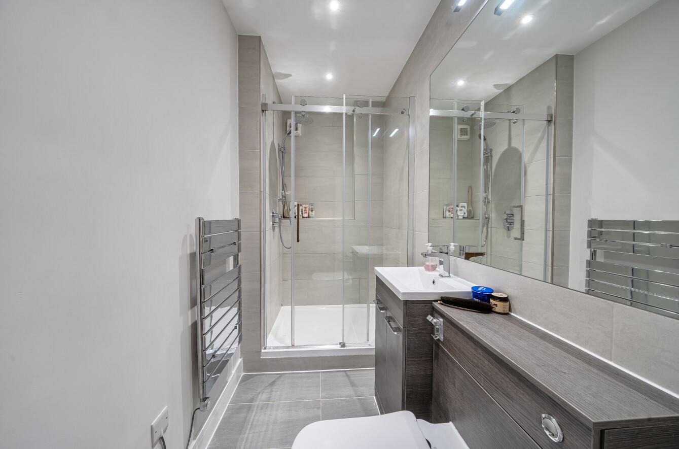 The double bedroom is situated separately from the main living space, creating a peaceful retreat. It offers ample room for bedroom furnishings and benefits from direct access to the modern ensuite shower room, which is well-appointed with contemporary fittings.