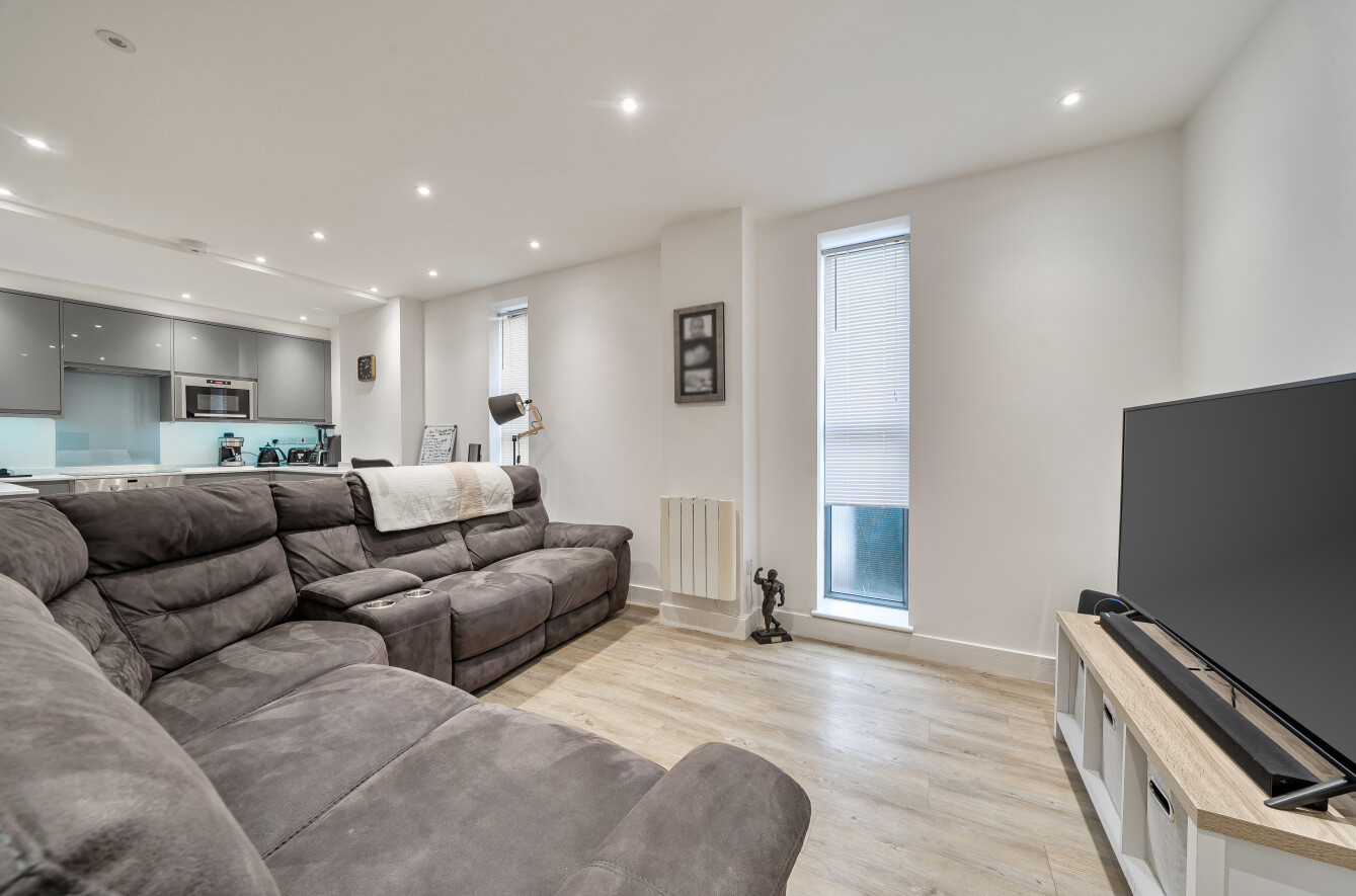 You enter the apartment into a central hallway which provides access to all principal rooms, creating a natural flow throughout the home. The standout feature is the impressive open-plan kitchen/sitting room positioned to the rear of the property. This generous space comfortably accommodates both a defined lounge area and a dining space, making it ideal for relaxing or entertaining. The kitchen is arranged in an L-shape along one side of the room, offering ample worktop space and storage while remaining sociable and connected to the main living area. Double doors open directly onto the private terrace, drawing in natural light and extending the living space outdoors during the warmer months.