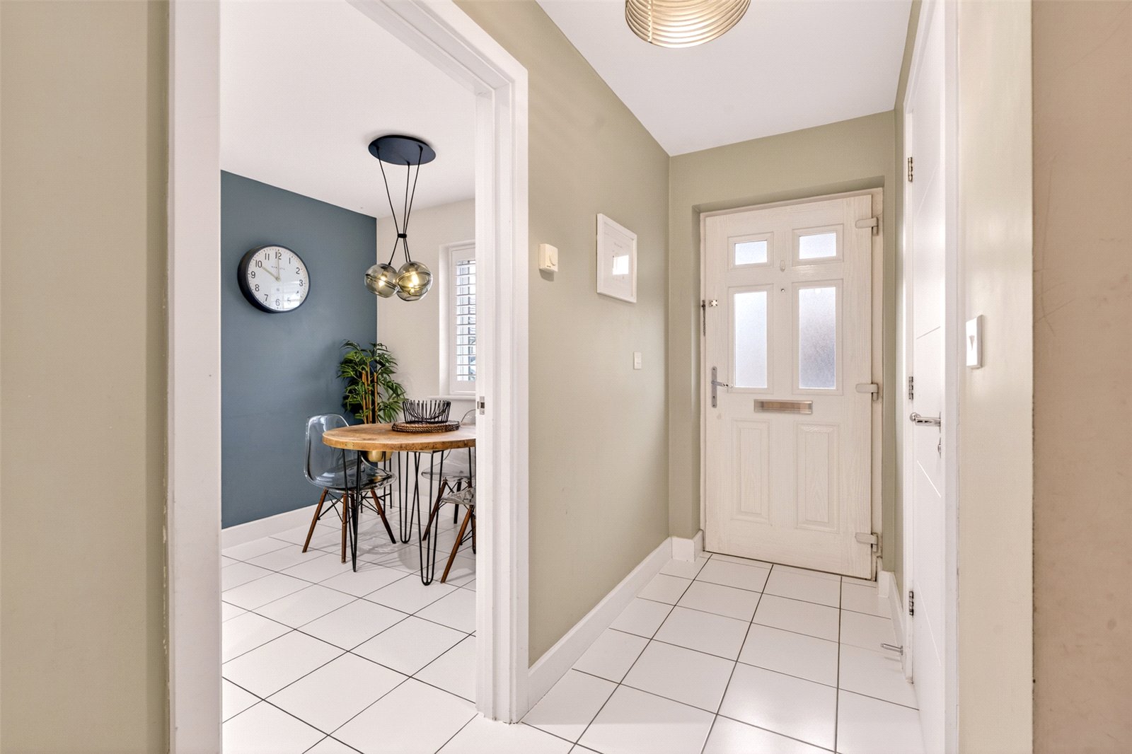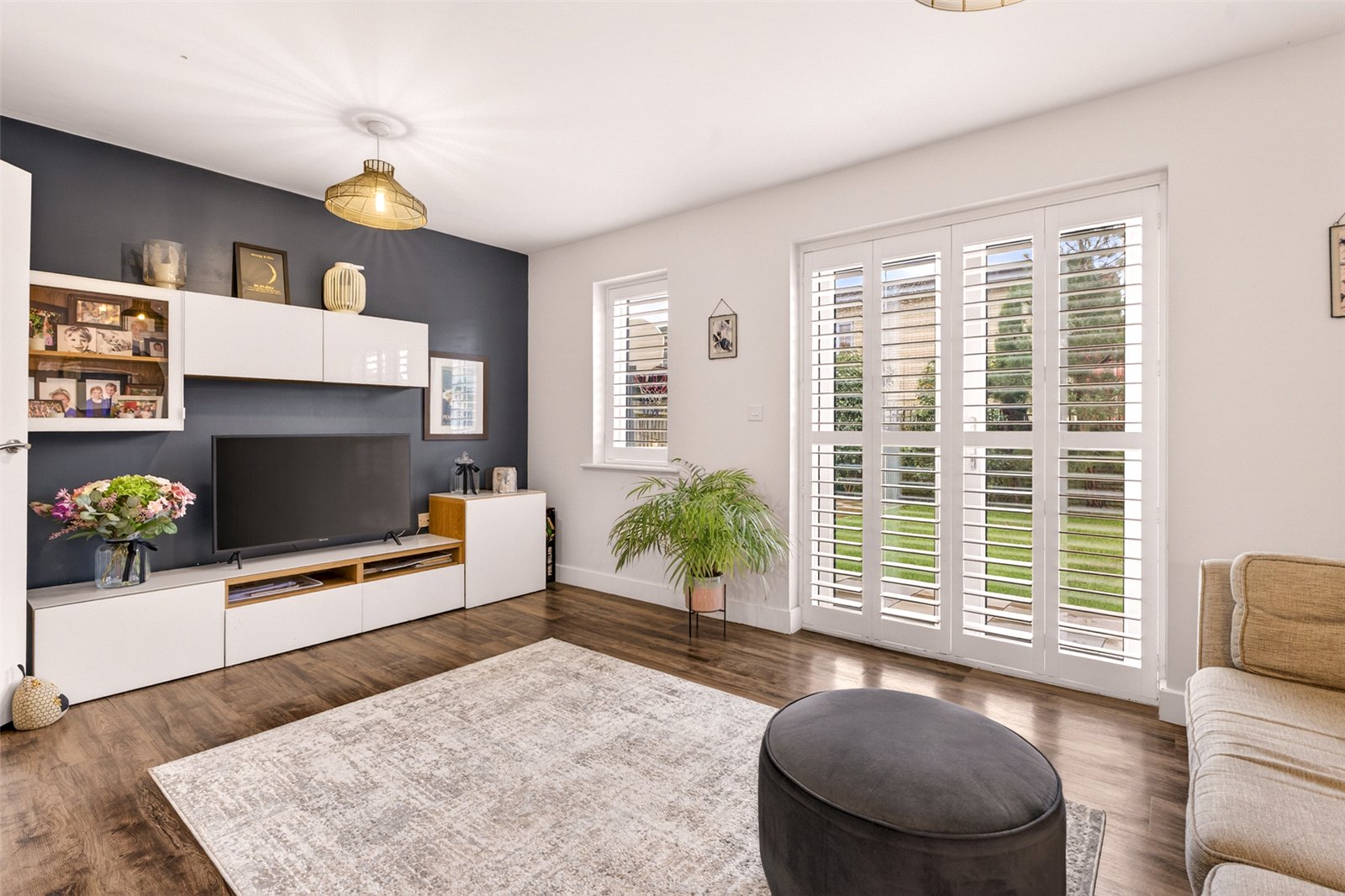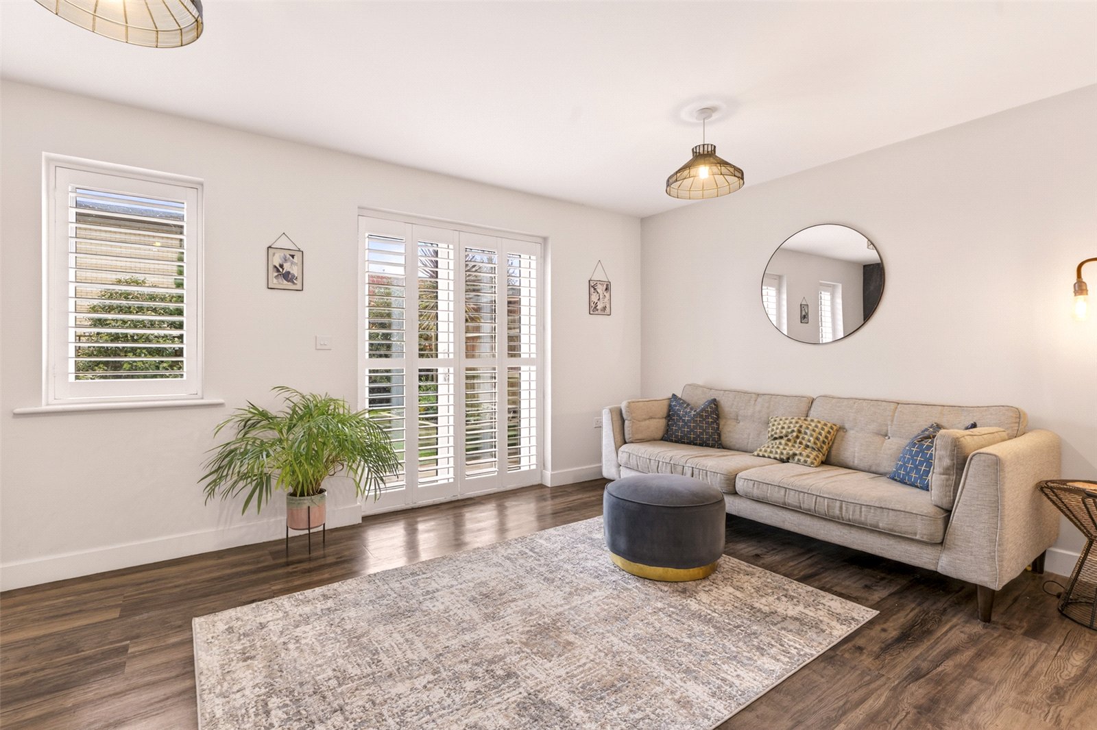 The South facing rear garden which is partly laid to lawn has a good size Lshaped patio area, raised wooden flower/shrub border, full width border to the rear with a range of screening trees, access to the rear of the garage, as well as a fully equipped 8' x 8' cabin with power, light and wifi/broadband. There is also outside lighting and a side access which leads to the front where you will find two visitors car parking spaces along with private off street car parking which leads to the front of the garage.
