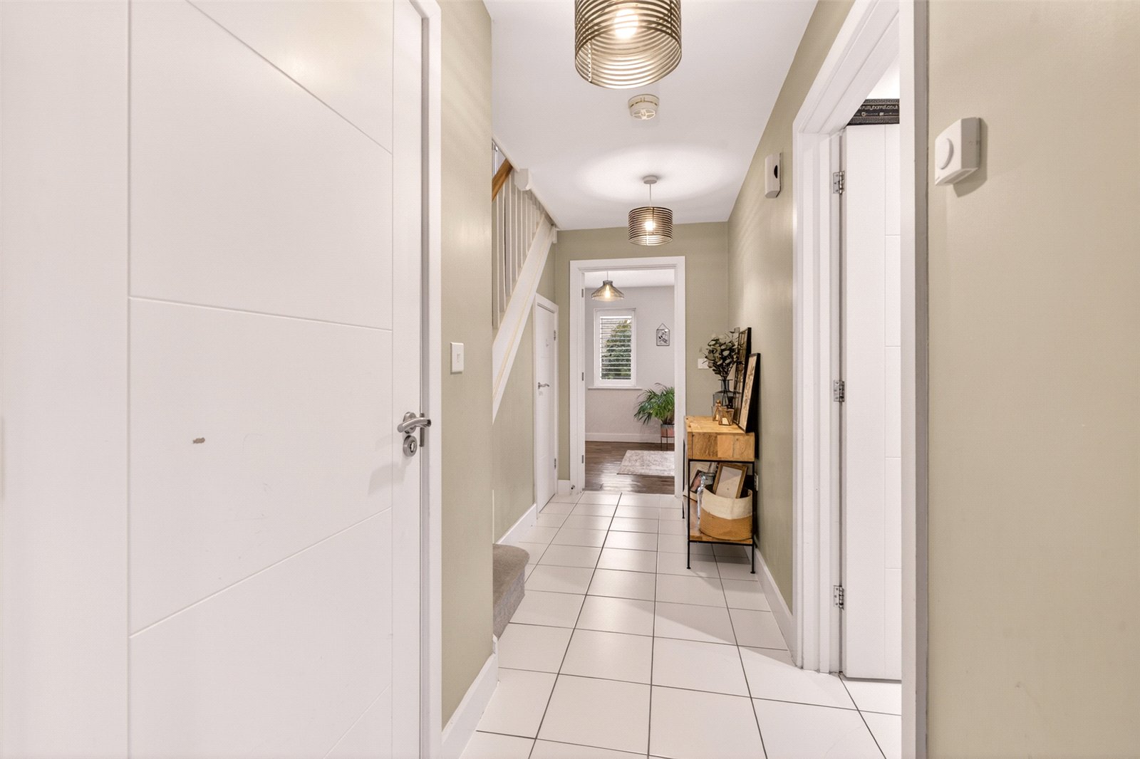 A composite double glazed front door takes you into a very spacious entrance hall with tiled flooring and an understairs storage cupboard. There is also a ground floor cloakroom again having tiled flooring, wash hand basin, low level wc suite and a double glazed window. The modern fitted kitchen/breakfast/dining room is situated to the front of the house having tiled flooring, a good range of work tops with cupboards and drawers below, eye level cupboards, integrated fridge/freezer, plumbing for a washing machine, fitted Bosch double oven and hob, double glazed window and space for a table and chairs. A good size South facing lounge with Karndean flooring can be found to the rear of the property having a double glazed window and double glazed doors leading out to the rear garden.