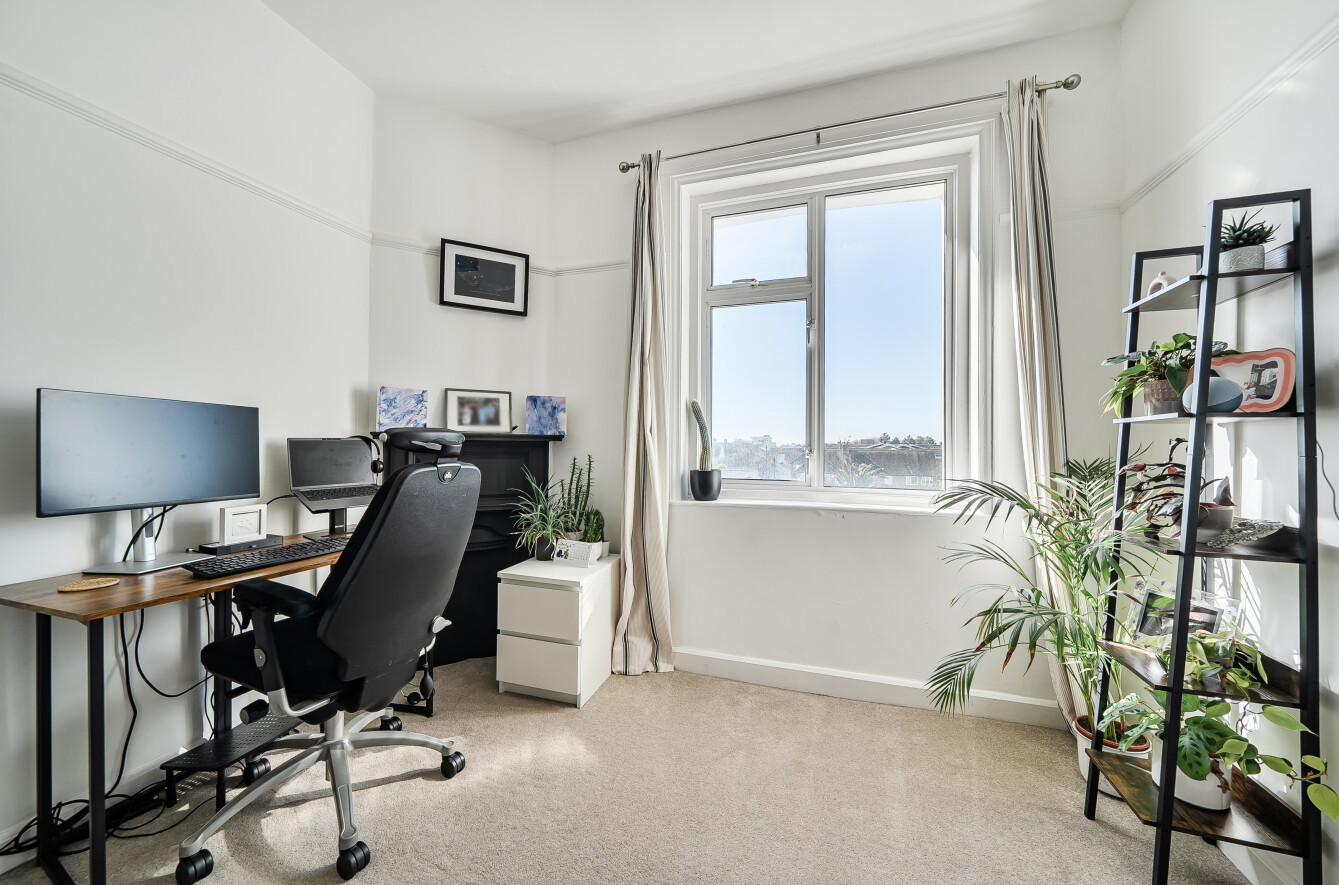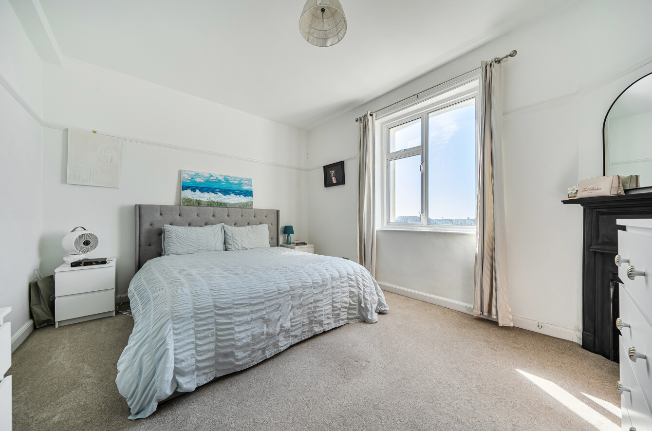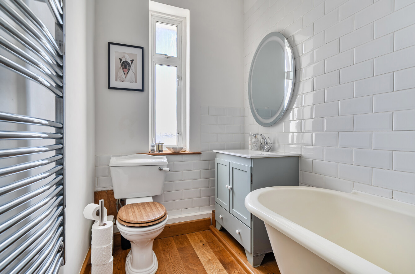 The generously sized kitchen is fitted with a range of units and includes space and plumbing for appliances. There are two well-proportioned double bedrooms, both featuring fireplaces, while the large living room enjoys impressive views. Completing the internal space is a beautifully refitted bathroom/WC, showcasing a charming period-style suite, including a ball-and-claw foot roll-top bath.