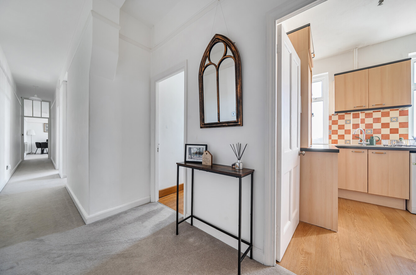 The accommodation comprises a secure communal entrance with an elegant reception area, along with stairs and a lift providing access to the second floor. The apartment’s private front door, conveniently located close to the lift, opens into a spacious open-plan reception hall, featuring a wall-mounted entry-phone system and a useful deep walk-in storage cupboard.