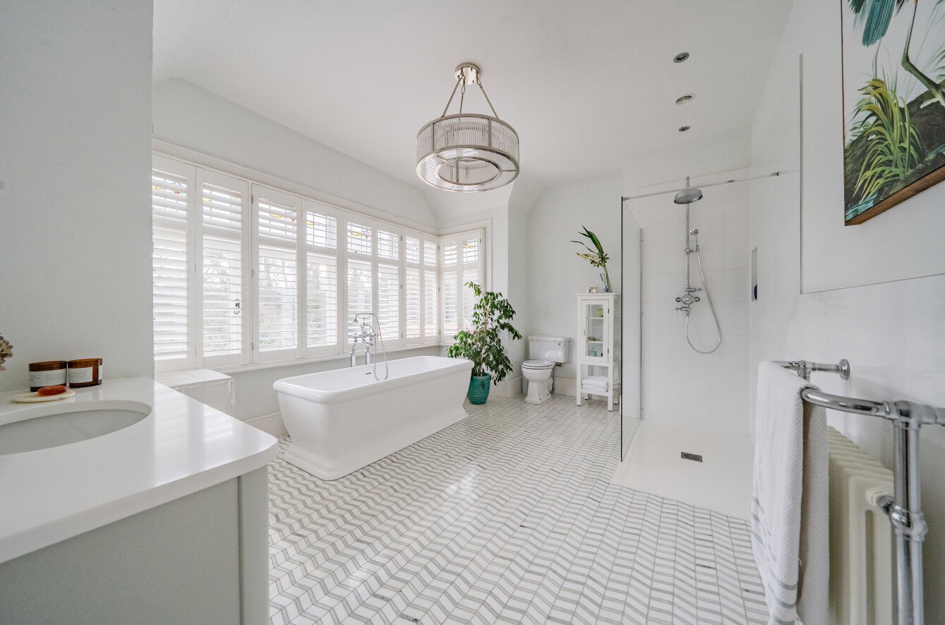 On the first floor there is a landing with a staircase leading up to the generous sized unfinished loft room fitted with plumbing ready for an en-suite. The principal bedroom is an exceptional size with a corner bay window, a door to a balcony overlooking the garden and a sumptuous, luxurious en-suite bathroom. The three further bedrooms are served by an en-suite shower and a separate bathroom. Outside, the driveway allows off road parking for several vehicles and gates open to a useful covered area found on the right.