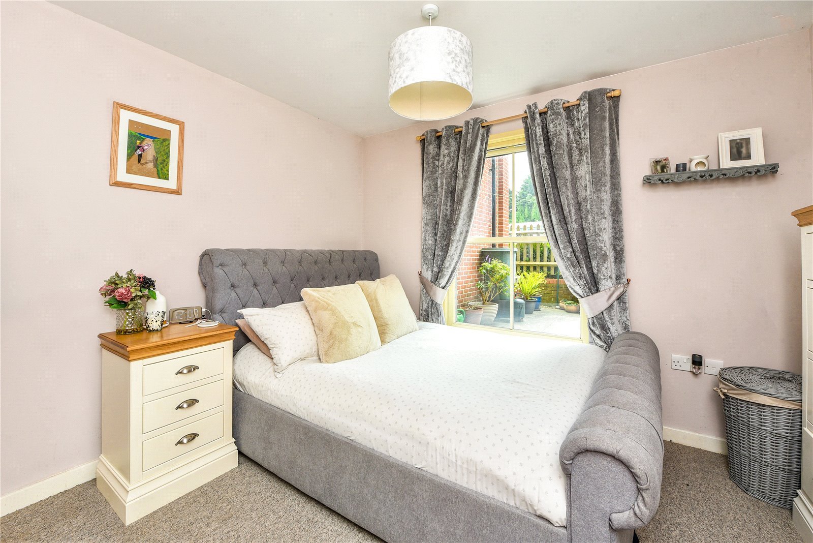 The front door opens into a welcoming hallway, leading to a bright bedroom with a built-in double wardrobe, a radiator, and a double-glazed window overlooking the communal garden. The open-plan sitting/dining room features patio doors that flow out to the garden, creating a seamless indoor-outdoor feel. The modern kitchen is fitted with a range of eye and floor-level units, an inset single drainer sink, an electric oven and a gas hob. There's also space for a washing machine and a fridge freezer. The bathroom is finished to a contemporary standard, featuring a panel-enclosed bath, a pedestal washbasin, and a WC.