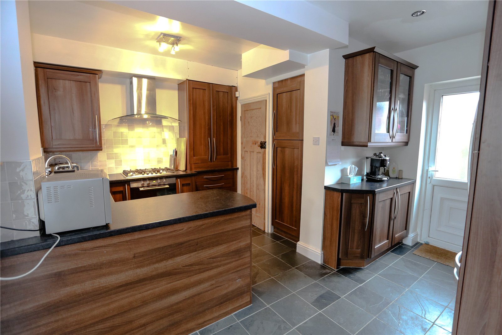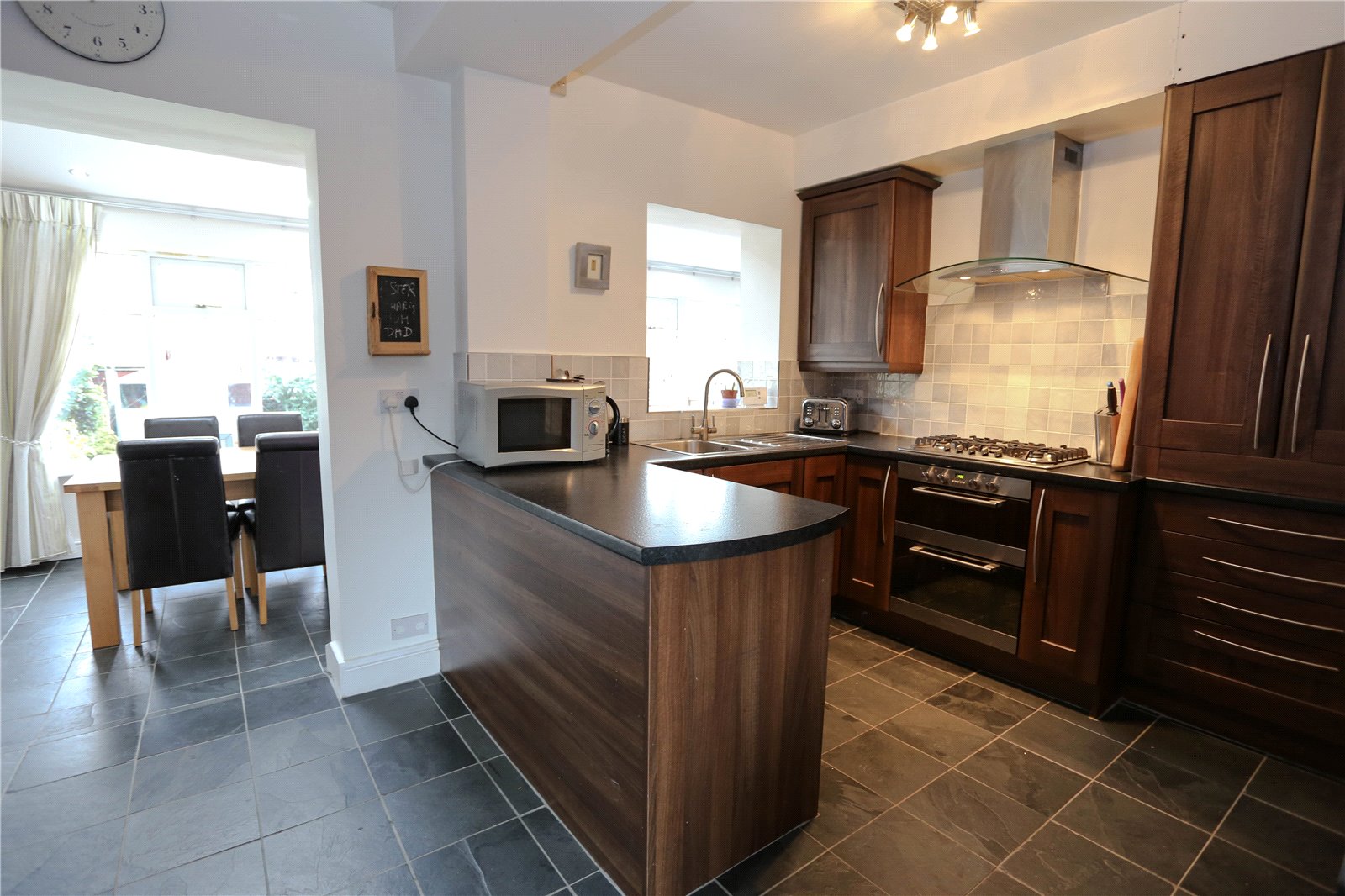 The modern fitted kitchen complements the space beautifully, providing a practical and stylish area for cooking while remaining connected to the living and dining zones.