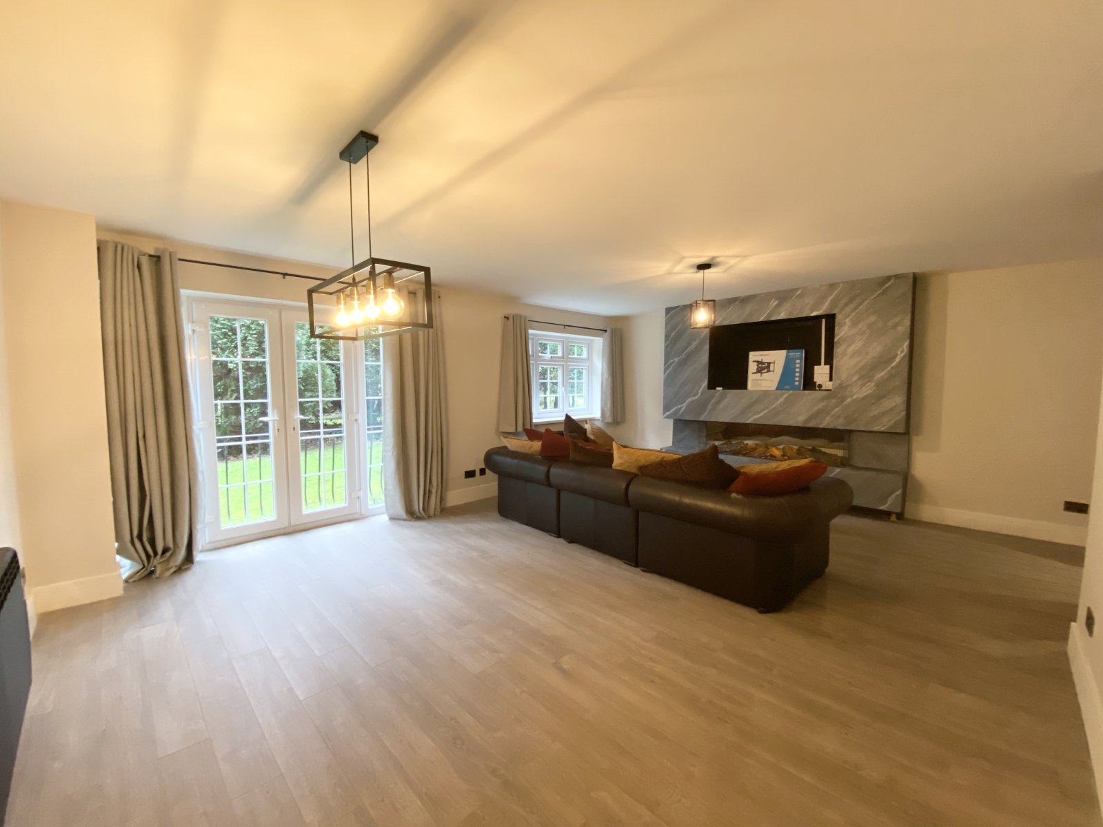 The property is accessed via an inviting communal entrance that leads into a welcoming private hallway. From here, double doors open into an impressive living space measuring approximately 20ft by 17ft, creating a striking first impression. This beautifully proportioned room provides generous space for freestanding furniture and is enhanced by a stylish media feature wall, offering a contemporary focal point. A Juliet balcony overlooks the well-maintained communal gardens, allowing natural light to flood the room and providing a pleasant outlook. Flowing seamlessly from the living area, the open-plan dining and kitchen space forms the true centrepiece of the home, perfectly suited to both everyday living and entertaining.