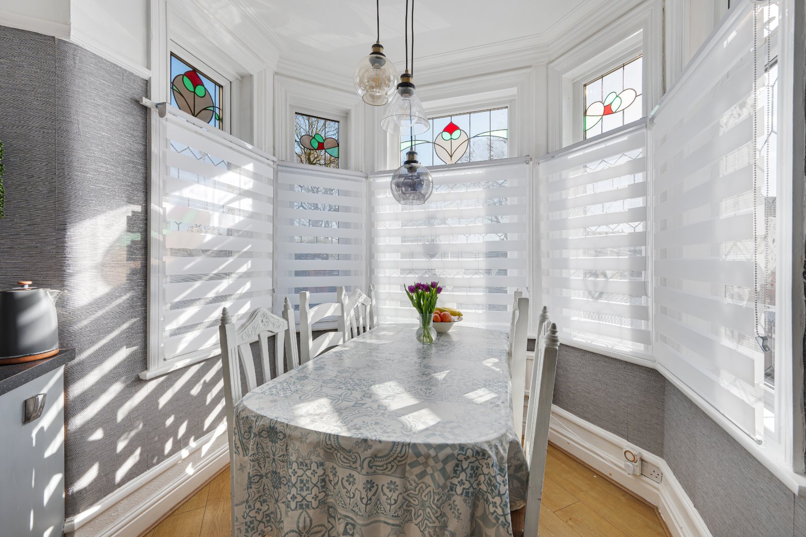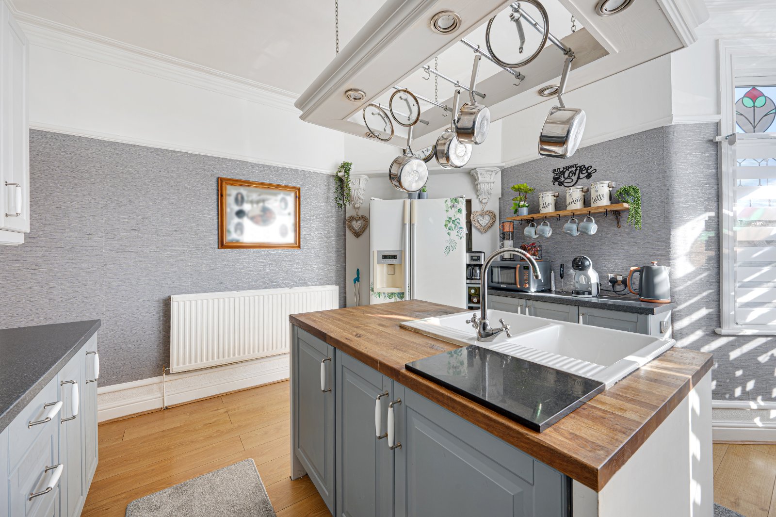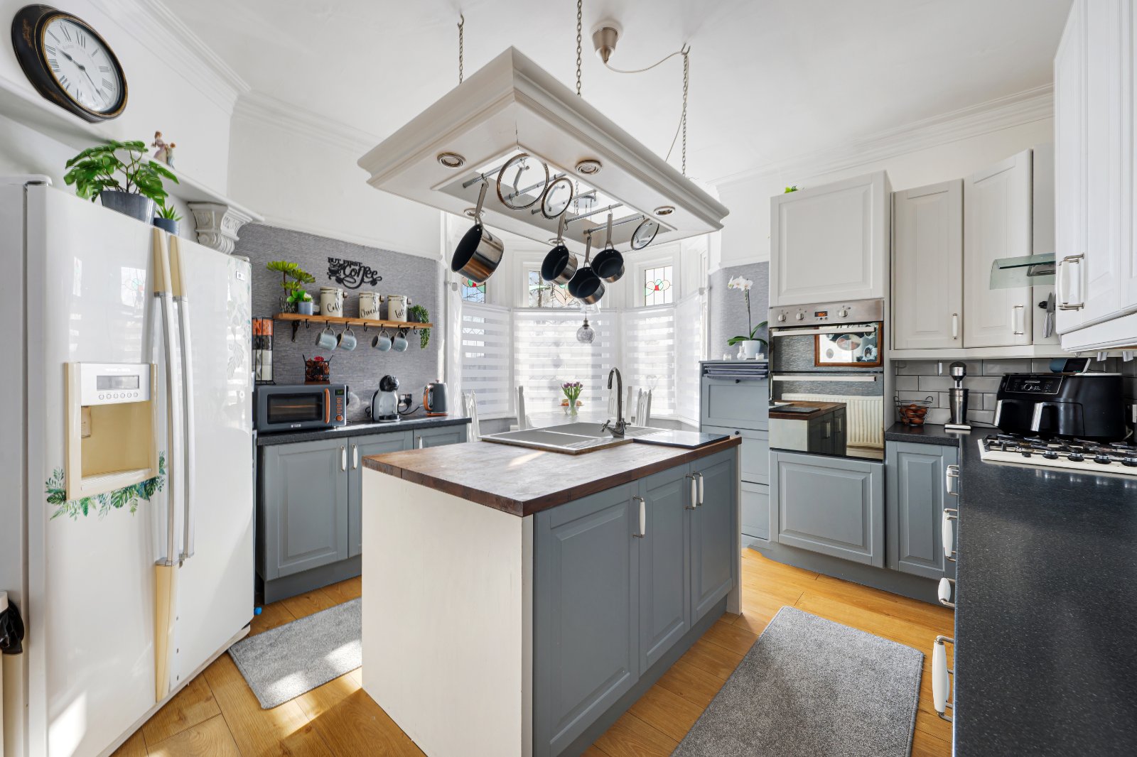 The home features a welcoming entrance hall that leads into a stylish, modern kitchen complete with dual aspect bay windows, integrated appliances, a convenient central island and plenty of storage and countertop space. The adjacent dining area is bathed in natural light, creating a bright and inviting space for family meals.
