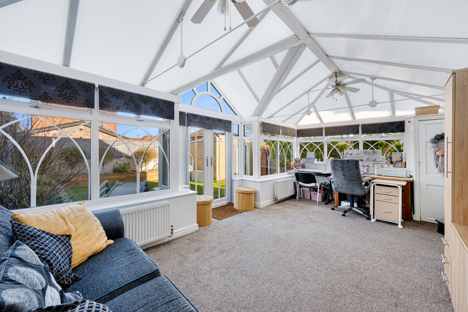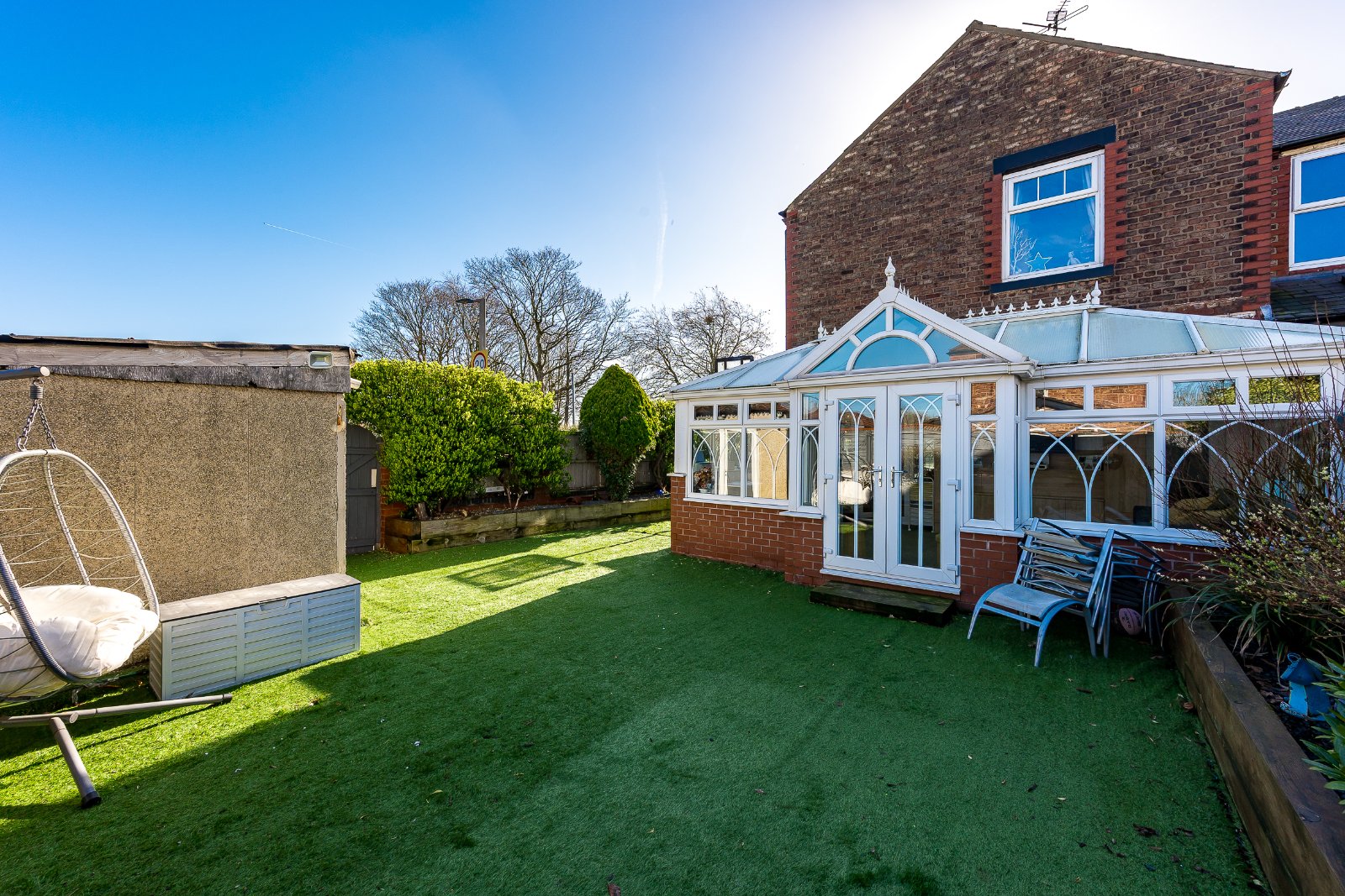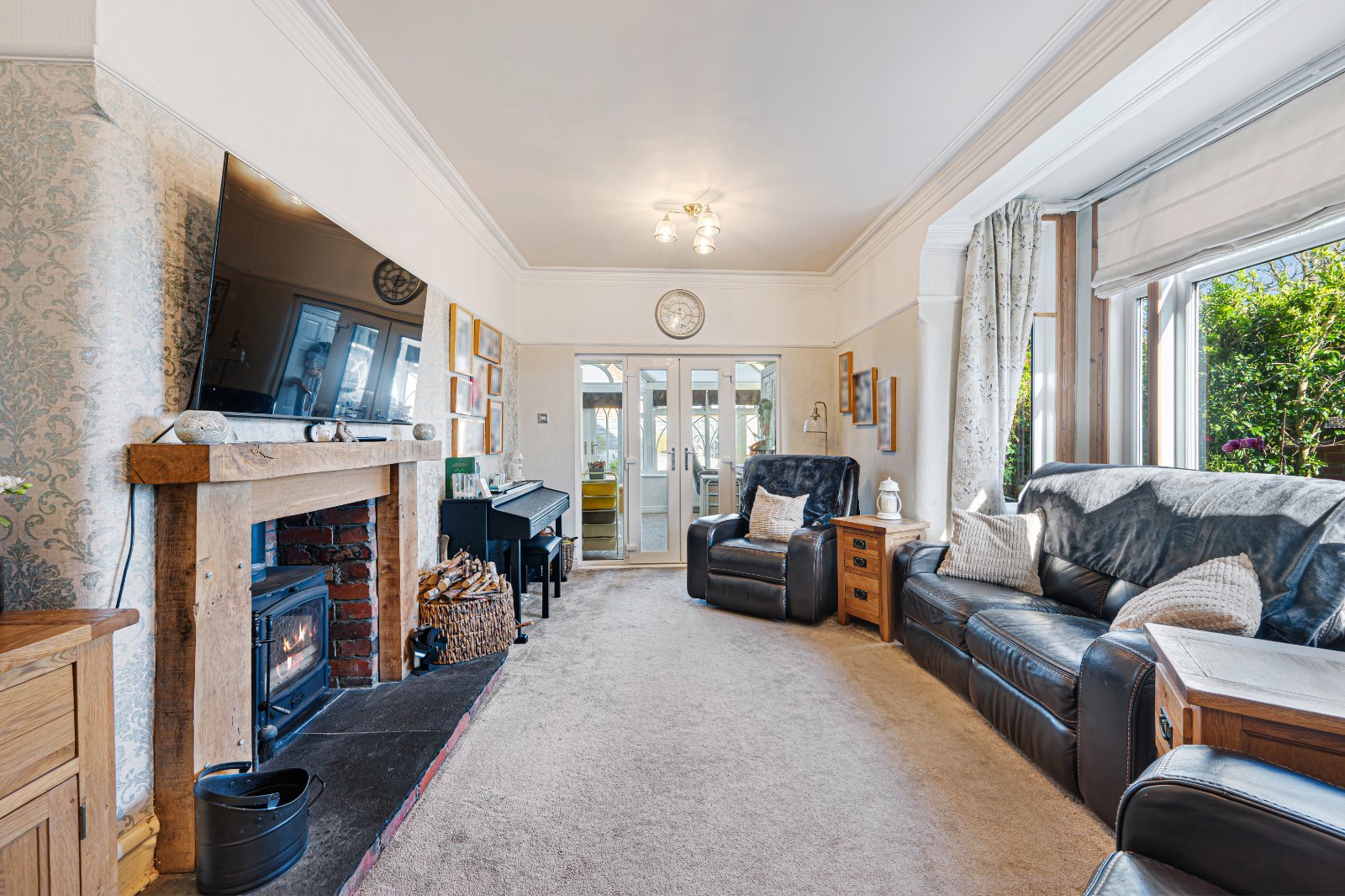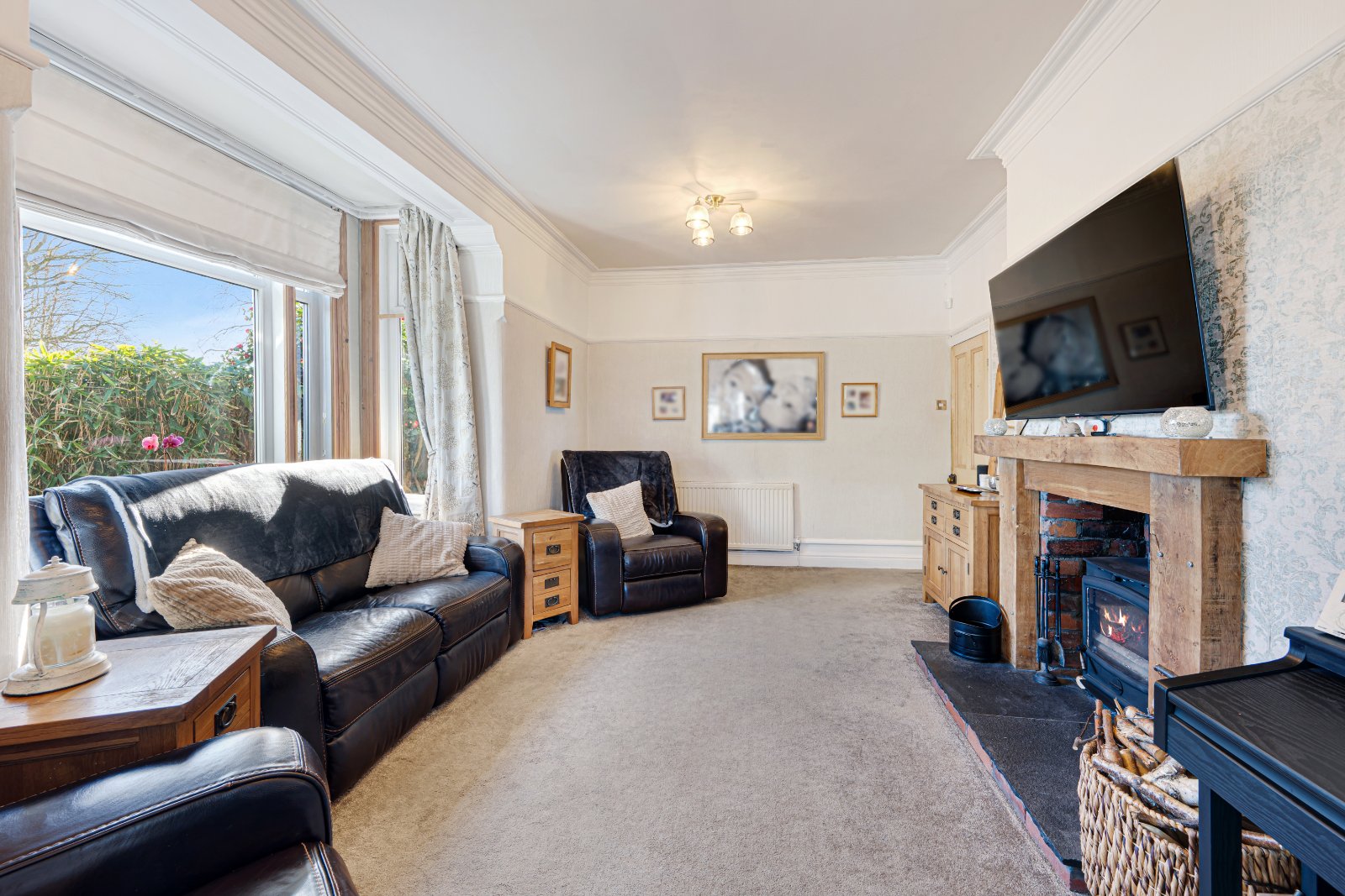 The spacious, bay fronted lounge offers abundant natural light and a charming log burner fireplace, perfect for cozy evenings. Beyond the lounge, is the large open conservatory providing additional living space and features french doors opening onto a private, low maintenance garden, ideal for relaxing or entertaining. The ground floor also benefits from a convenient downstairs WC and a separate laundry room, both offering ample storage.