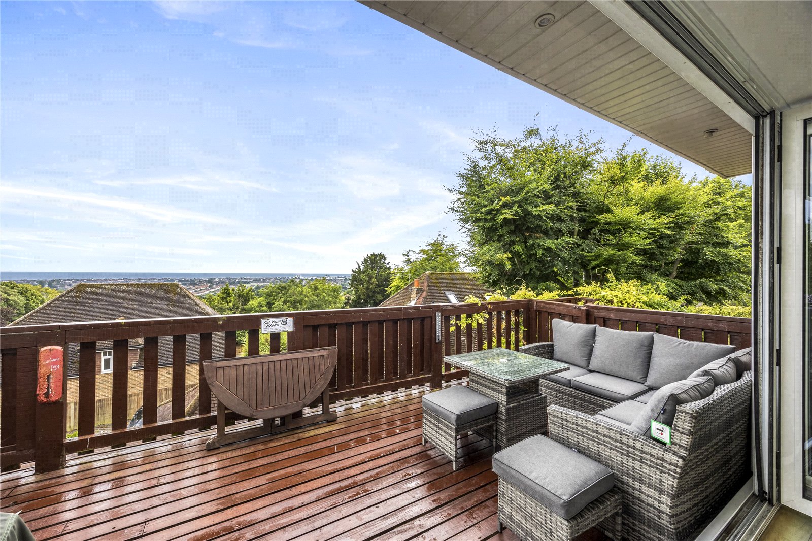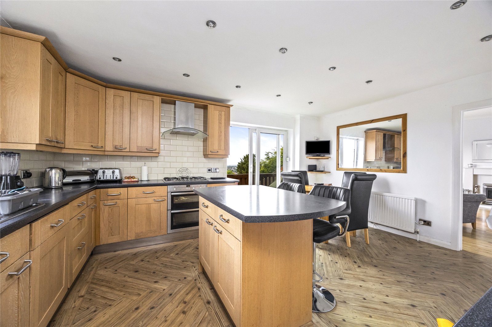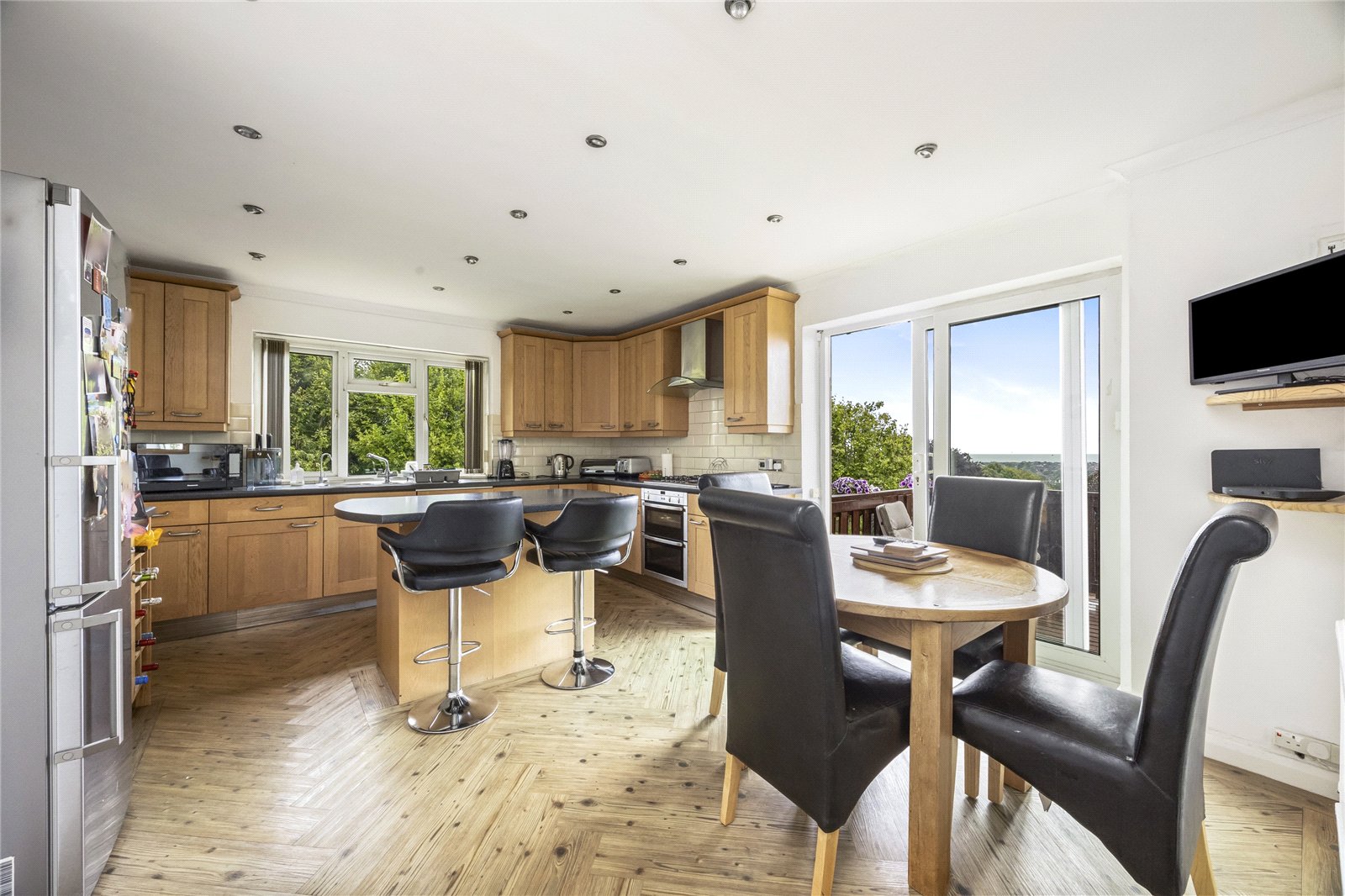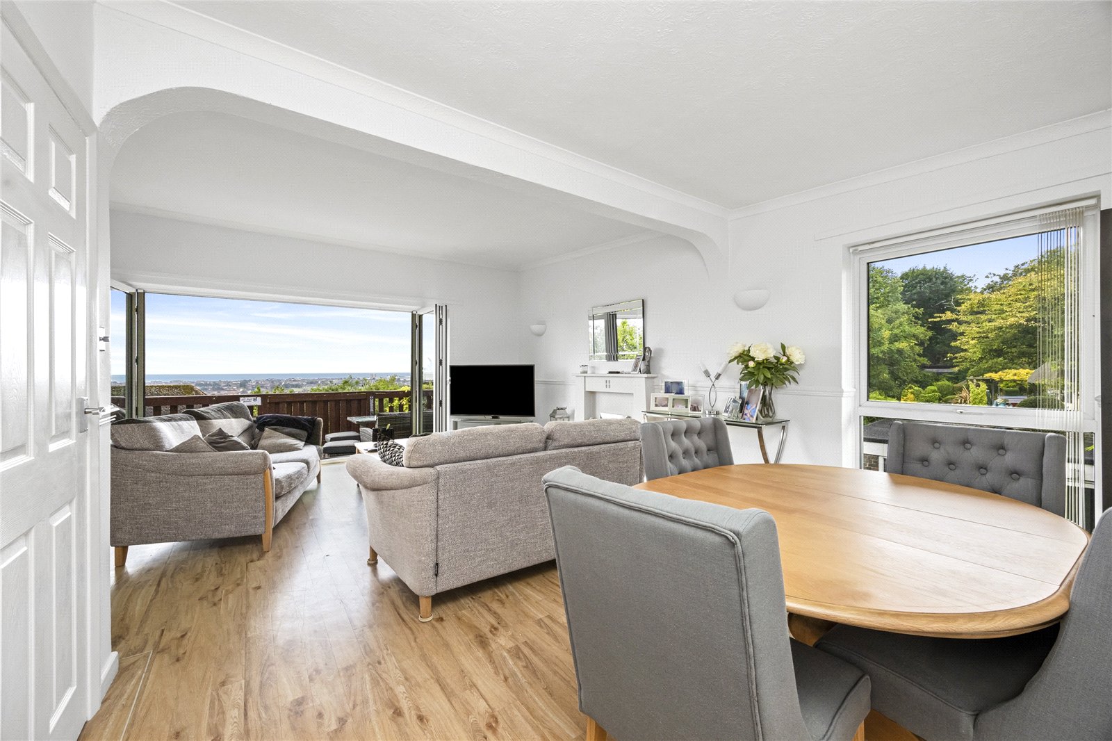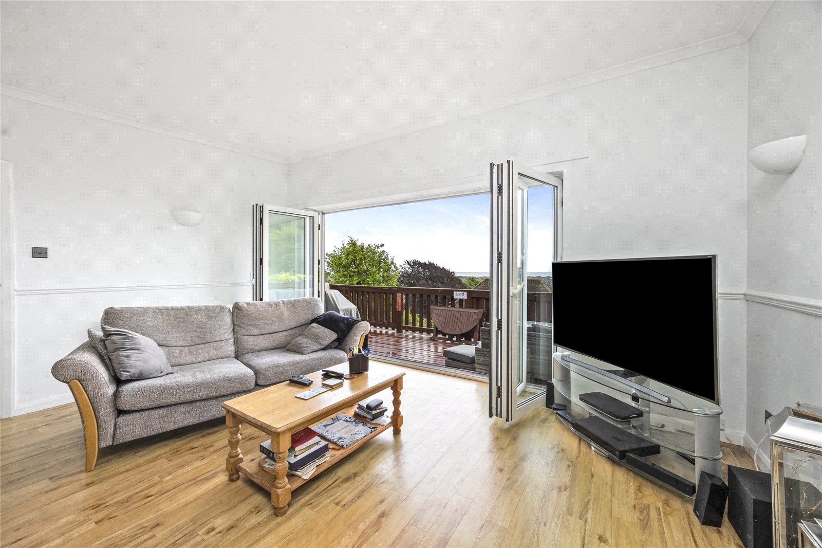 At the heart of the home is an open planned kitchen diner, beautifully designed for modern living. This bright and sociable space opens out onto a westerly-facing balcony, offering breathtaking panoramic sea views and the perfect spot to enjoy sunsets over the coast. Ideal for entertaining or unwinding after a long day, this main living area brings together functionality and coastal charm in a truly special way.