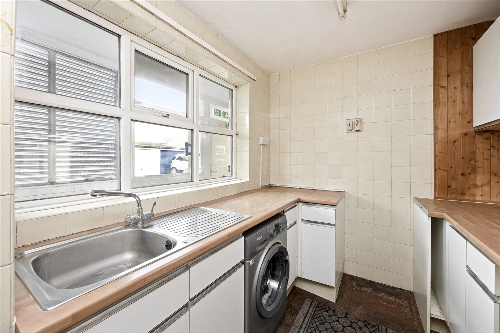 Inside, the apartment features a spacious living and dining area, designed to accommodate a variety of furniture layouts. The large windows allow plenty of natural light into the living space. Both bedrooms are generously sized, offering sufficient room for storage. While the flat is functional as is, it would benefit from some personalisation and modernisation to suit individual tastes, allowing you to make it your own.