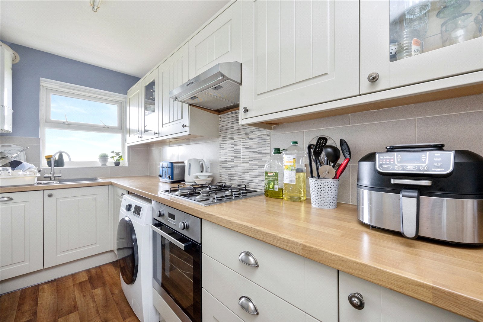 The spacious open-plan living and dining room is flooded with natural light, creating an inviting space to relax or entertain guests. The contemporary style kitchen is thoughtfully integrated into the layout, offering ample storage. Whether you're hosting friends or enjoying a quiet evening in, this versatile area truly is the heart of the home.