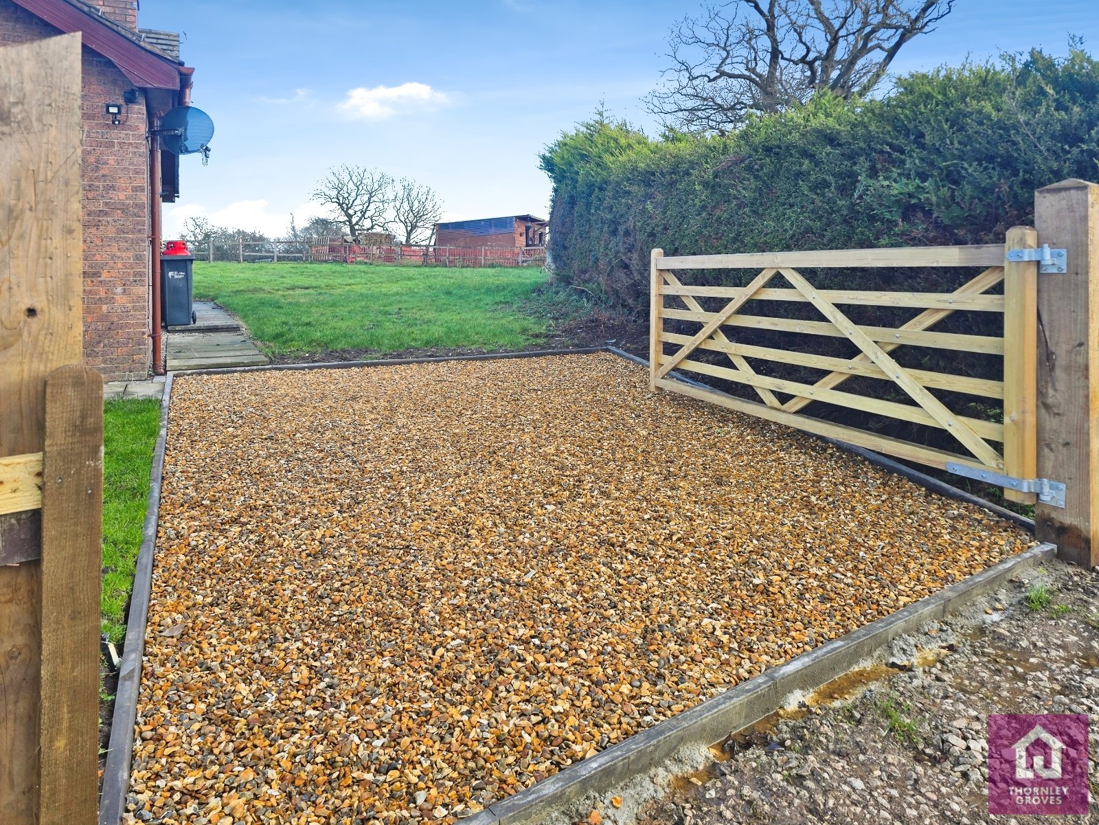 Externally, the property benefits from a new pebble driveway with gated access, along with additional visitor parking to the front. The large rear garden enjoys a rural backdrop, where horses can be seen grazing behind the property, enhancing the sense of privacy and countryside living. The property is served by LPG gas.