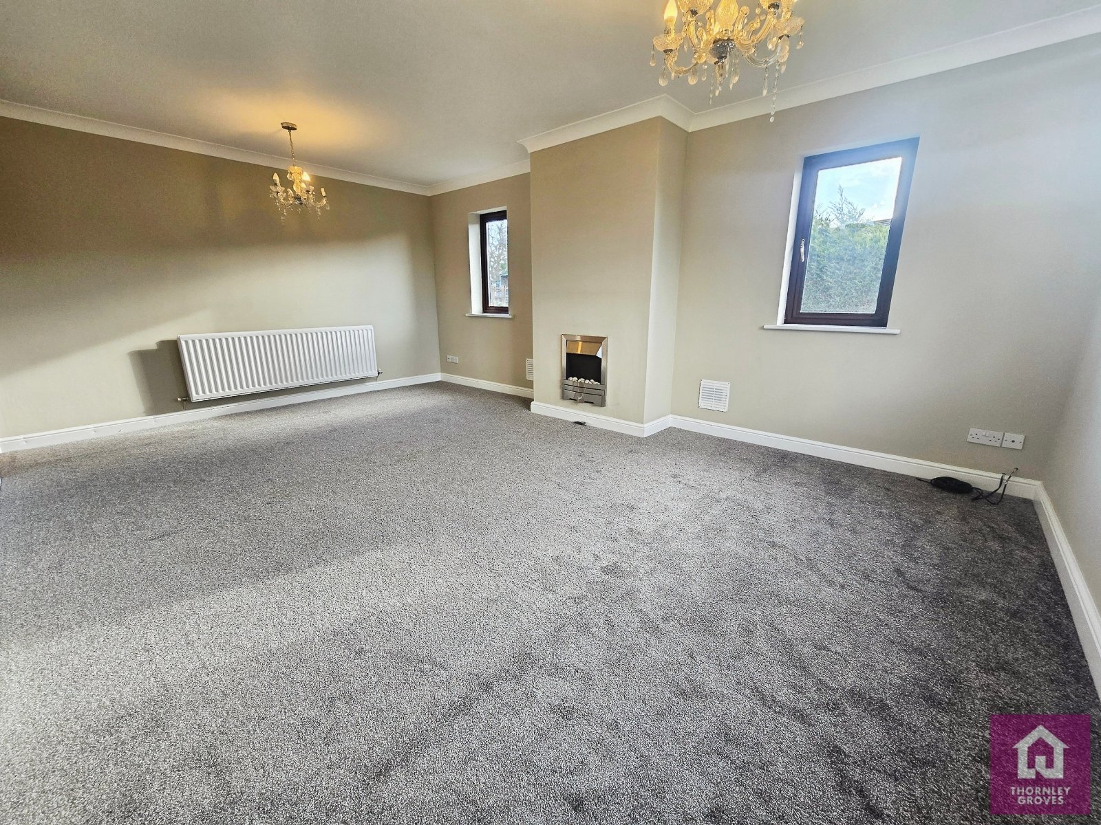 The accommodation is arranged entirely on one level and begins with a welcoming entrance hallway featuring two large storage cupboards, providing excellent practicality from the outset. The lounge is a generous space with dual-aspect windows and an electric fireplace, creating a comfortable and well-lit living area.